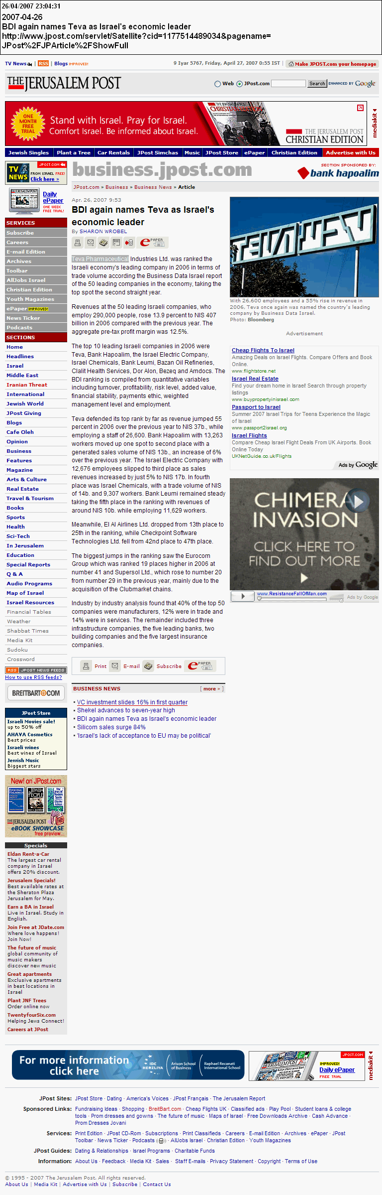 Sharon Wrobel, The Jerusalem Post 26 April 2007  Teva Pharmaceutical Industries Ltd