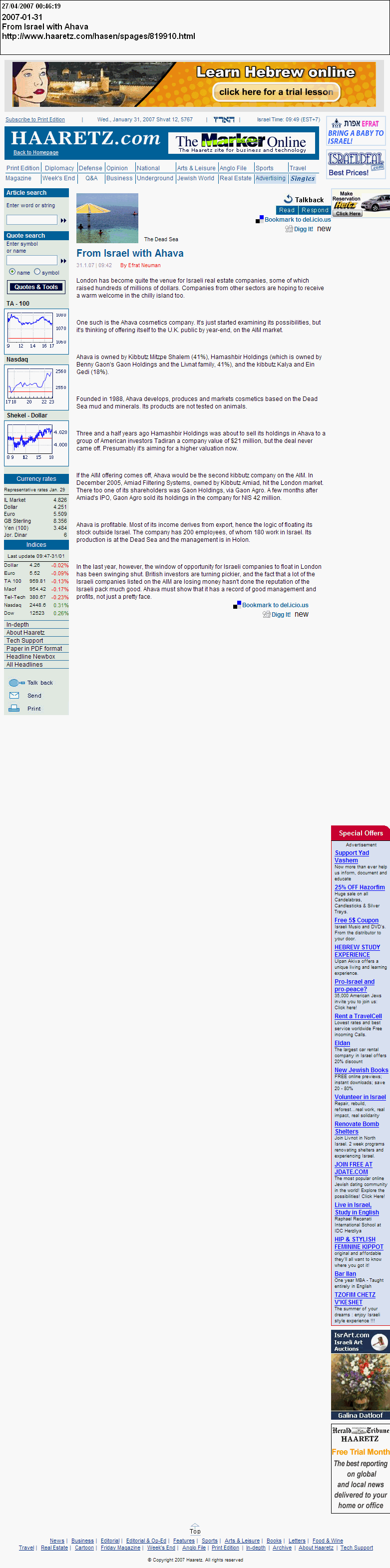 Ahava is profitable. Most of its income derives from export, hence the logic of floating its stock outside Israel. The company has 200 employees, of whom 180 work in Israel. Its production is at the Dead Sea and the management is in Holon.