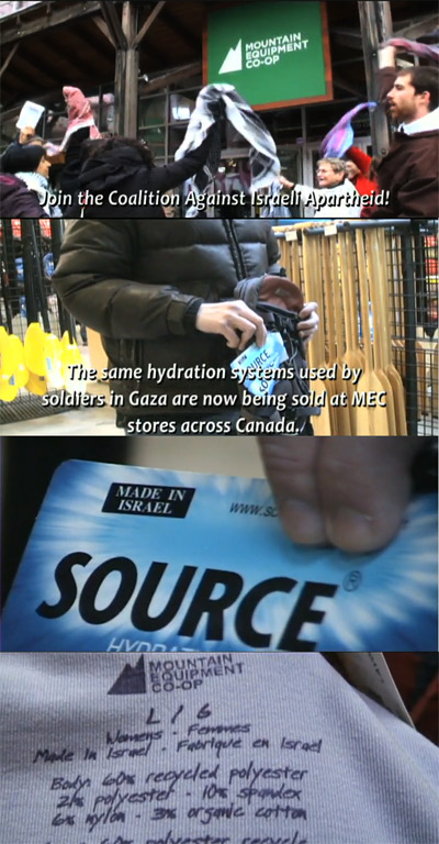 Mountain Equipment Coop (MEC) prides itself on its ‘ethical sourcing policy’. Many MEC members are committed to the environment and social justice and want their cooperative to behave in a responsible, ethical manner. Across the country, members were shocked and outraged to discover that MEC, despite its ethical sourcing policy, is doing business with Israeli Apartheid. They carry over 30 Israeli products, including equipment manufactured by Source Vagabond, an Israeli military contractor. The same hydration packs used by soldiers in Gaza are being sold at MEC stores in Canada. MEC members are demanding that MEC live up to its own policies and drop all Israeli products immediately.