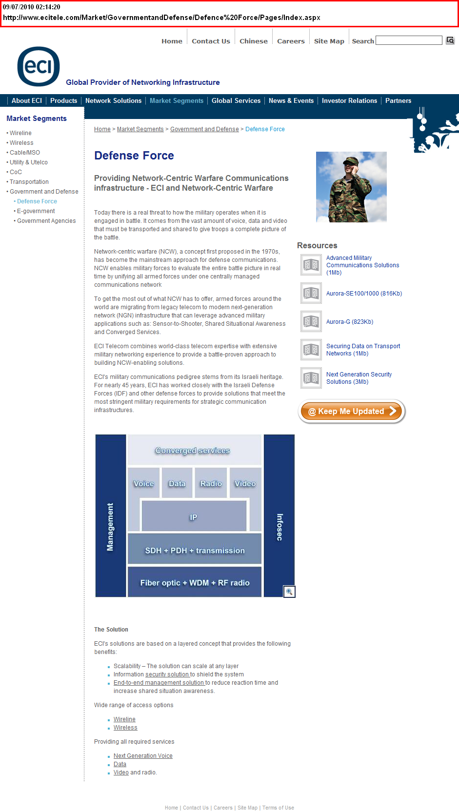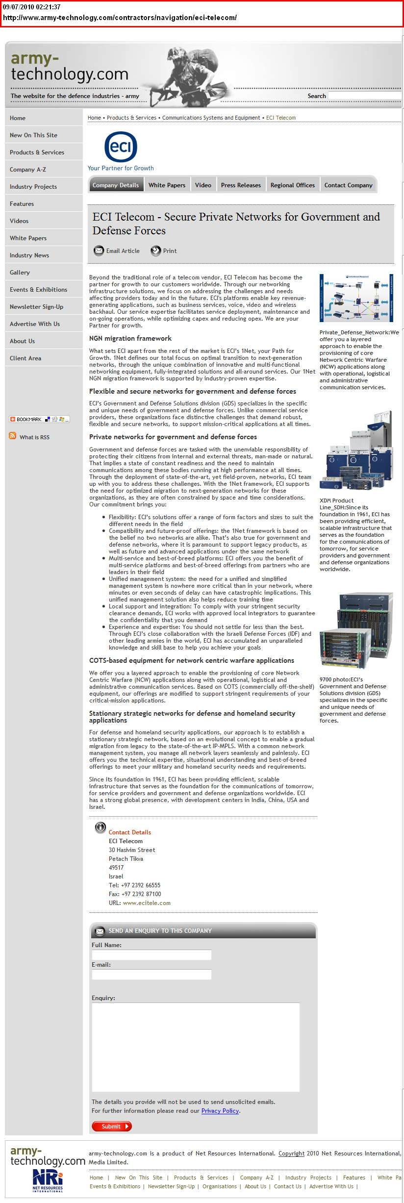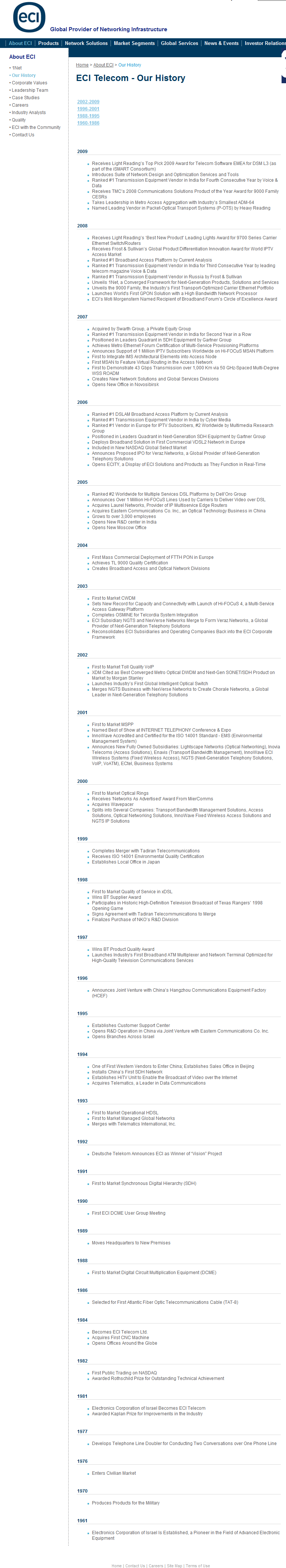 ECI has from its inception been a military contractor for the Israeli Army, as its website testifies: "ECI's military communications pedigree stems from its Israeli heritage. For nearly 45 years, ECI has worked closely with the Israeli Defense Forces (IDF) and other defense forces to provide solutions that meet the most stringent military requirements for strategic communication infrastructures." ECI is "the IDF’s leading telecommunications vendor".They help underpin Israels occupation by providing the IDF with its network infrastructure linking their military bases, and providing border security networks.
