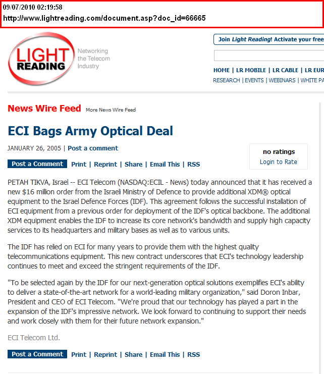 When EDI was selected by the IDF in 2005 to provide additional optical backbone for its military bases in a $16 million deal, ECI President and CEO Doron Inbar said: "To be selected again by the IDF for our next-generation optical solutions exemplifies ECI's ability to deliver a state-of-the-art network for a world-leading military organization. We're proud that our technology has played a part in the expansion of the IDF's impressive network. We look forward to continuing to support their needs and work closely with them for their future network expansion."