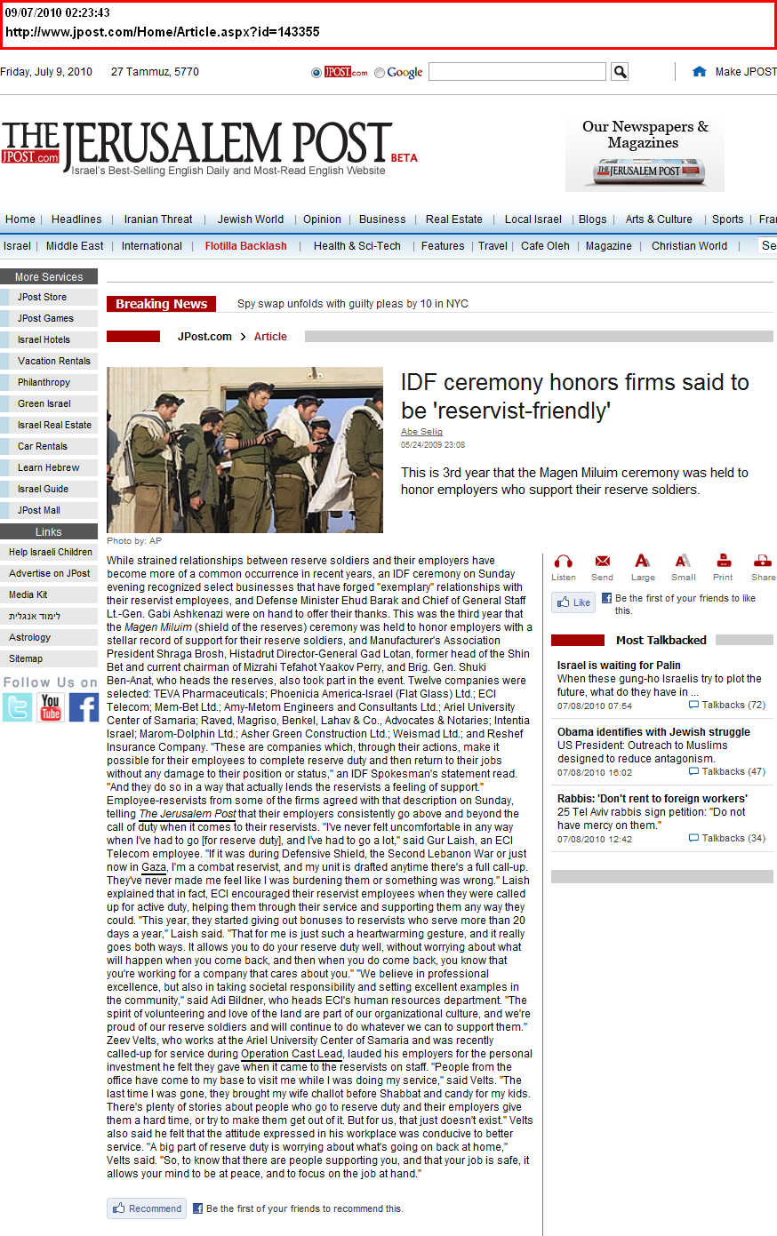 Apart from being a key contractor for the IDF, ECI also support the IDF is other ways. In May 2009 the IDF honoured 12 companies who have "a stellar record of support for their reserve soldiers". ECI was was amongst those honoured by Defense Minister Ehud Barak. After the Israeli attack on Gaza in 2009, ECI started giving out bonuses to any of its employees who serves in the IDF for more than 20 days in the year.