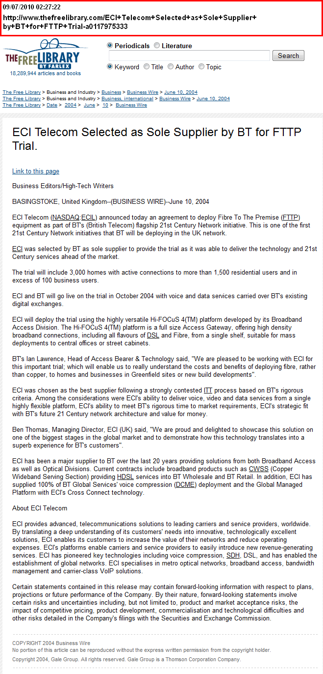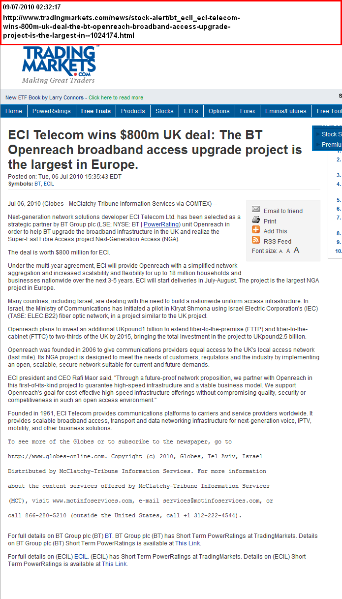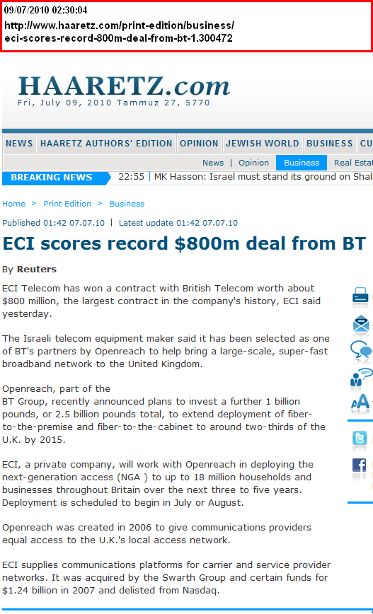Electronics Corporation of Israel (ECI) Telecom has been selected by British Telecom to help upgrade the UKs broadband infrastructure. The contract is worth $800 million (£526 million) - the largest contract in ECI's history.