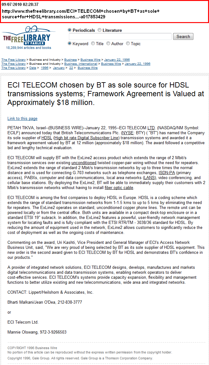 Since entering the civilian market, ECI has been a major supplier to BT over the last 26 years.