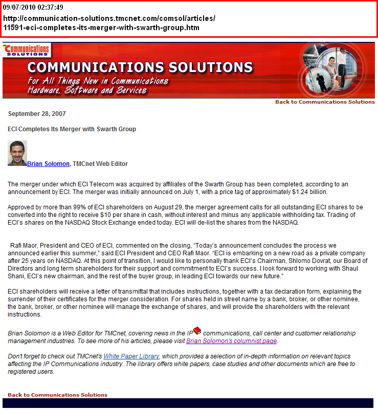 In 2007 ECI was bought out by private Israeli equity firm The Swarth Group for $1.2 billion.