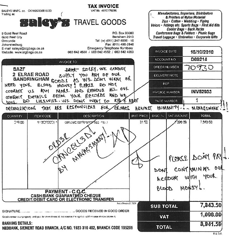 On 18th October 2010, the SA Zionist Federation, which openly supports settlements built on stolen Palestinian land, placed a $1,200 order for 249 bags in preparation for its 47th Annual Conference. The following day it received the rejected invoice from Saley’s Travel Goods stating "Order cancelled by management!".