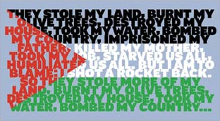 "They stole my land, burnt my olive trees, destroyed my house, took my water, imprisoned my father, killed my mother, starved us all, humiliated us all. But I am to blame : I shot a rocket back. So they stole more of my land, burnt my olive trees, destroyed my house, took my water, bombed my country...".