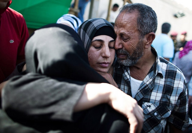 Hana Shalabi hugging her father and mother when she was released in the Hamas-Israeli swap of Palestinian prisoners in October 2011, after two and half years of imprisonment