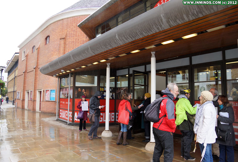 The reaction from the Globe was mixed. One members of staff took it upon herself to confiscate and destroy leaflets from members of the public as they entered the theatre! On the other hand the Globe's artistic director Dominic Dromgoole at one stage came out to chat and said he was sorry we had such bad weather for our demo.