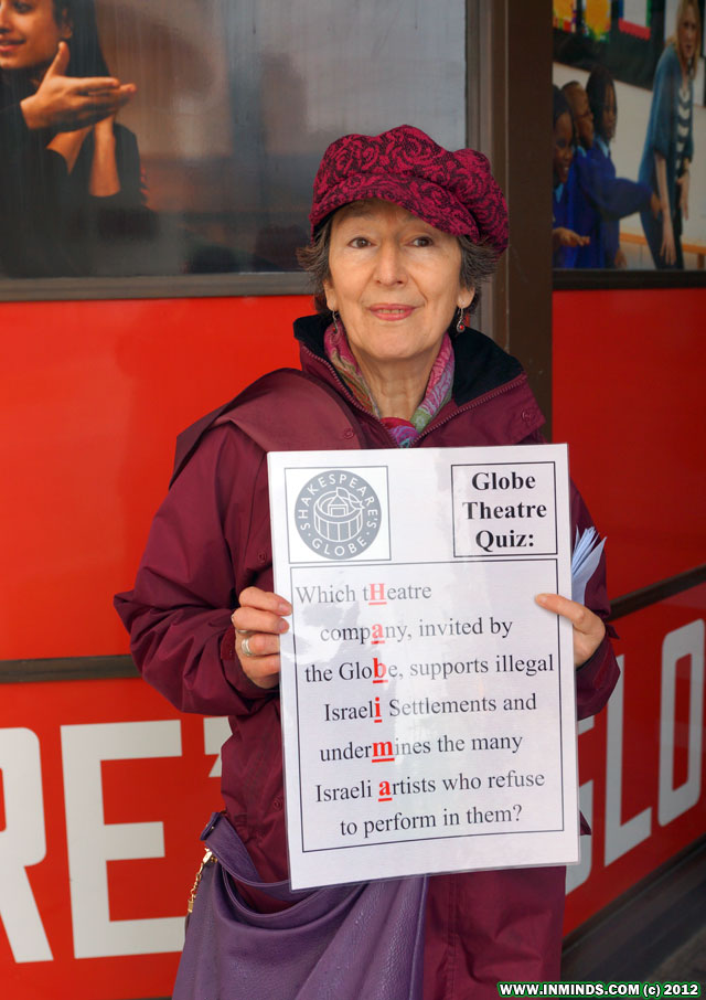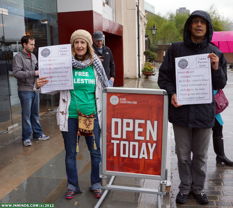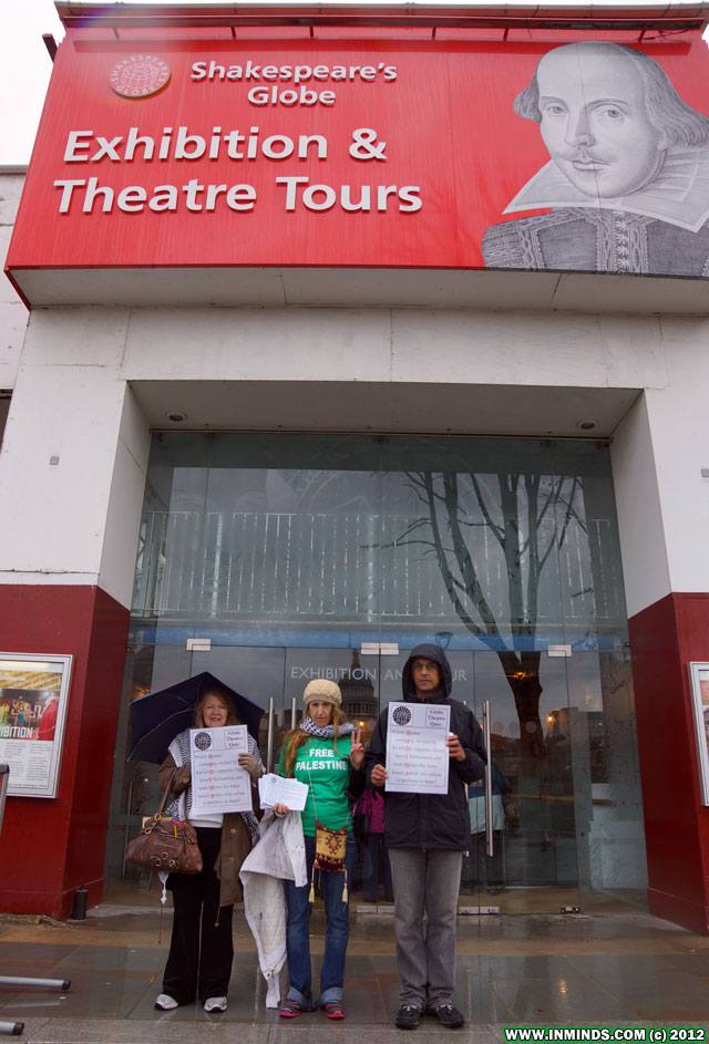 inminds 10 May 2012 On Saturday 28th April 2012, Palestinian rights activists braved the wet weather to picket outside Shakespeare's Globe Theatre in London in protest at the Globe's decision to invite Israel's National Theatre, Habima, to perform The Merchant of Venice in its Globe to Globe festival in May.