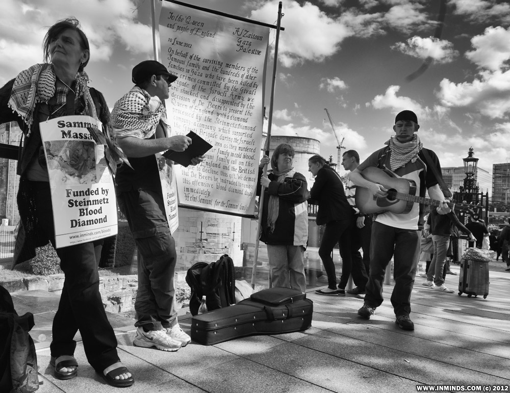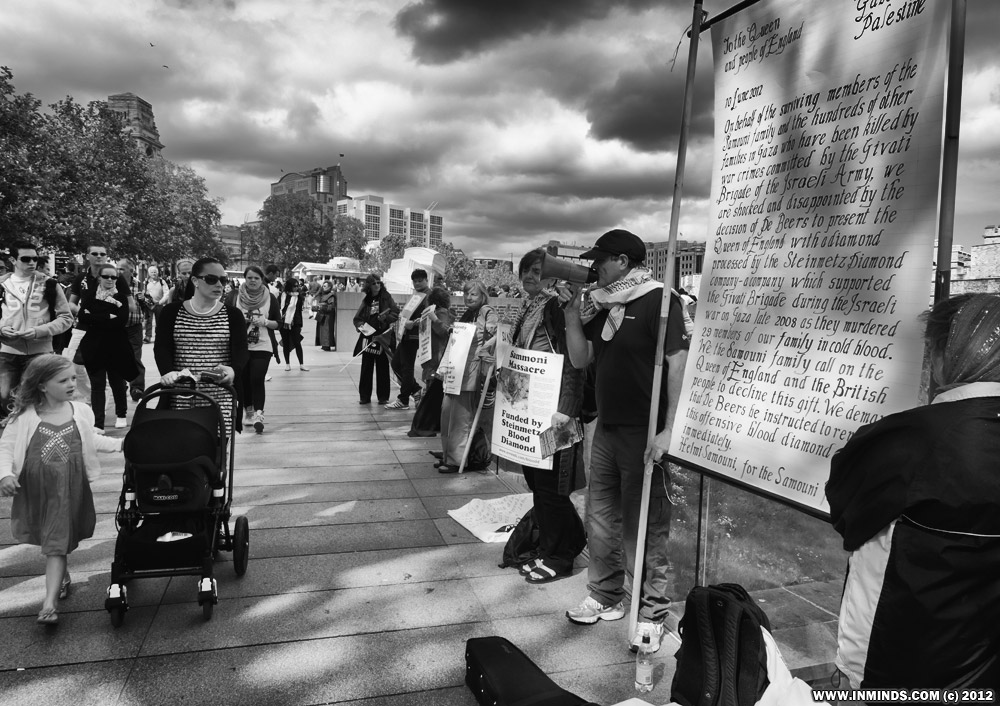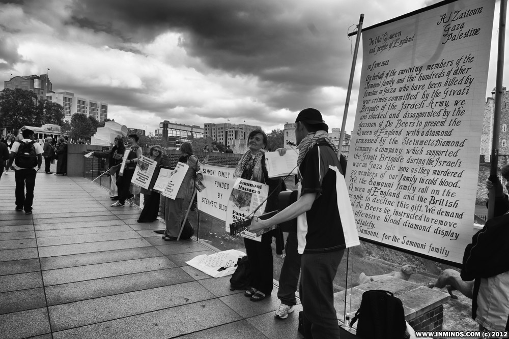 In the third protest in three weeks, human rights activist on Sunday 1st July 2012 gathered outside the Tower of London asking the Queen to remove the Steinmetz blood diamond from the De Beers Jubilee display at the Tower of London. Israel's Steinmetz diamond company funds the notorious Givati Brigade of the Israeli army which is guilty of heinous war crimes in Gaza including the massacre of the Samouni family, murdering 29 members of the family including many children. The surviving members of the Samouni family have asked the Queen and the British people to reject the blood diamond and remove it from display.