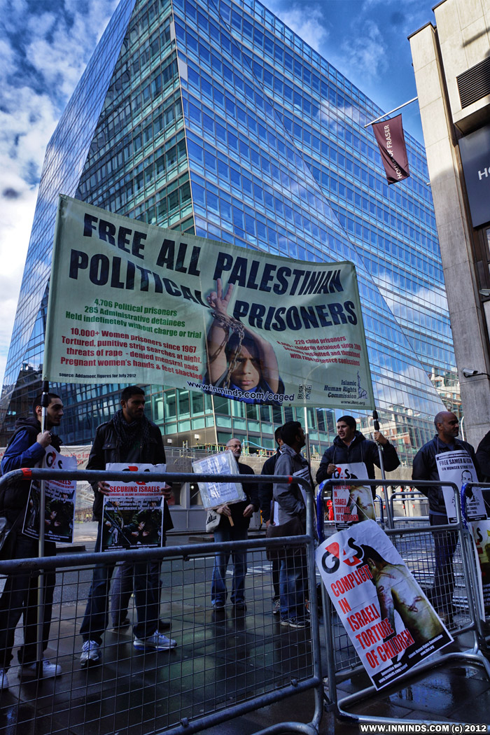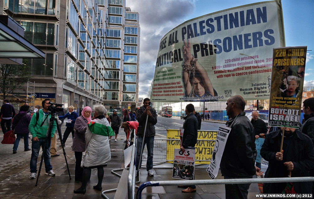 The protest was part of an ongoing series of protests held in support of Palestinian prisoners organised by Innovative Minds (inminds.com) and the Islamic Human Rights Commission (ihrc.org) coming together as the Palestinian Prisoners Campaign Group which culminated out of this years Al Quds Day.