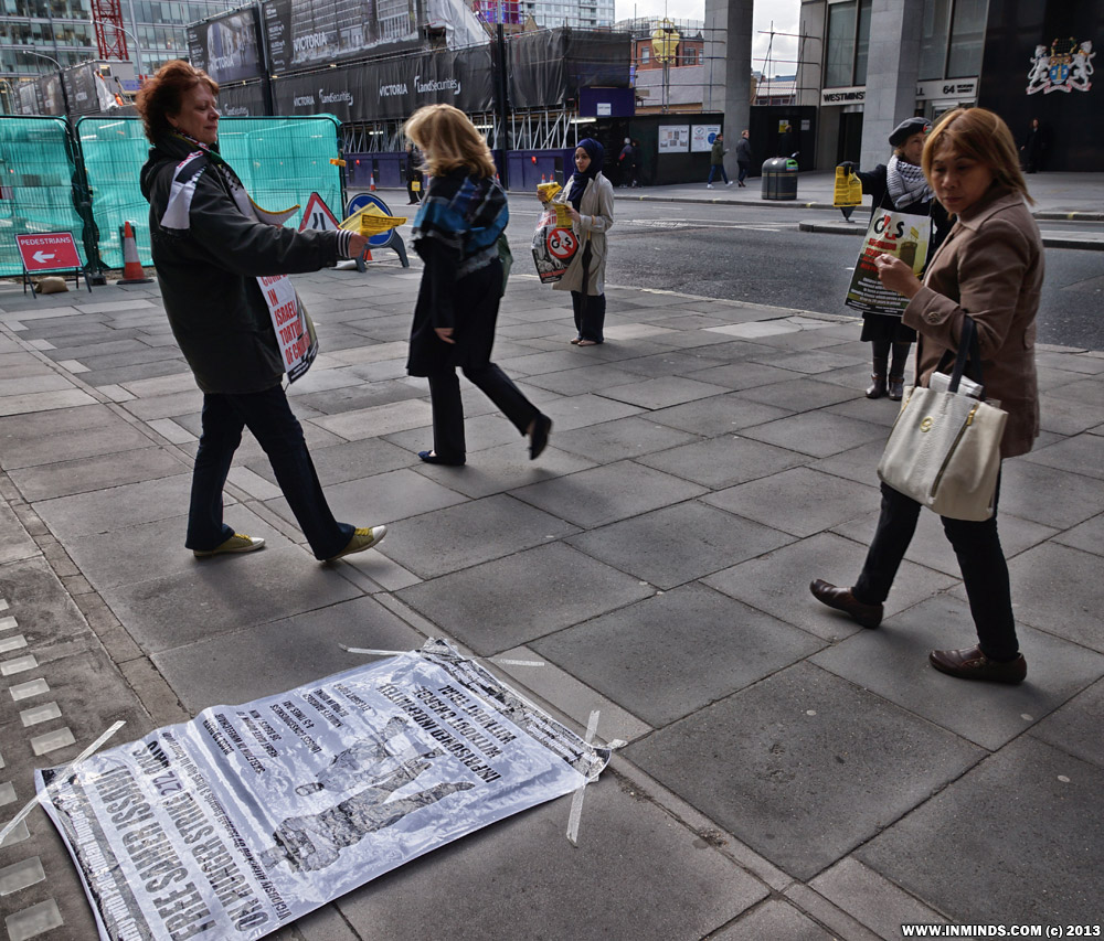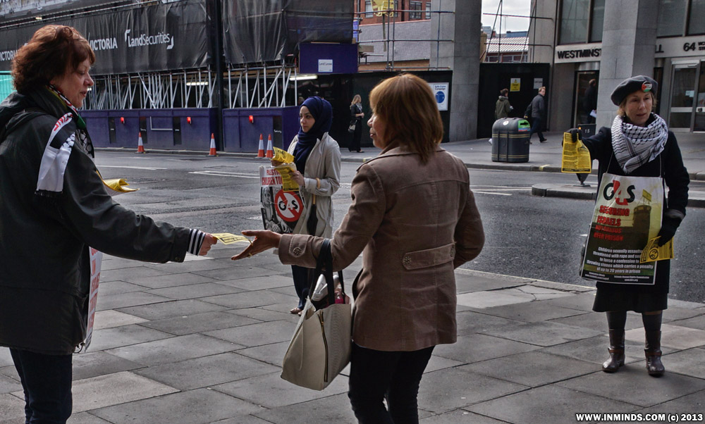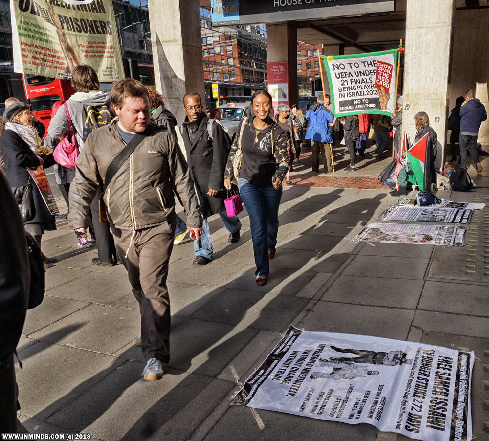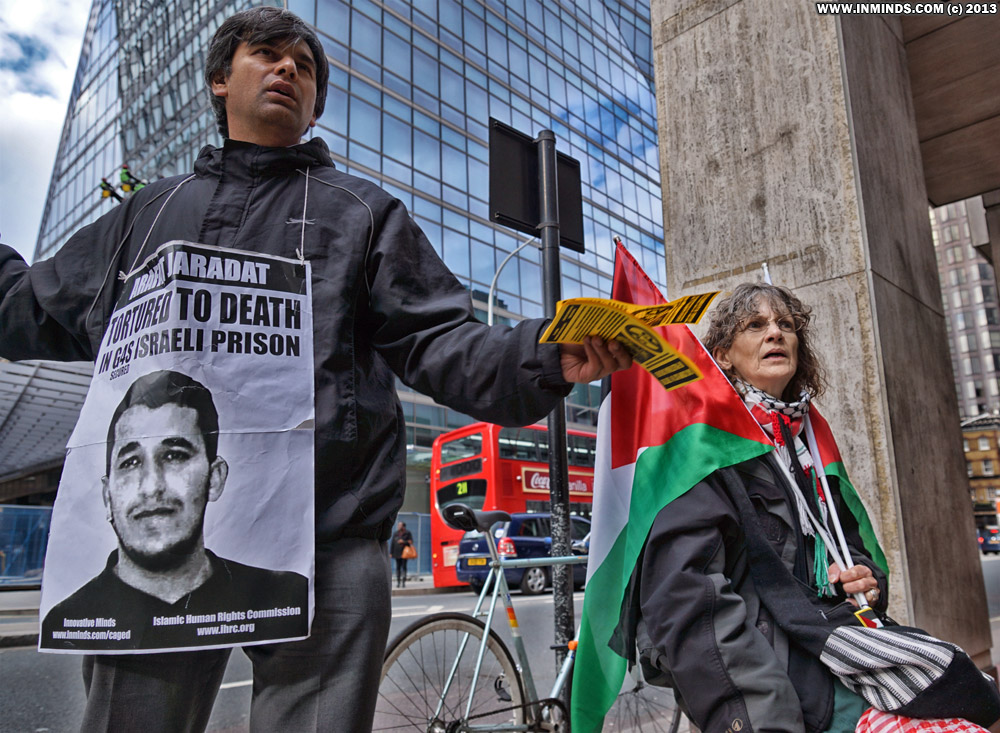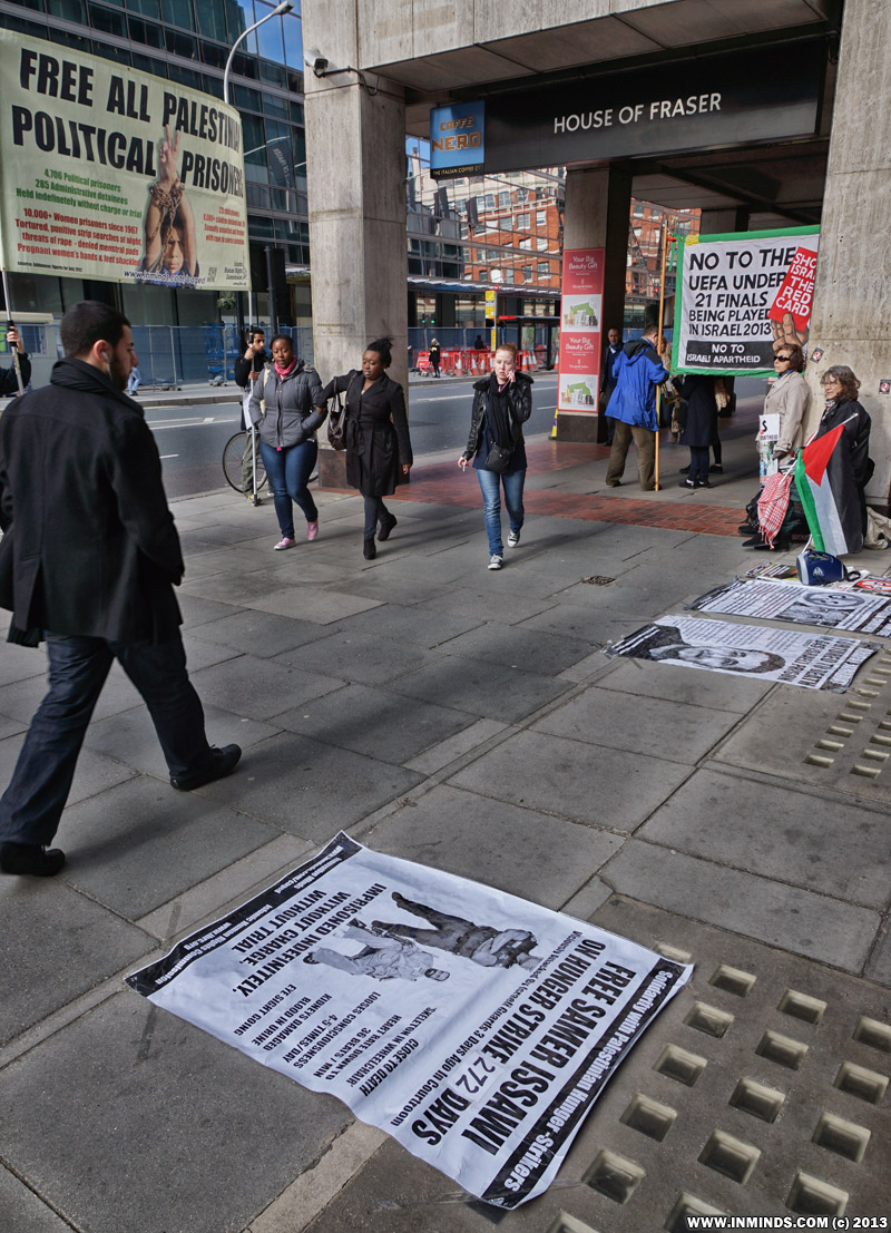 As always, we stood in solidarity with the Palestinian hunger strikers, in particular Samer Issawi now 272 days without food, miraculously starring death down to live another day. Shackled to a bed in Kaplan hospital Samer Issawi smuggled a letter out via his lawyer on the occasion of Palestinian Prisoners Day in which he asked for the Ummah and all free peoples of the world to make Prisoners Day a day of anger and solidarity with all political prisoners, he also stressed that there "should not be the only day on which there is solidarity with the political prisoners, but there must be daily solidarity protests".