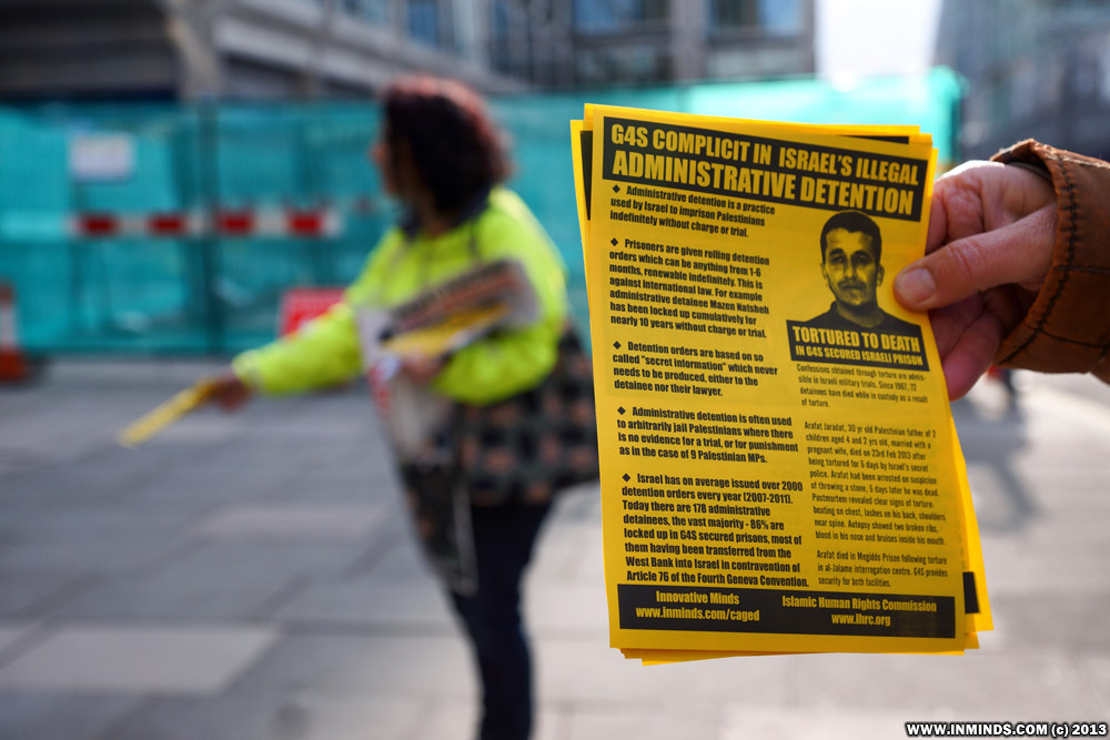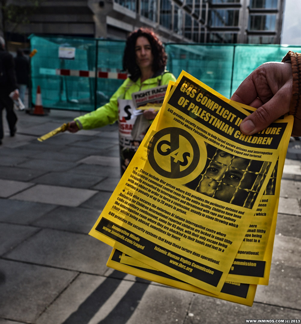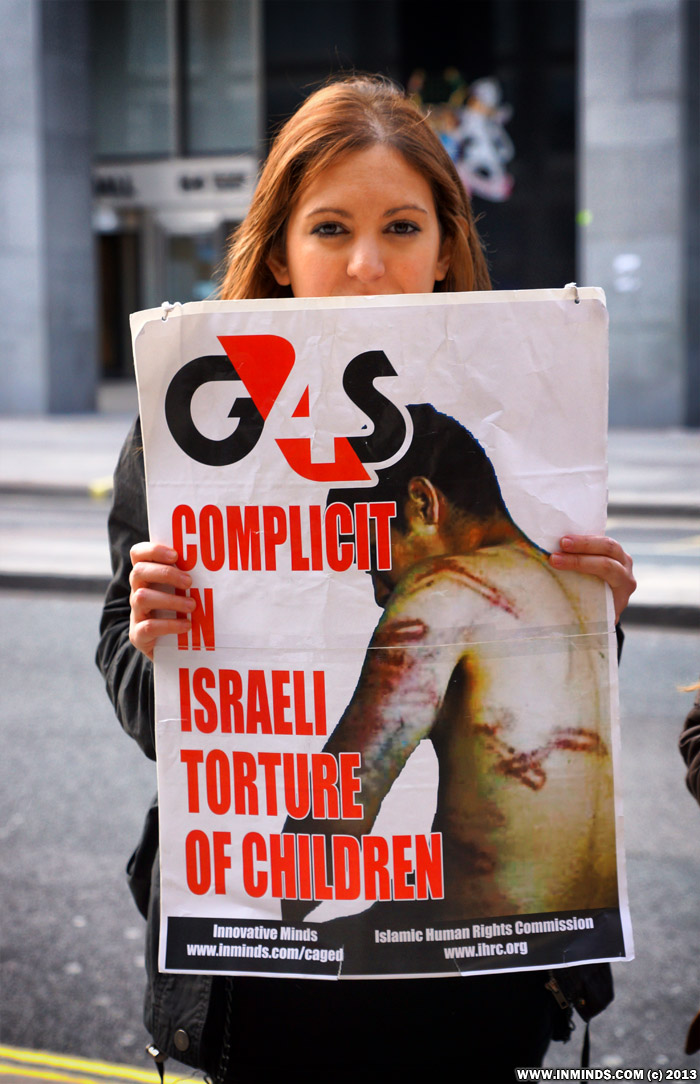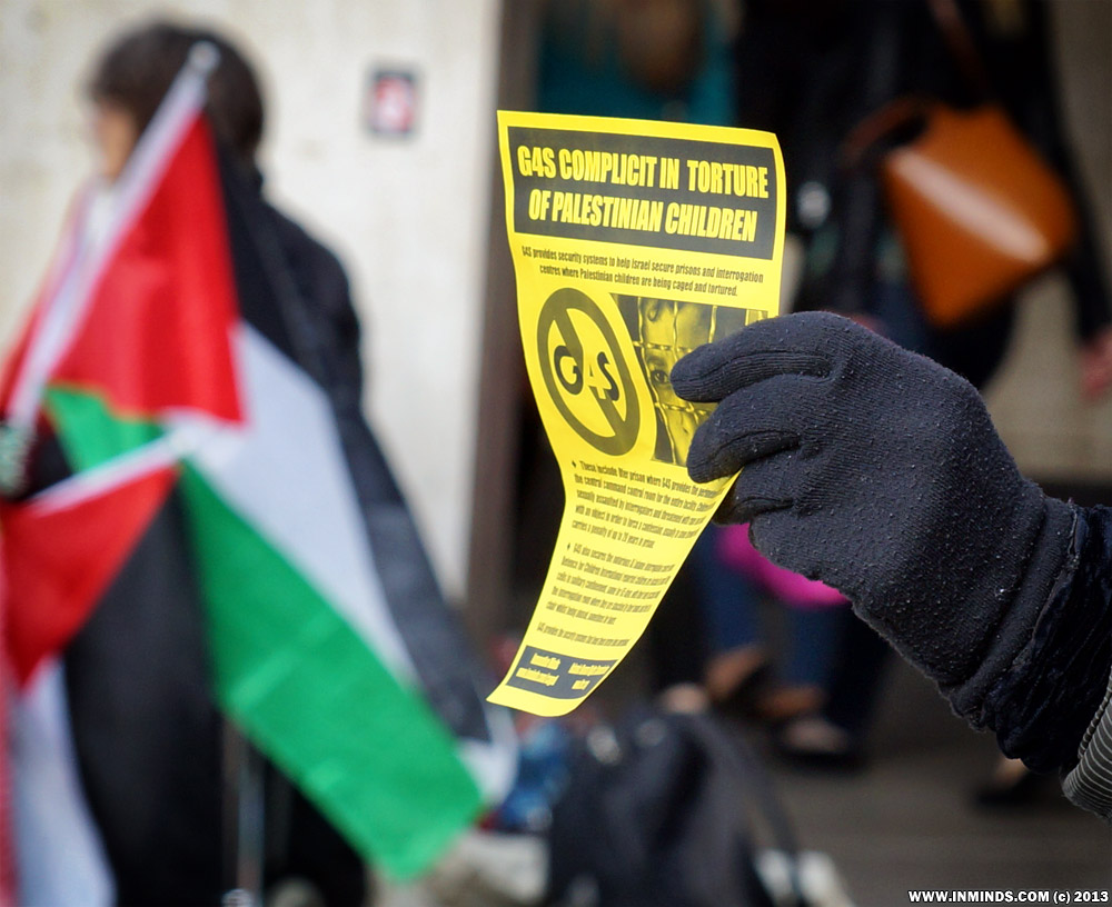 inminds 21 April 2013 As part of Palestinian Prisoners Day commemoration on Friday 19th April 2013 activists targeted G4S for its complicity in the torture of Palestinian children; and in Israel's illegal system of Administrative Detention.