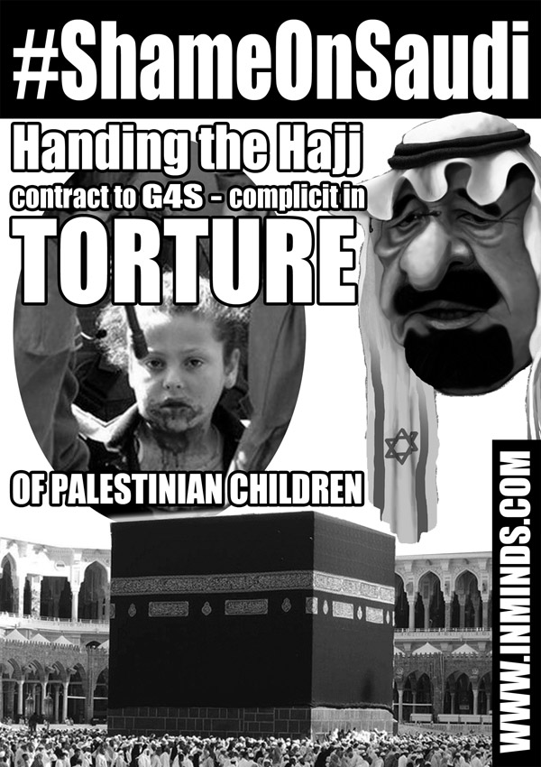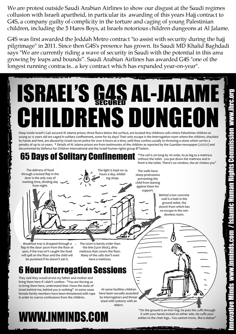 We will protest outside Saudi Arabian Airlines in London to show our disgust at the Saudi regimes collusion with Israeli apartheid, in particular its latest installment with the awarding of this years Hajj contract to G4S, a company guilty of complicity in the torture and caging of young Palestinian children at Israels notorious children dungeons at Al Jalame - including the 5 Hares Boys who are still languishing in a G4S secured Israeli dungeon today. Women prisoners are equally abused at Israel's G4S secured HaSharon prison.