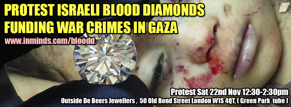 Join us on Saturday 22nd Nov 2014 outside the global diamond brand De Beers in Bond Street as we highlight the fact that Israeli blood diamonds bankrolled the mass murder of over 2200 Gazaans this summer including 521 children as documented by the UN.