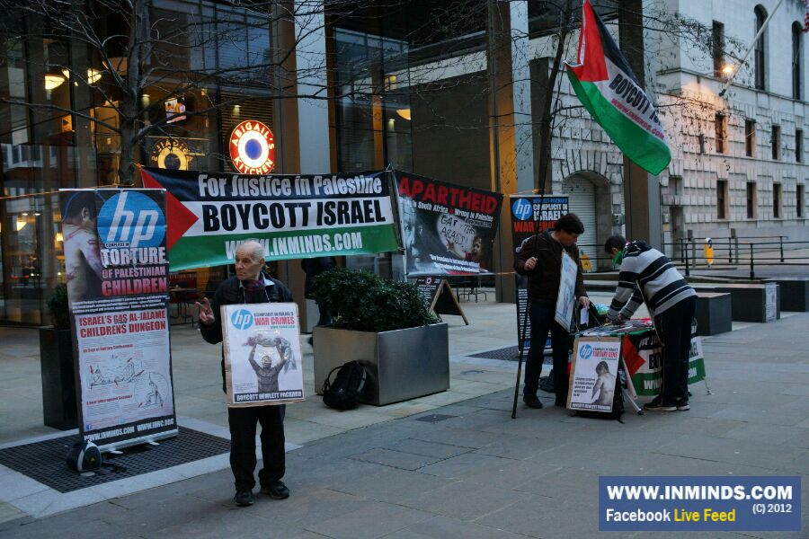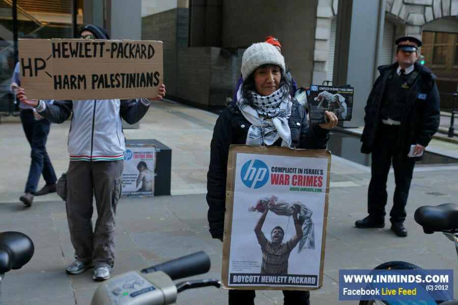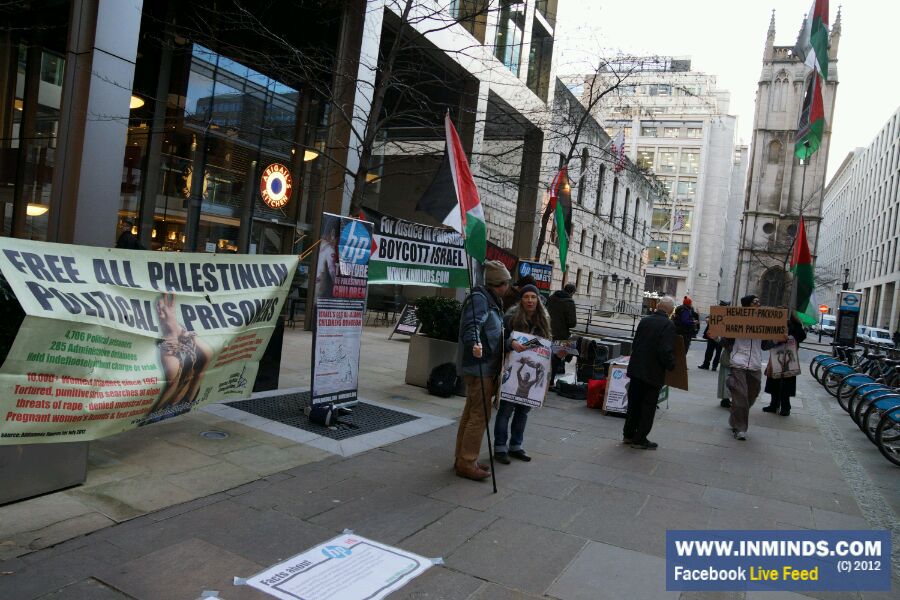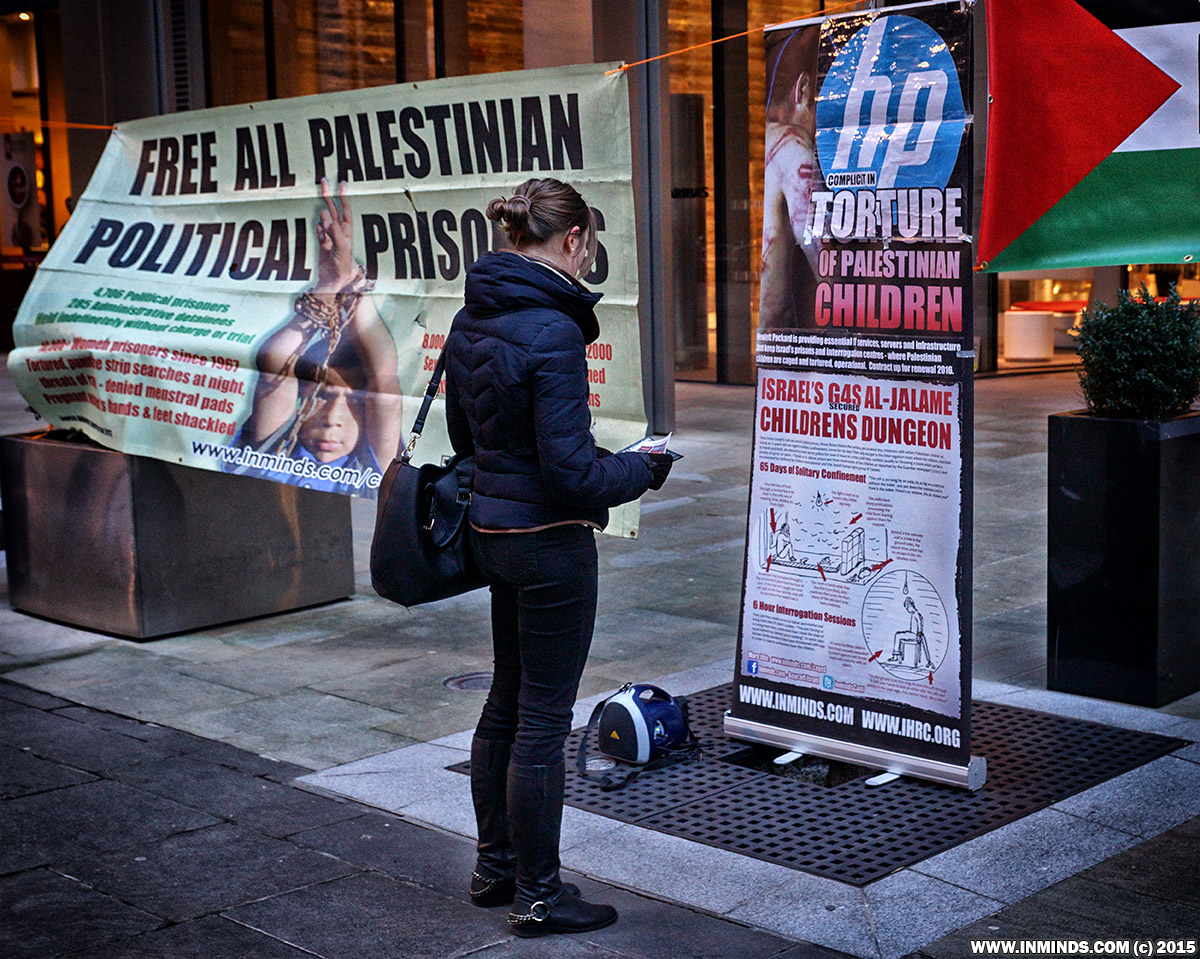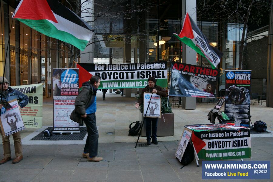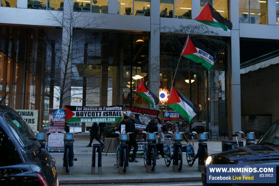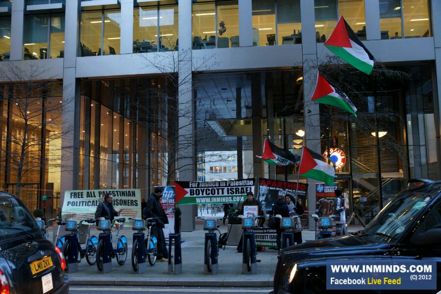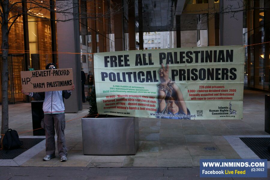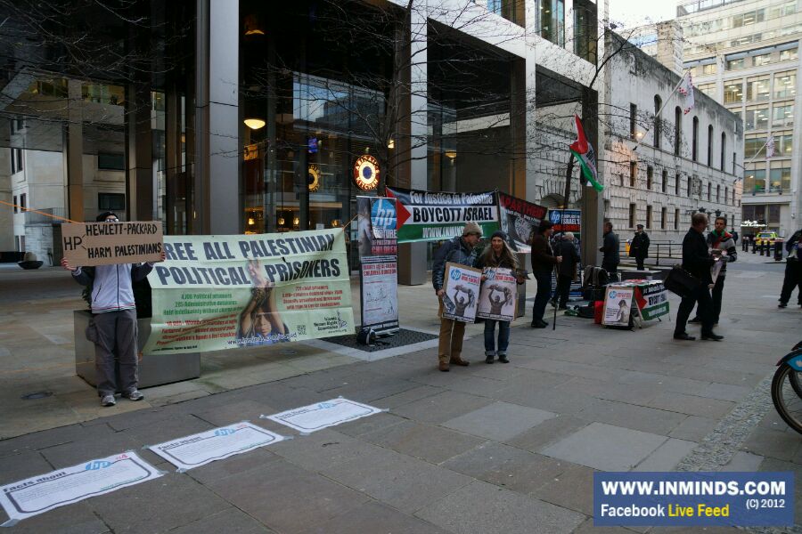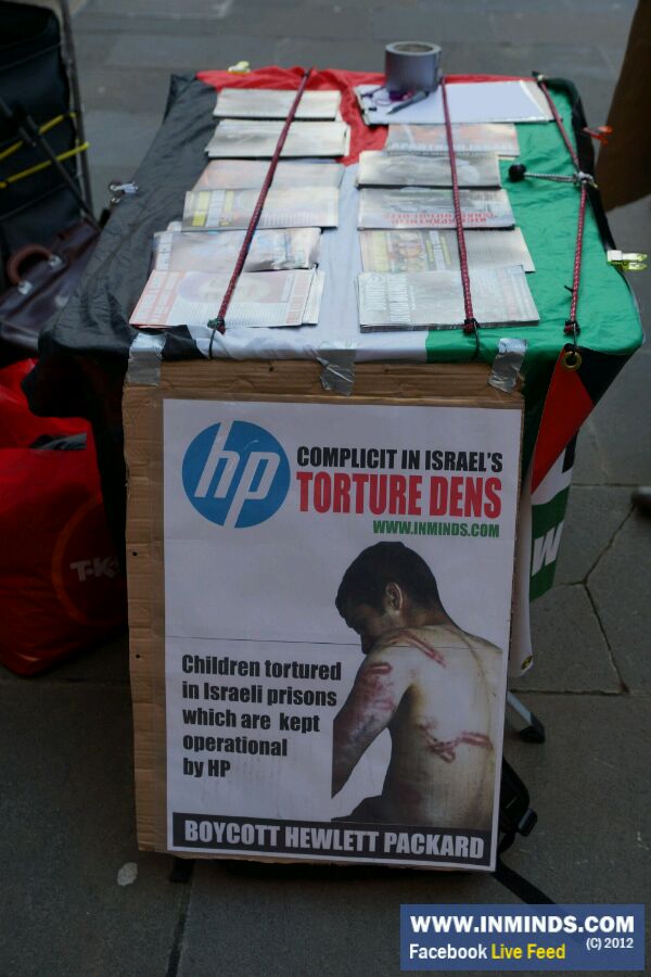 We are here today outside the London offices of Hewlett Packard to demand Hewlett Packard stop its complicity in Israel's dungeons and torture dens.