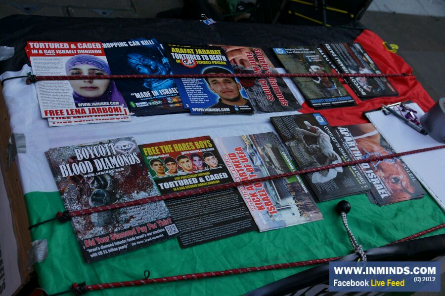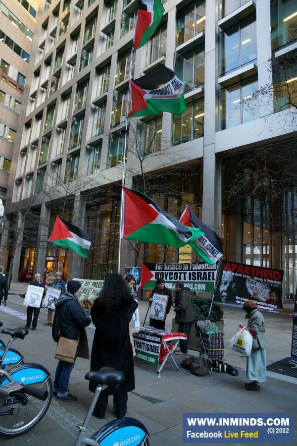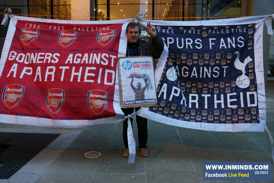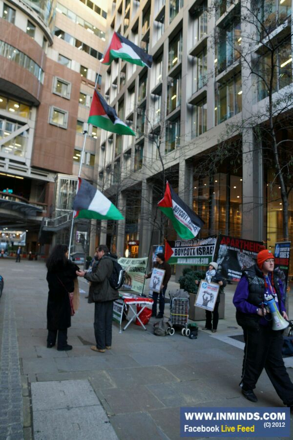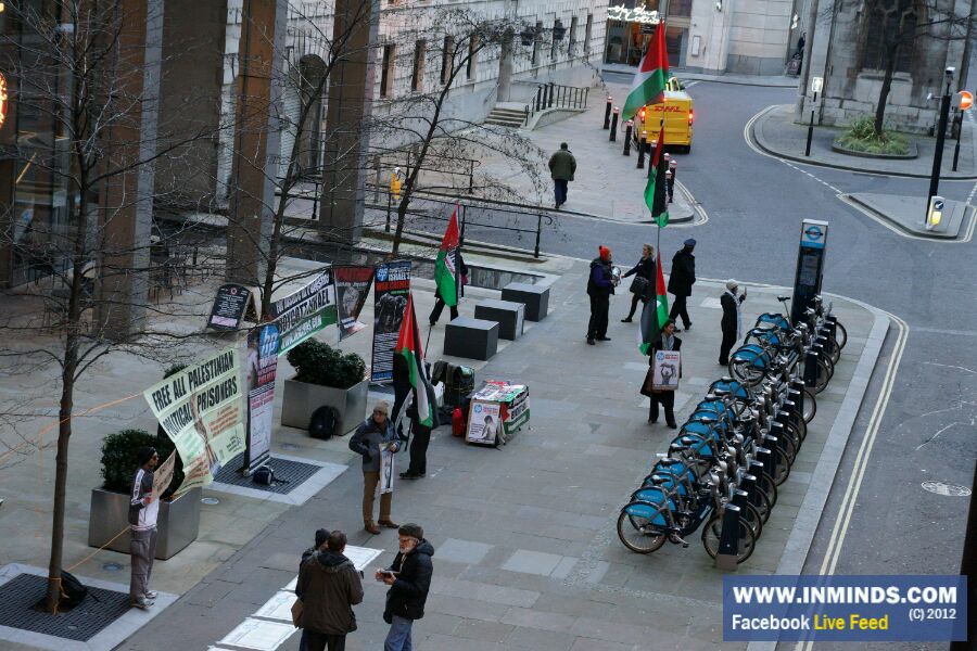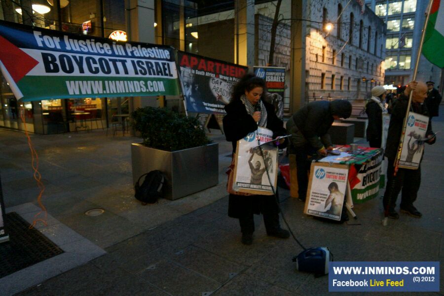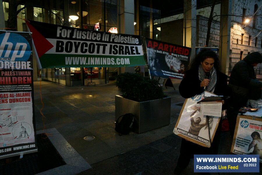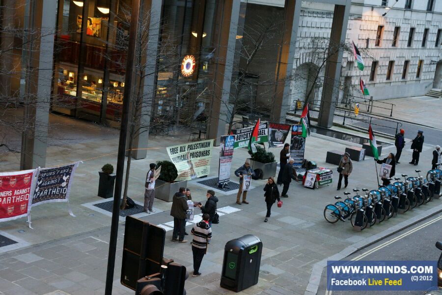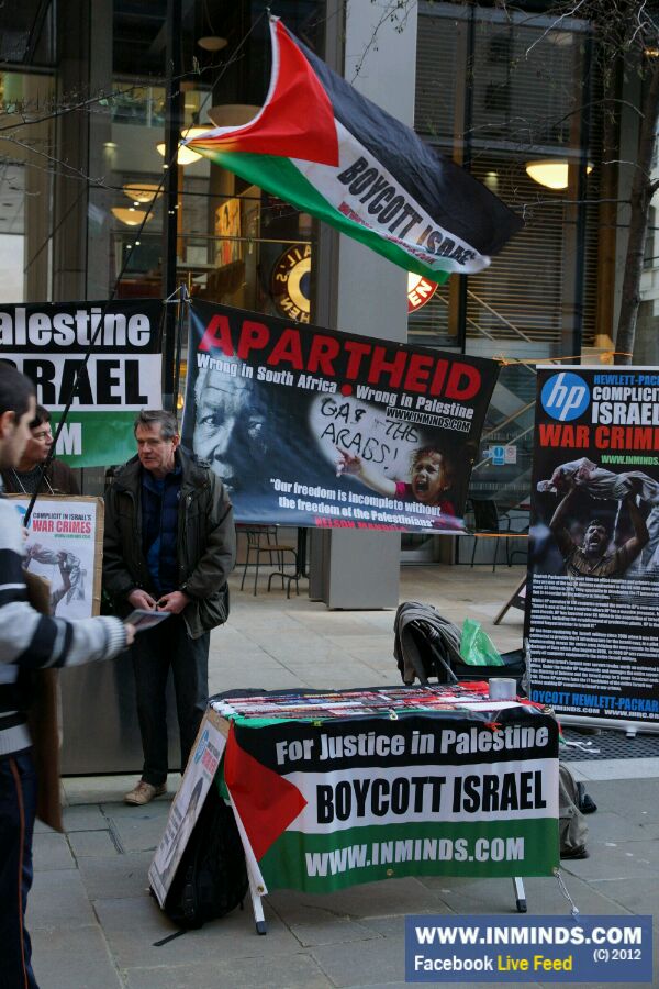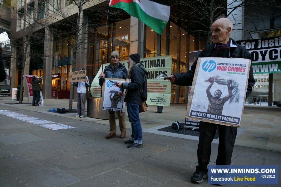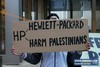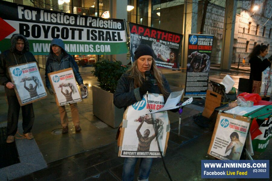 We are here today outside the London offices of Hewlett Packard to demand Hewlett Packard stop its complicity in Israel's dungeons and torture dens.