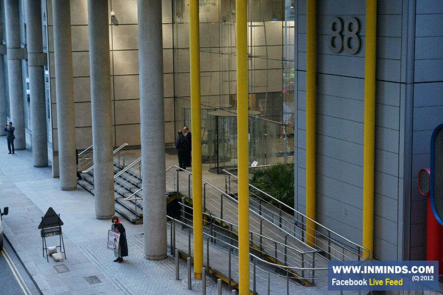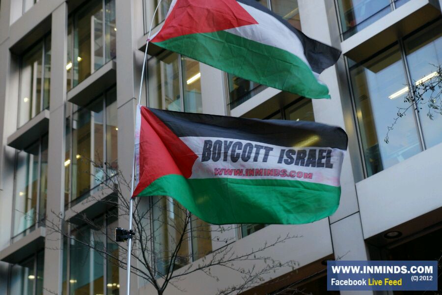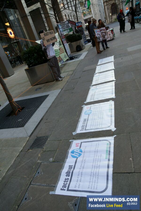 We are here today outside the London offices of Hewlett Packard to demand Hewlett Packard stop its complicity in Israel's war crimes.