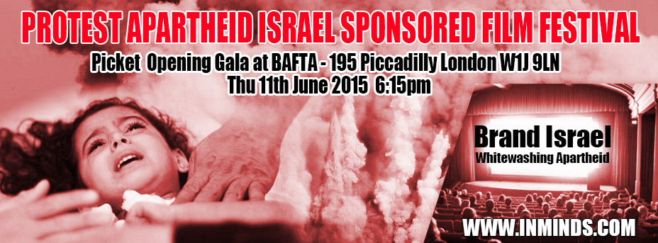 We will also be protesting outside the public opening Gala of the festival on Thursday 11th June 2015 at 6:15pm outside BAFTA asking them to stop its complicity in this whitewashing of apartheid and giving out leaflets to the public, talking to them about boycotting 'brand Israel'. Please join us!