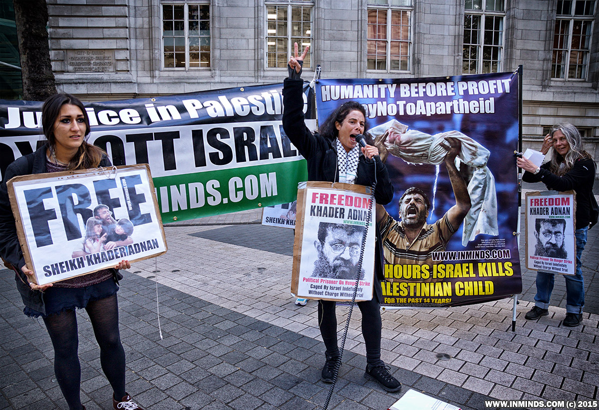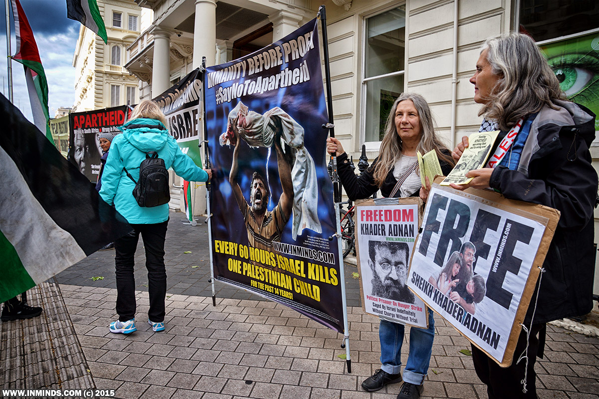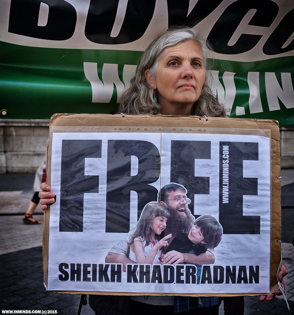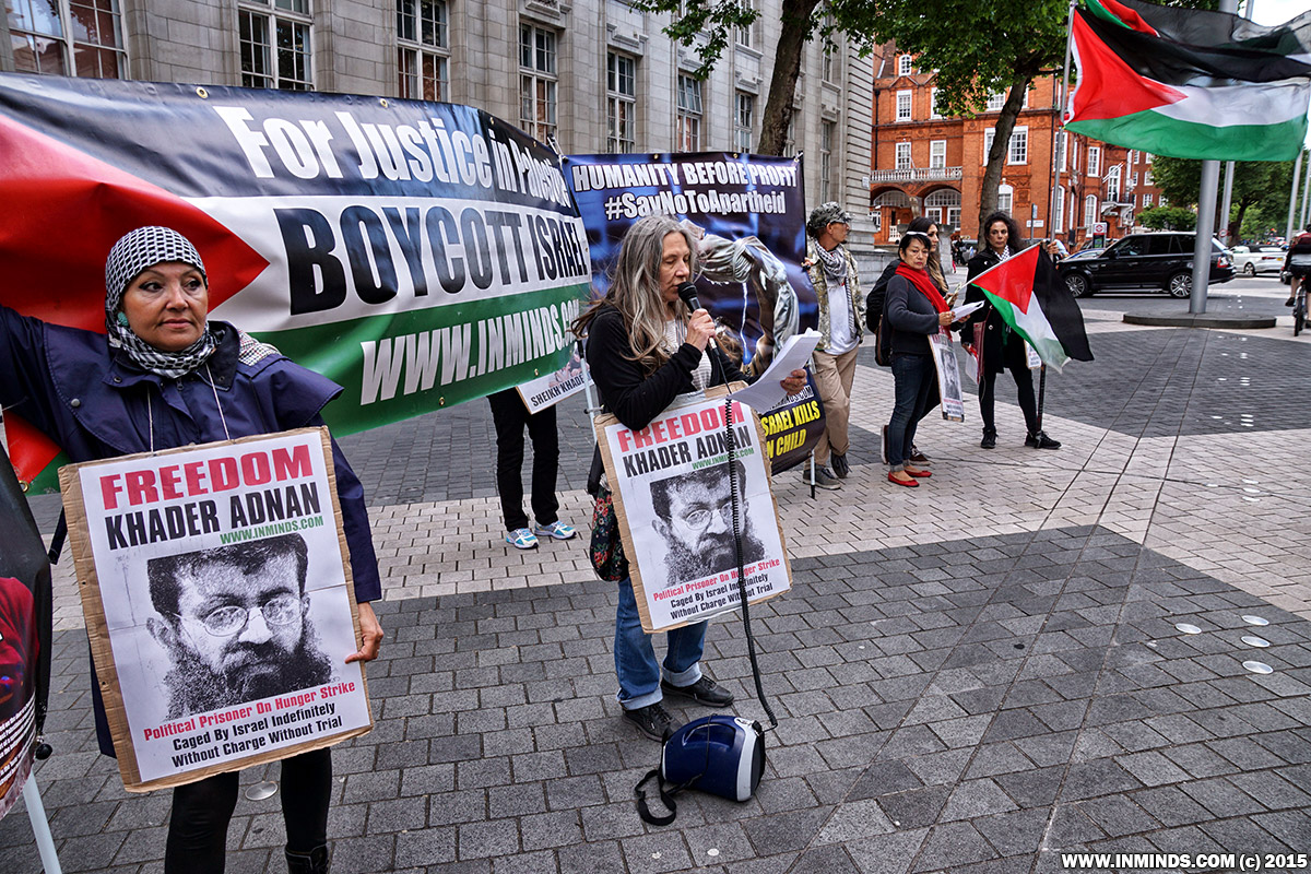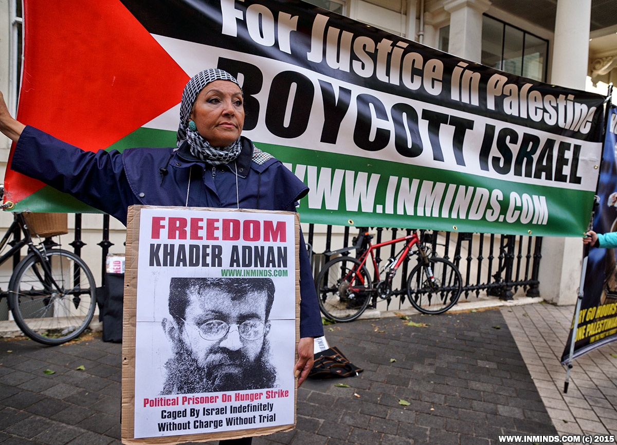 inminds 14 June 2015 An emergency protest to demand freedom for Palestinian hunger striker Sheikh Khader Adnan was organised by Inminds on 9th June 2015 at the reception of the Israeli deputy ambassador at the Goethe Institut in London where the Israeli government sponsored film festival Seret 2015 was being launched. After 36 days on open hunger strike, Khader Adnan is in critical condition, experiencing intermittent comas, a sharp decrease in weight and drop in his heart rate.