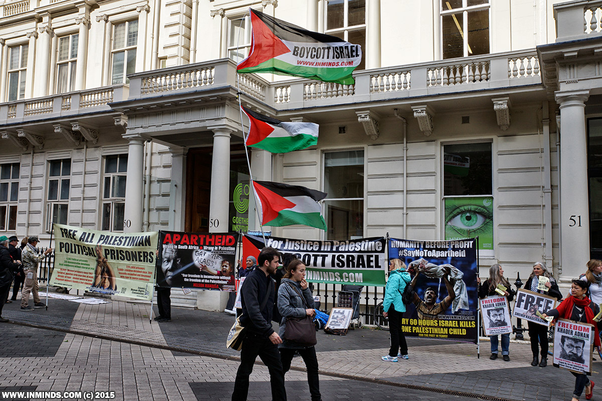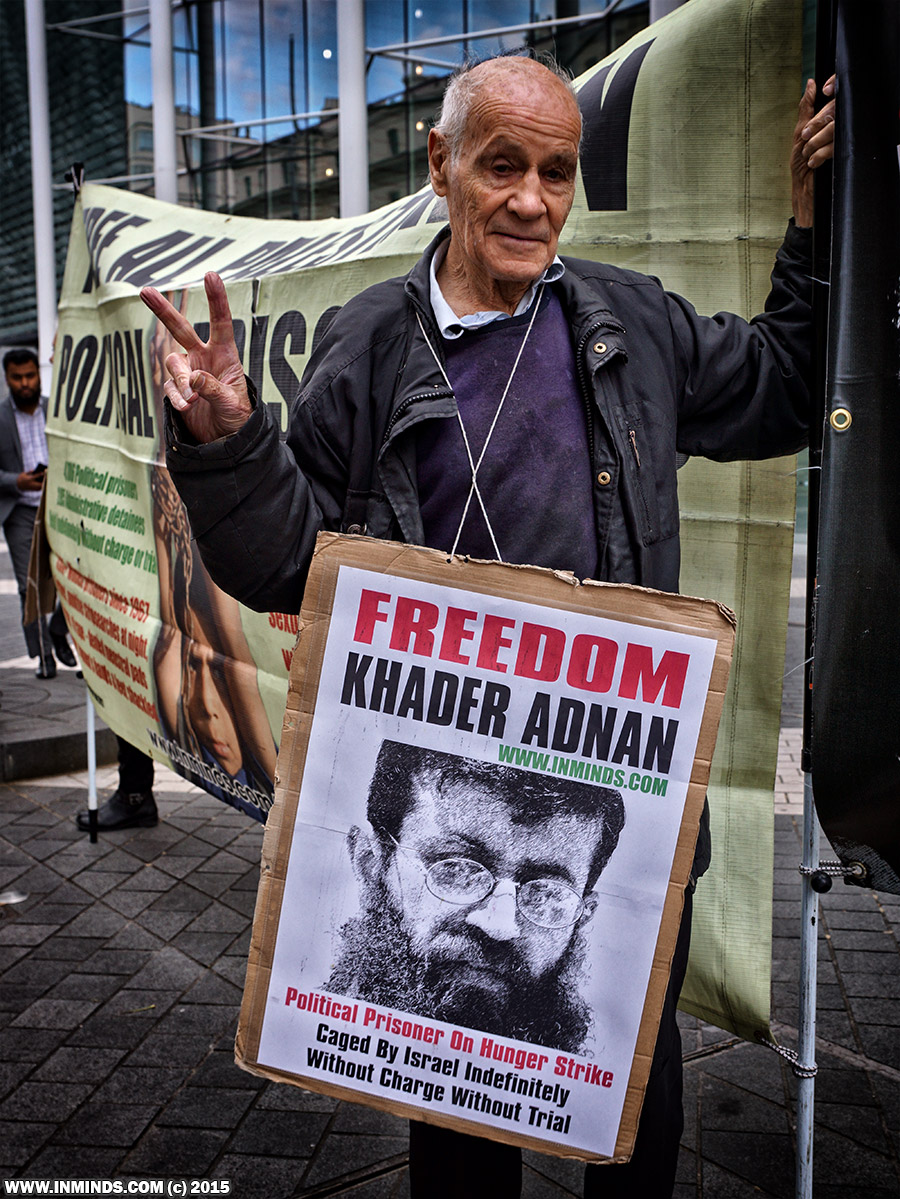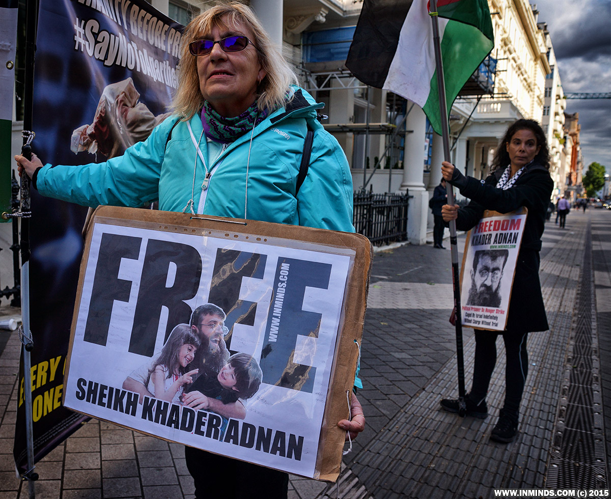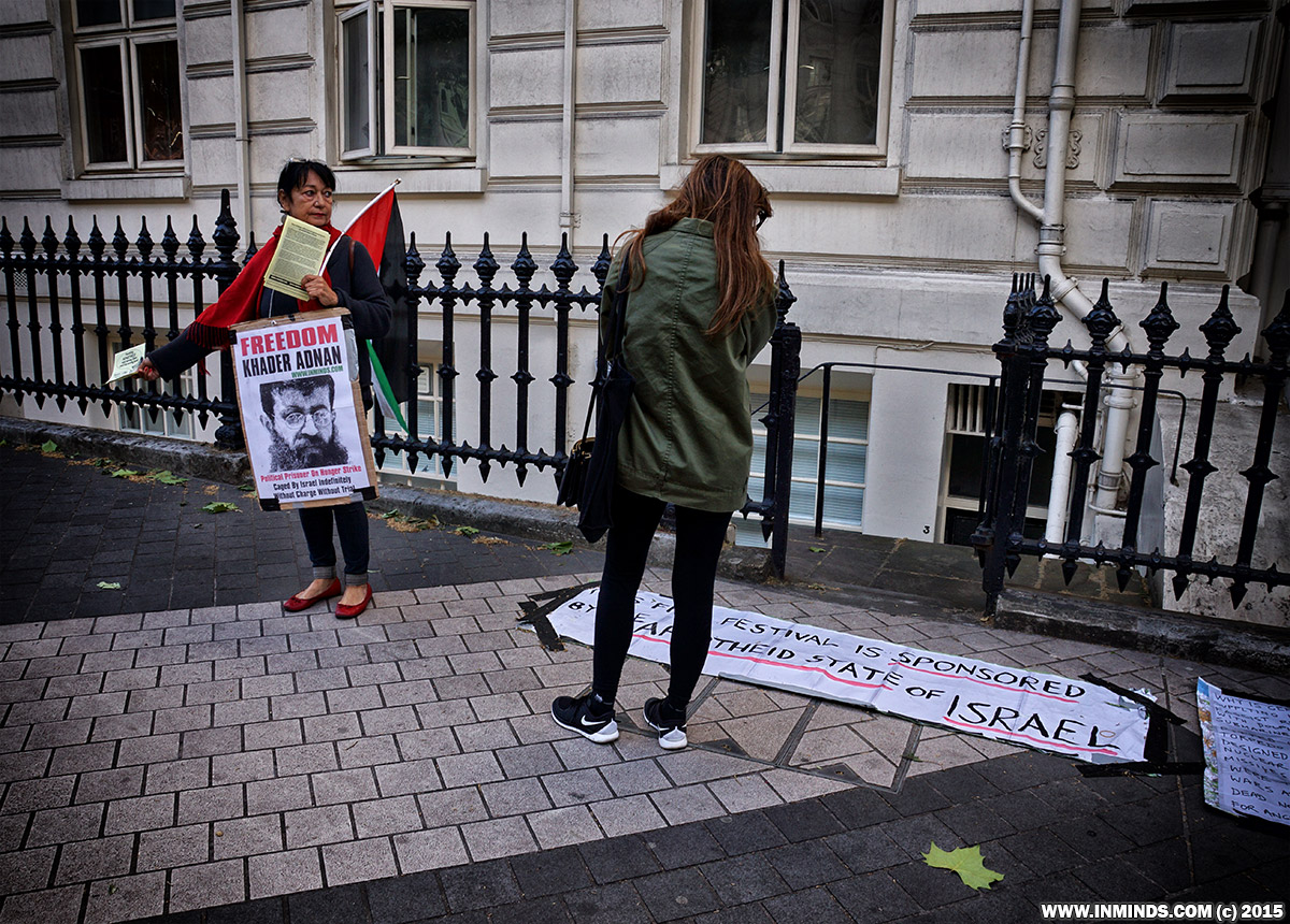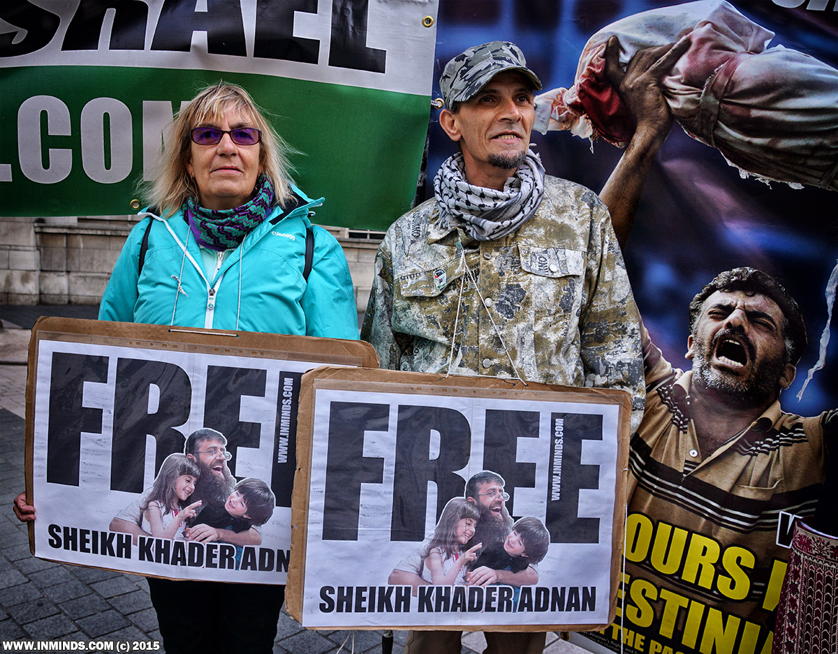 inminds 14 June 2015 An emergency protest to demand freedom for Palestinian hunger striker Sheikh Khader Adnan was organised by Inminds on 9th June 2015 at the reception of the Israeli deputy ambassador at the Goethe Institut in London where the Israeli government sponsored film festival Seret 2015 was being launched. After 36 days on open hunger strike, Khader Adnan is in critical condition, experiencing intermittent comas, a sharp decrease in weight and drop in his heart rate.