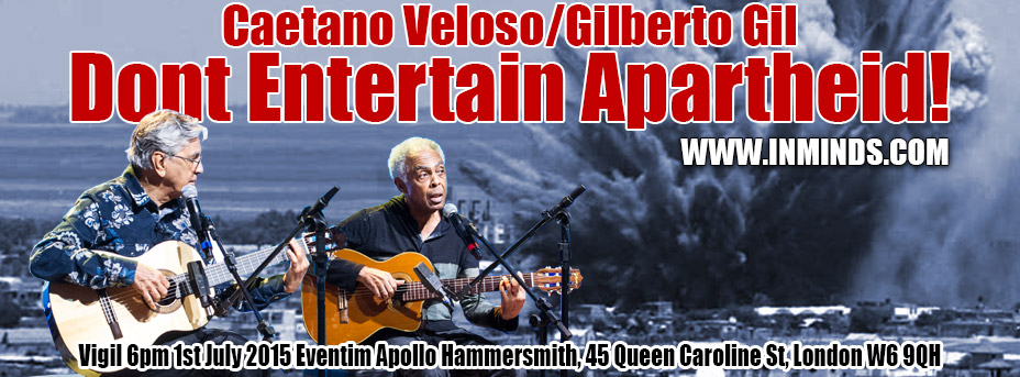 Please join us on 1st July 2015 at 6pm outside the Eventim Apollo Hammersmith to respectfully ask leading Brazilian artists Caetano Veloso and Gilberto Gil to keep true to the anti-racist Tropicália movement they helped found, by heeding the call of the oppressed Palestinians and boycott apartheid Israel by cancelling their scheduled gig in Tel Aviv on 28th July.