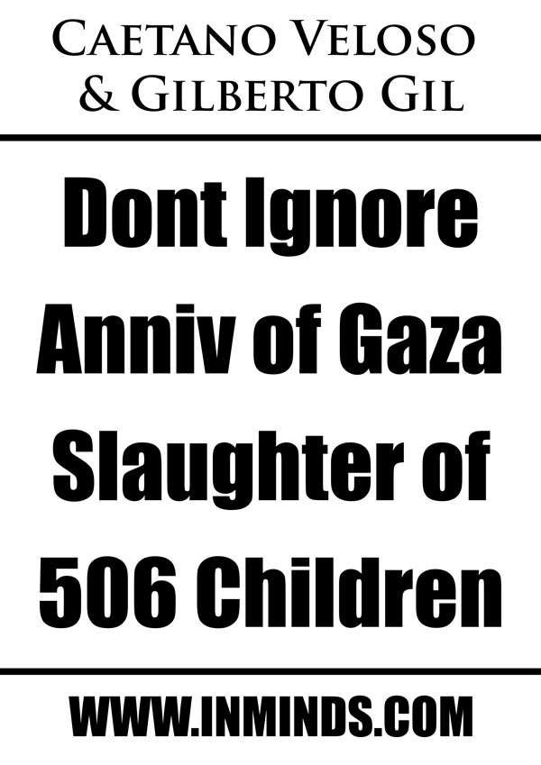 Veloso and Gil’s Tel Aviv gig will come days after the first anniversary of Israel's bloodbath in the besieged Gaza Strip in 2014. That slaughter left 506 children dead and was condemned as a "massacre" against Palestinian civilians by the Brazilian president Dilma Rousseff.