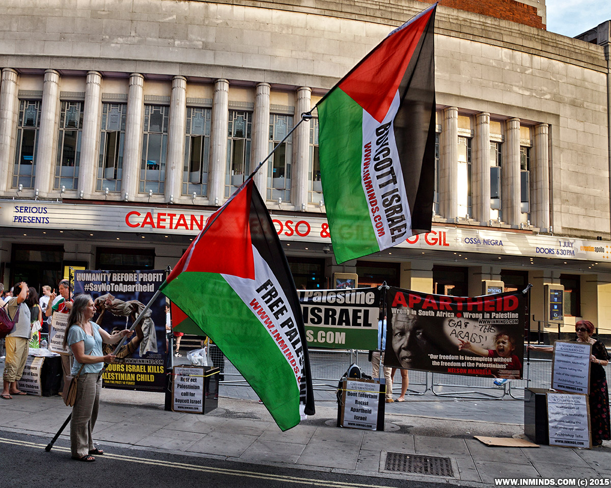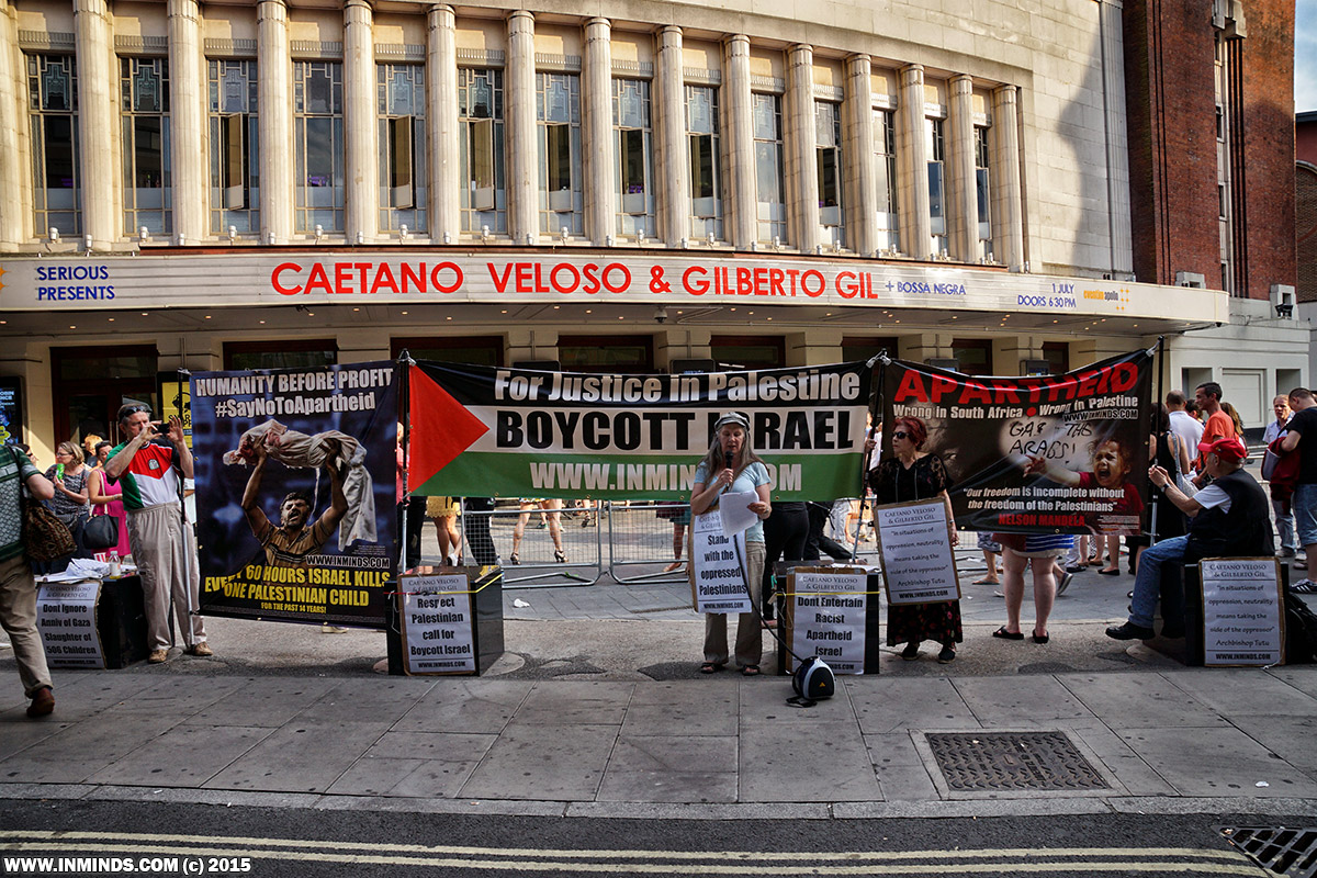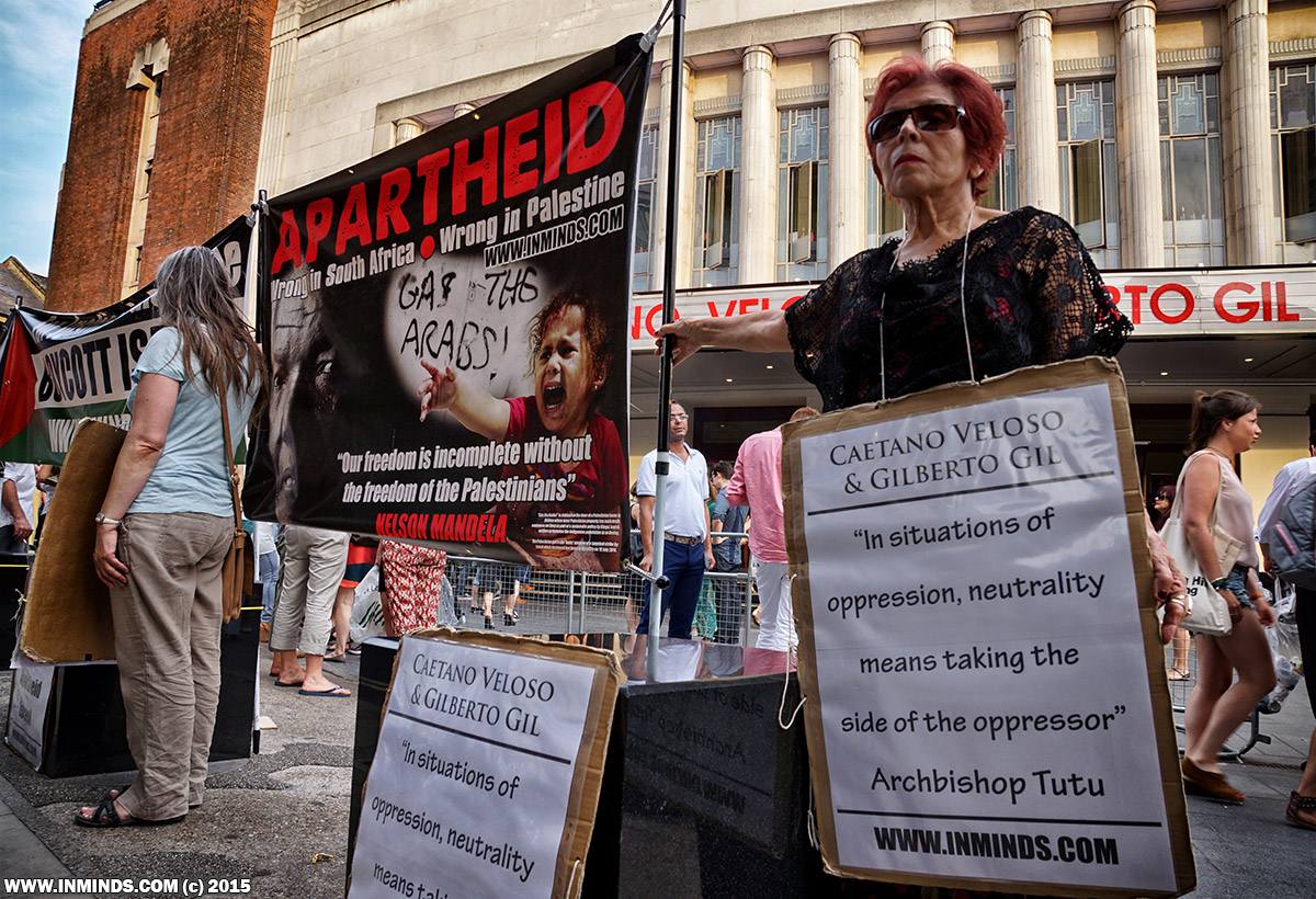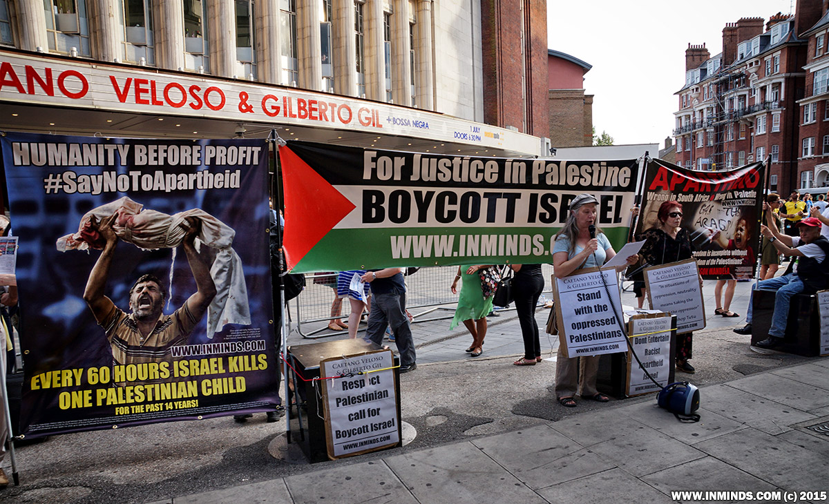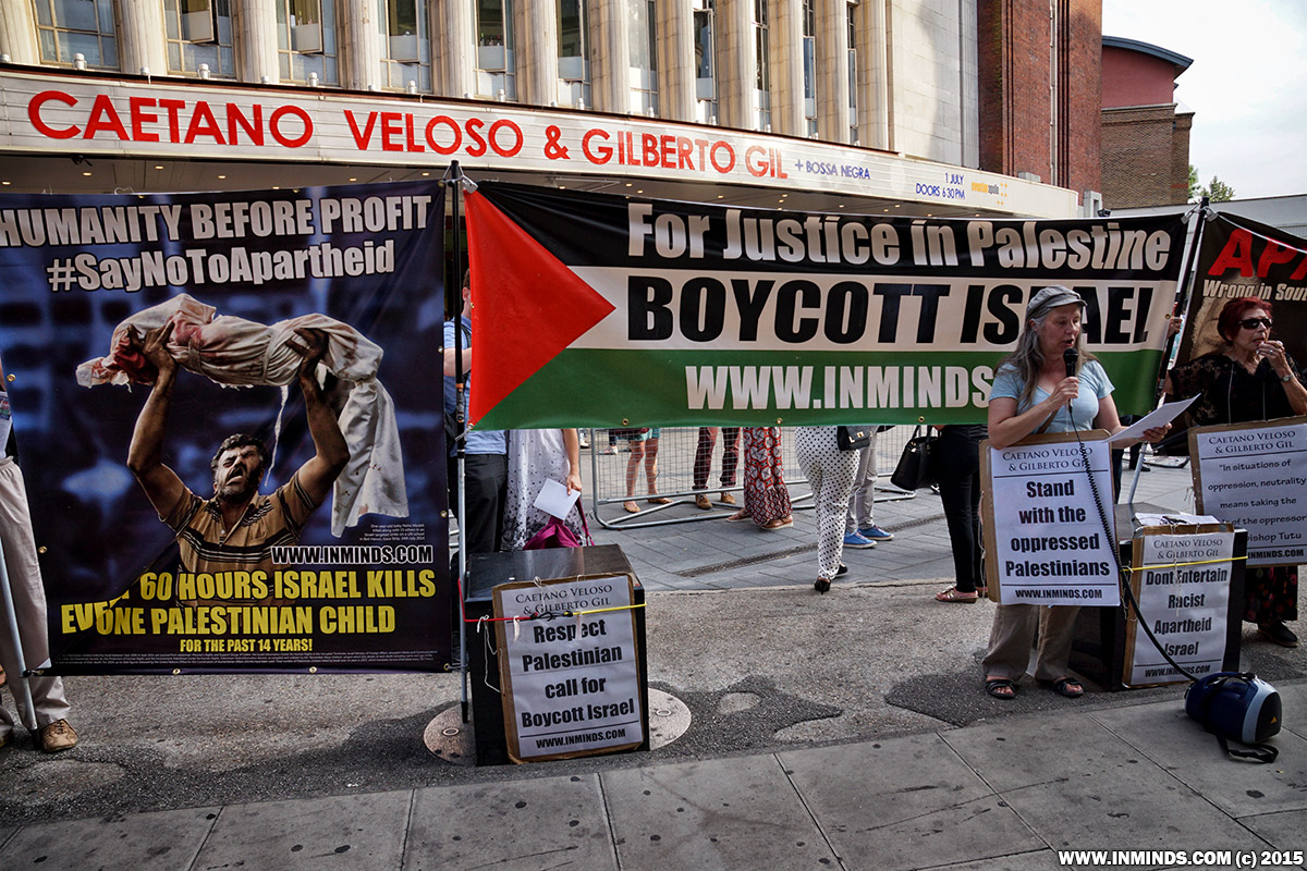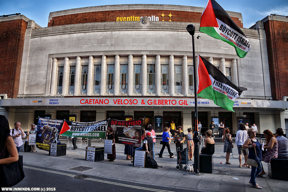 On 1st July 2015 Inminds held a protest outside the Eventim Apollo Hammersmith in London to respectfully ask leading Brazilian artists Caetano Veloso and Gilberto Gil to keep true to the anti-racist Tropicália movement they helped found, by heeding the call of the oppressed Palestinians and boycott apartheid Israel by cancelling their scheduled gig in Tel Aviv on 28th July.