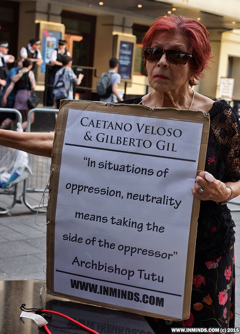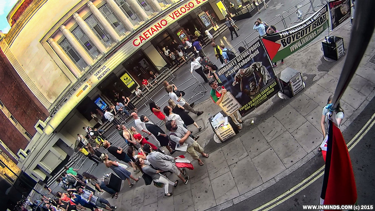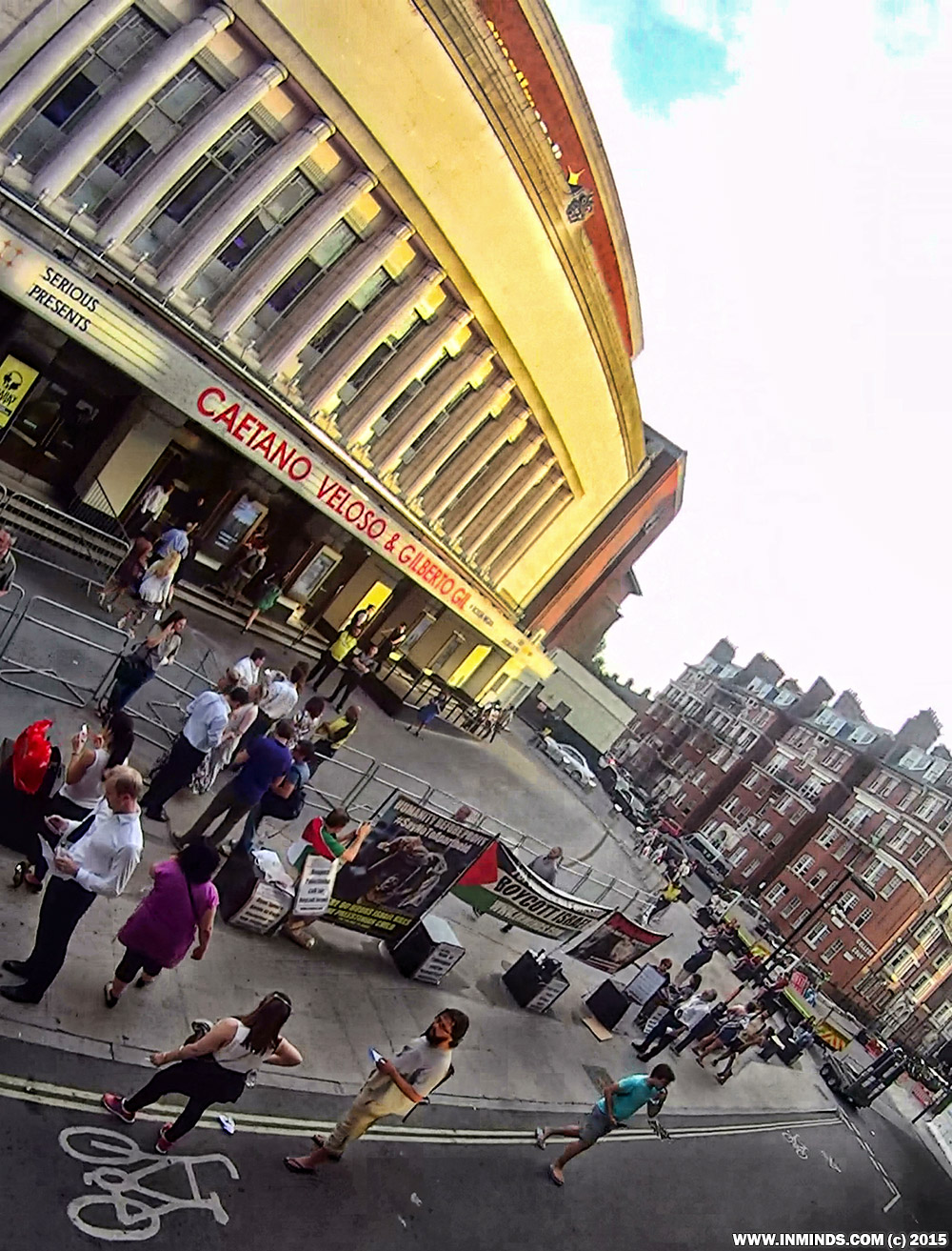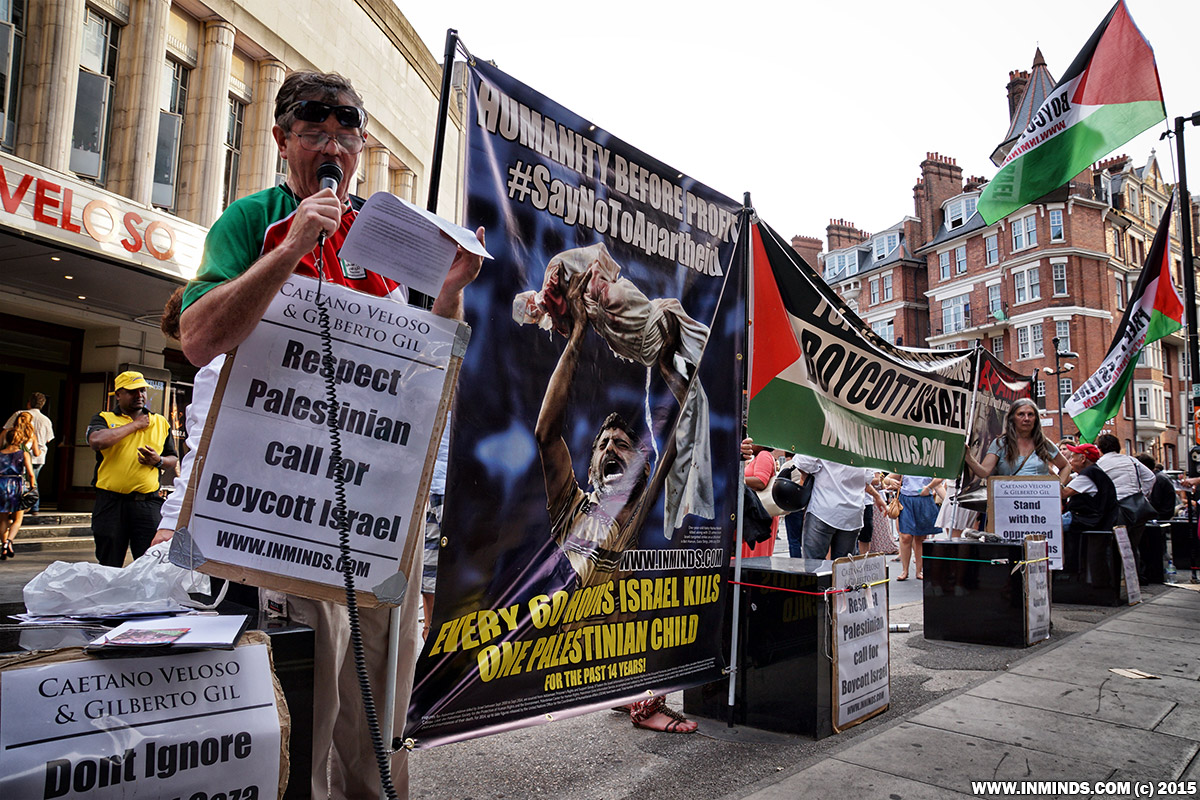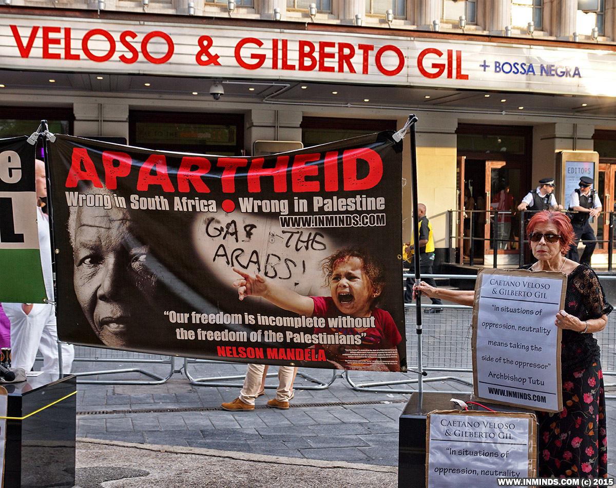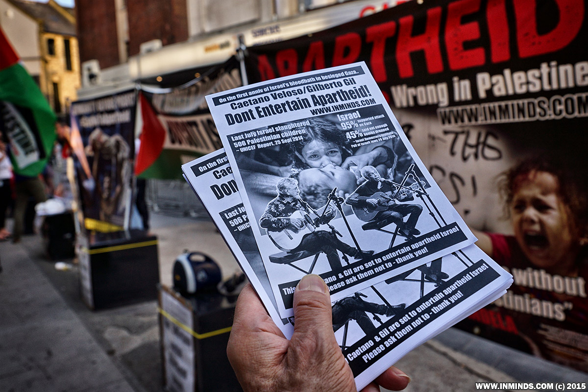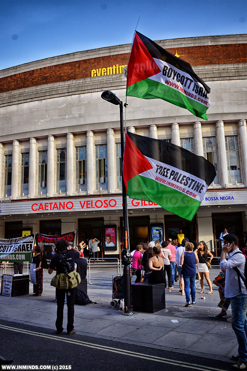 On 1st July 2015 Inminds held a protest outside the Eventim Apollo Hammersmith in London to respectfully ask leading Brazilian artists Caetano Veloso and Gilberto Gil to keep true to the anti-racist Tropicália movement they helped found, by heeding the call of the oppressed Palestinians and boycott apartheid Israel by cancelling their scheduled gig in Tel Aviv on 28th July.