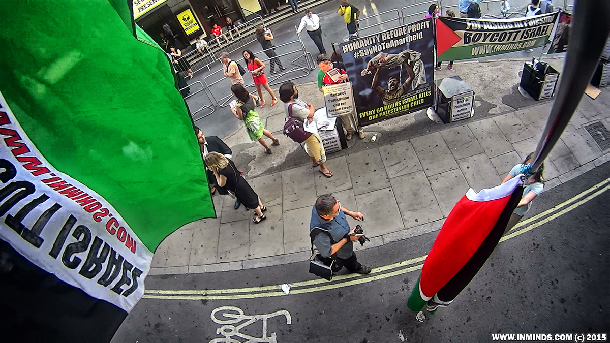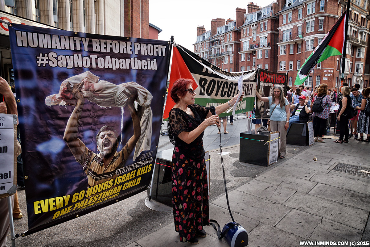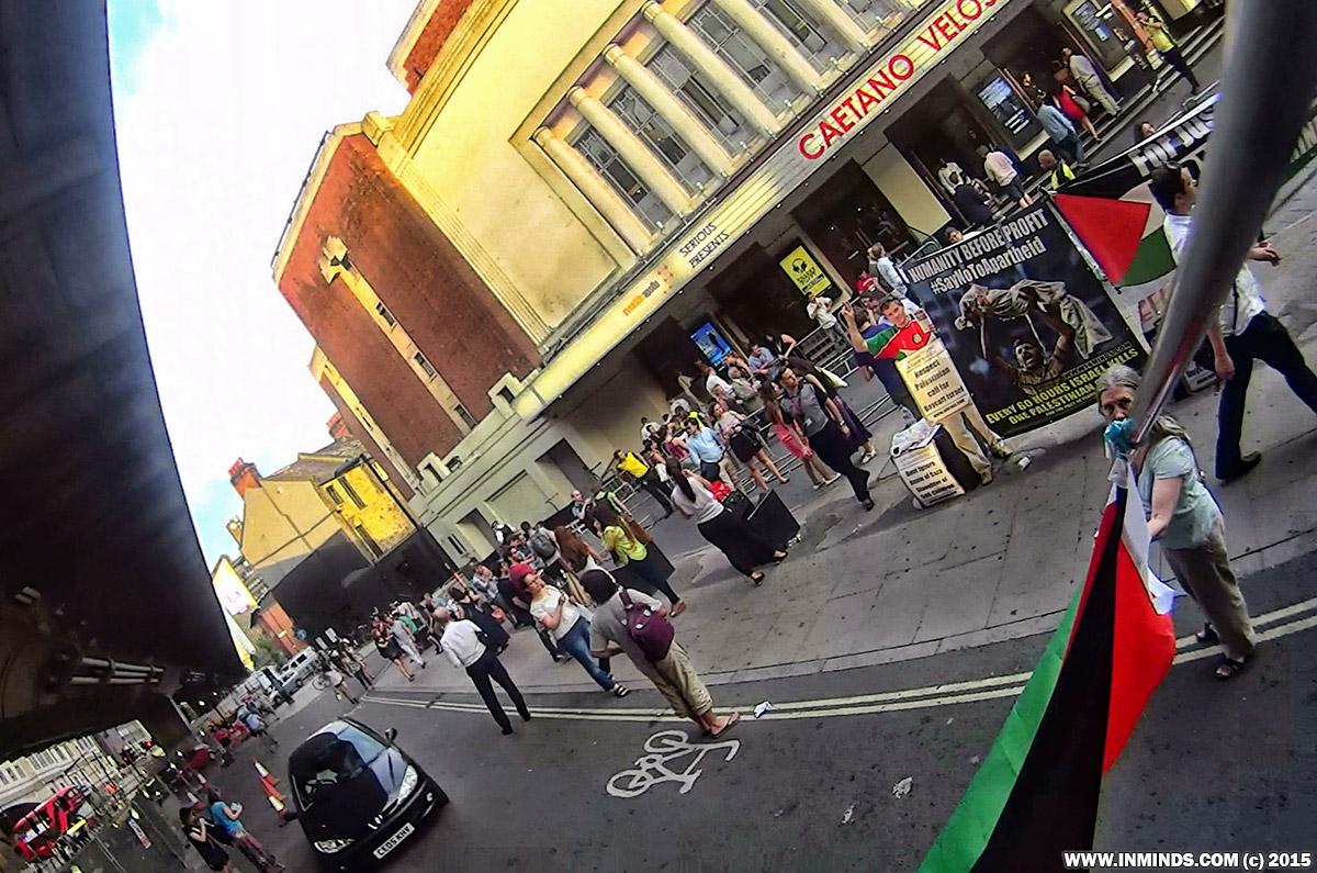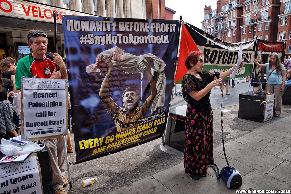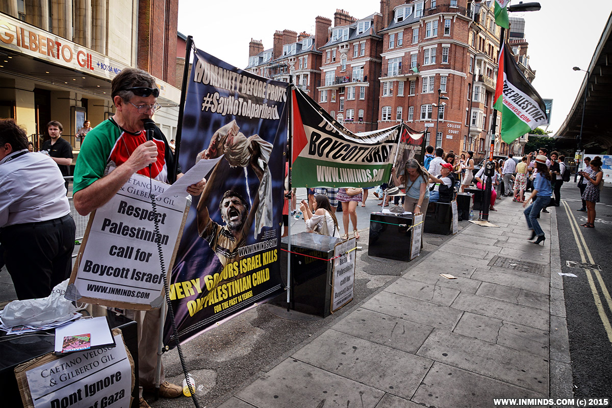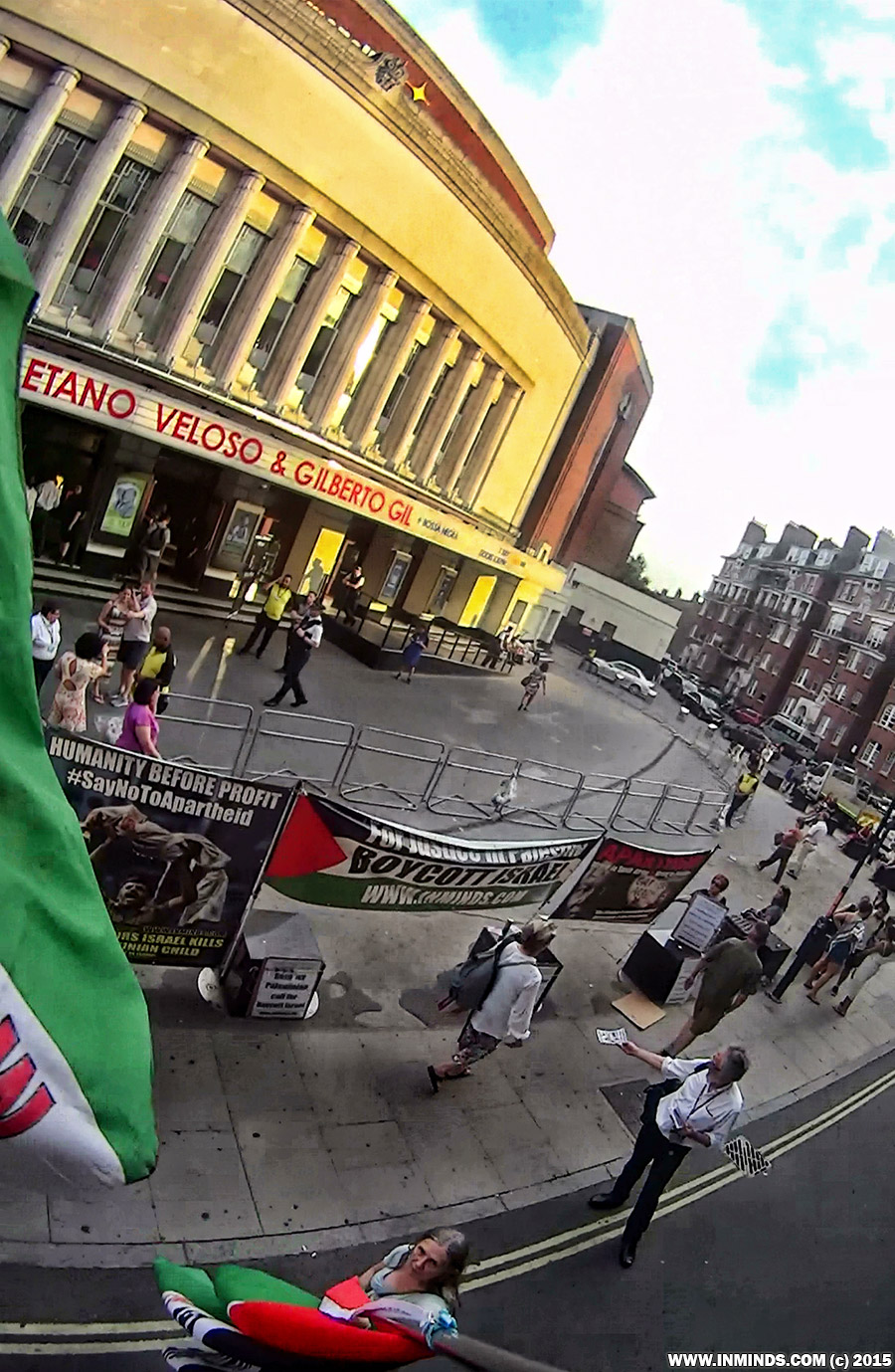 On 1st July 2015 Inminds held a protest outside the Eventim Apollo Hammersmith in London to respectfully ask leading Brazilian artists Caetano Veloso and Gilberto Gil to keep true to the anti-racist Tropicália movement they helped found, by heeding the call of the oppressed Palestinians and boycott apartheid Israel by cancelling their scheduled gig in Tel Aviv on 28th July.