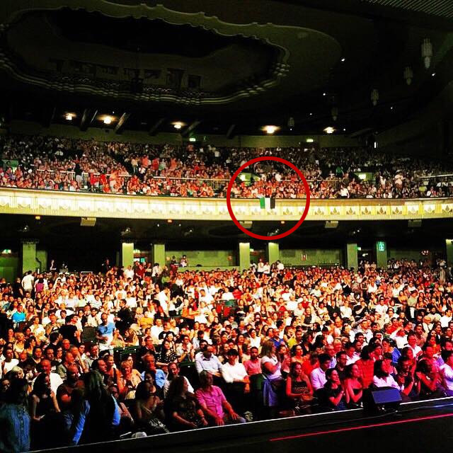 One of the fans asked if she could take one of our Palestinian flags inside to display during the concert, she even insisted making a donation which more than covered the cost of the flag. Though we didnt see her again, we noticed photos and video of the concert shot from back stage clearly shows a Palestinian flag hanging from the central circle balcony positioned right in from of the performers so they can't miss it.