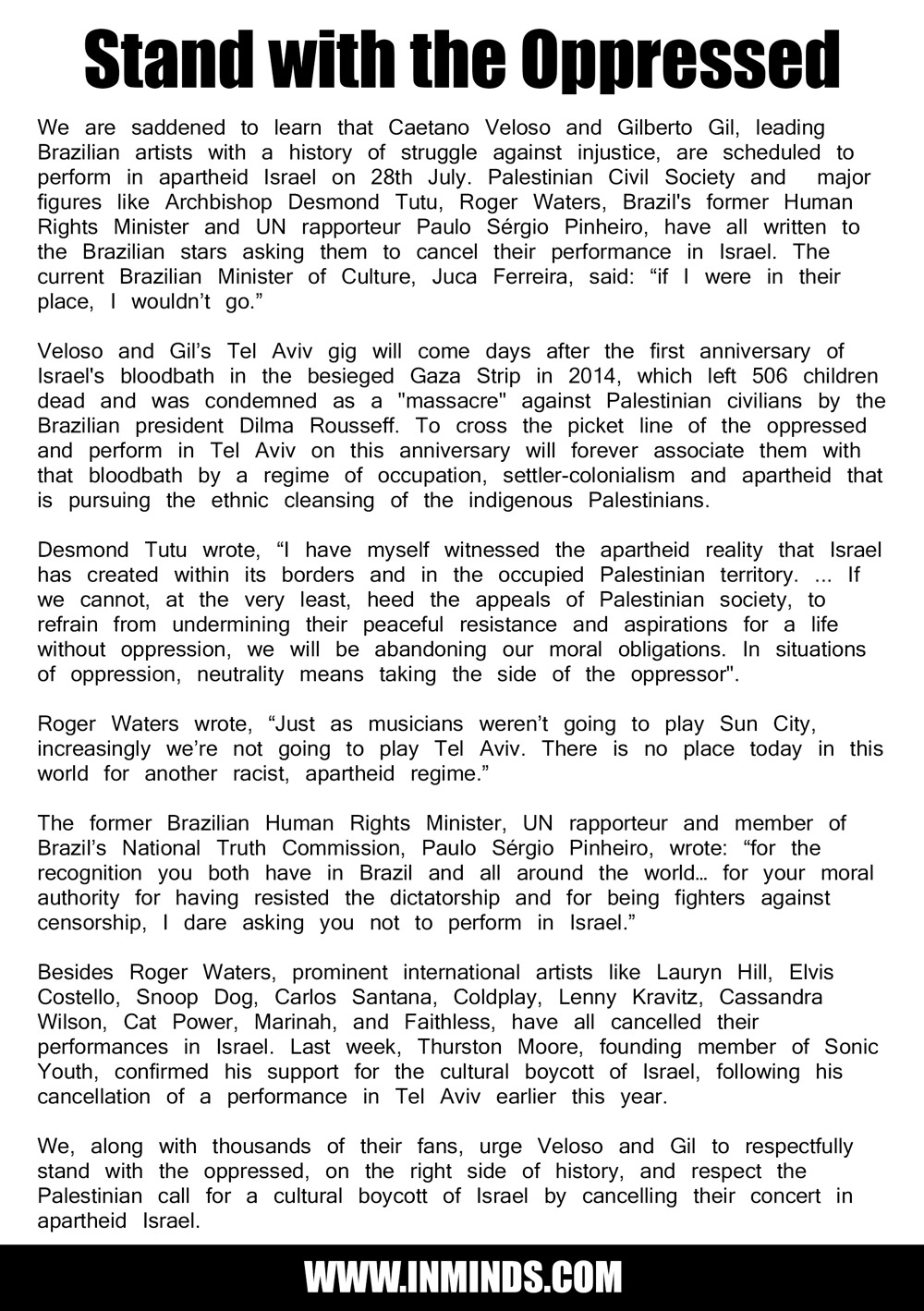 In situations of oppression, neutrality means taking the side of the oppressor". Roger Waters wrote, “Just as musicians weren’t going to play Sun City, increasingly we’re not going to play Tel Aviv. There is no place today in this world for another racist, apartheid regime.” The former Brazilian Human Rights Minister, UN rapporteur and member of Brazil’s National Truth Commission, Paulo Sérgio Pinheiro, wrote: “for the recognition you both have in Brazil and all around the world… for your moral authority for having resisted the dictatorship and for being fighters against censorship, I dare asking you not to perform in Israel.” Besides Roger Waters, prominent international artists like Lauryn Hill, Elvis Costello, Snoop Dog, Carlos Santana, Coldplay, Lenny Kravitz, Cassandra Wilson, Cat Power, Marinah, and Faithless, have all cancelled their performances in Israel. Last week, Thurston Moore, founding member of Sonic Youth, confirmed his support for the cultural boycott of Israel, following his cancellation of a performance in Tel Aviv earlier this year. We, along with thousands of their fans, urge Veloso and Gil to respectfully stand with the oppressed, on the right side of history, and respect the Palestinian call for a cultural boycott of Israel by cancelling their concert in apartheid Israel.