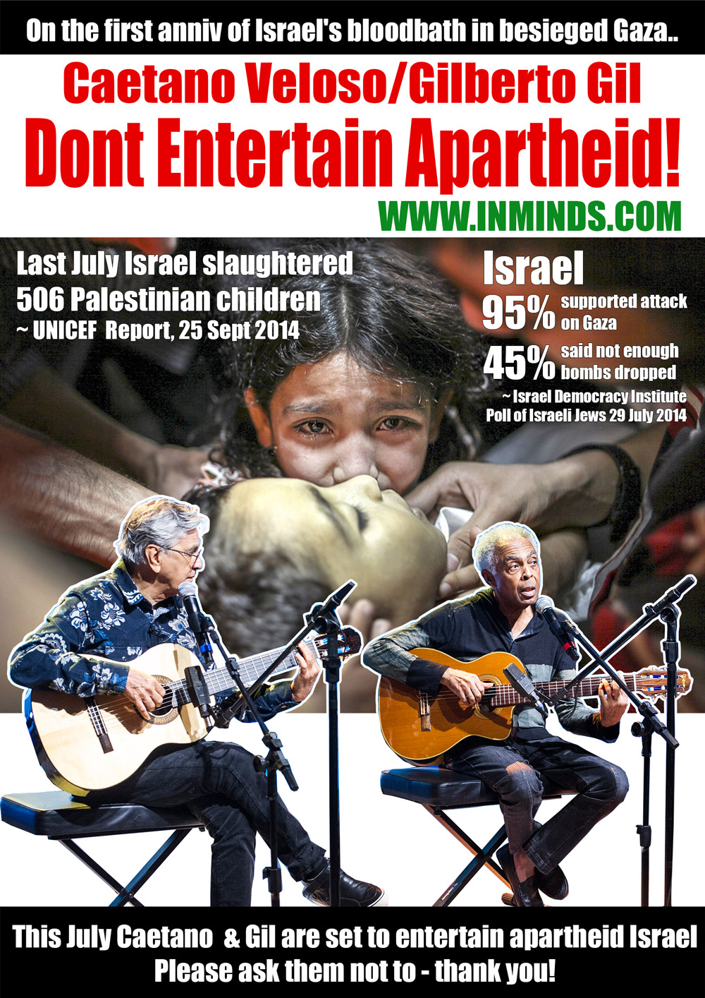 Dear Gilberto and Caetano, 'The imprisoned and the dead' reach out, please, join us in this by cancelling your gig in Israel.