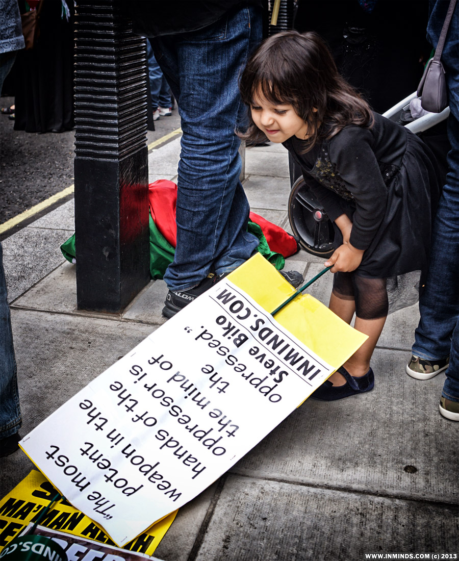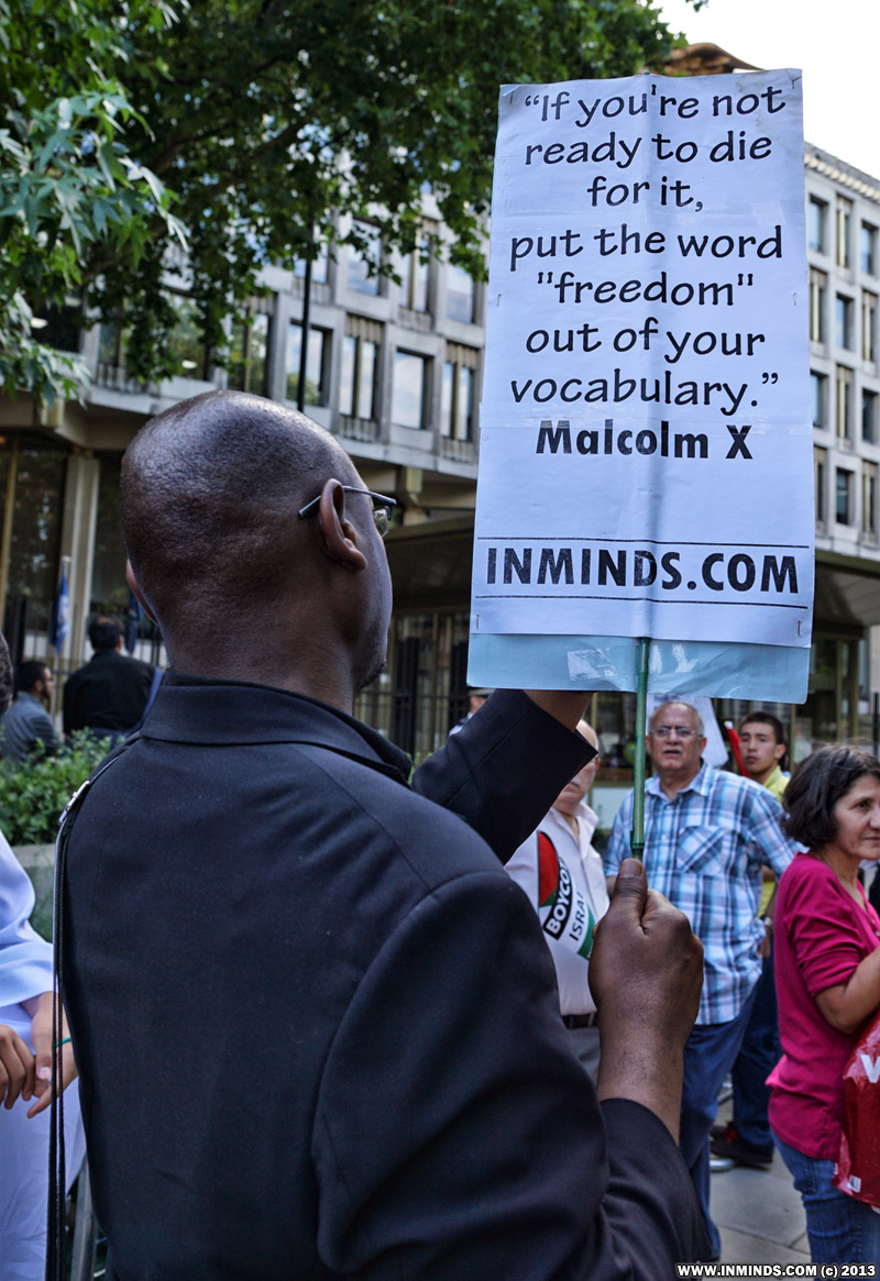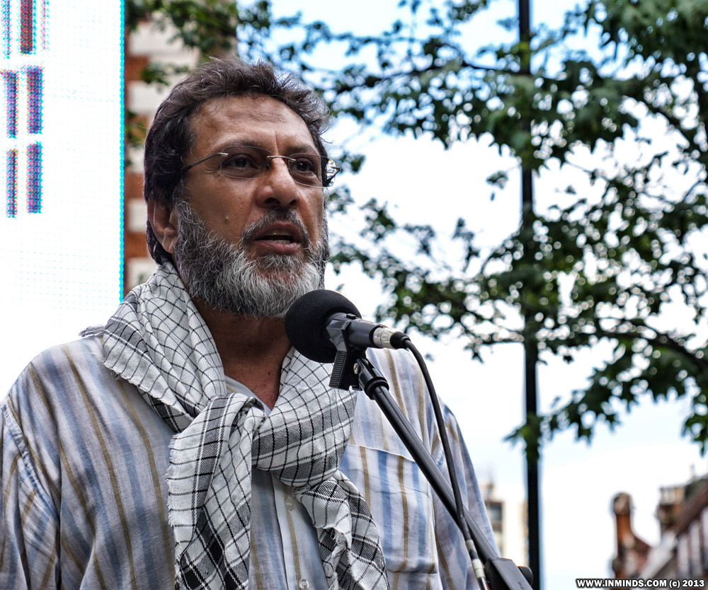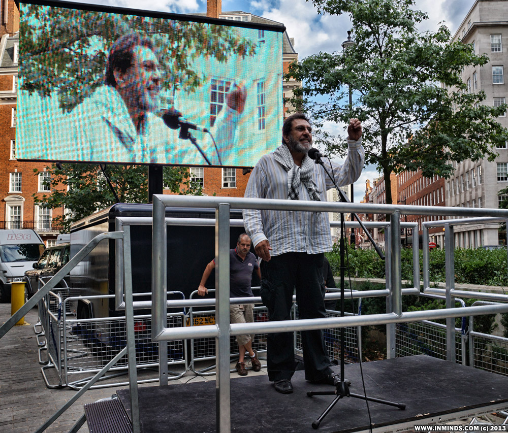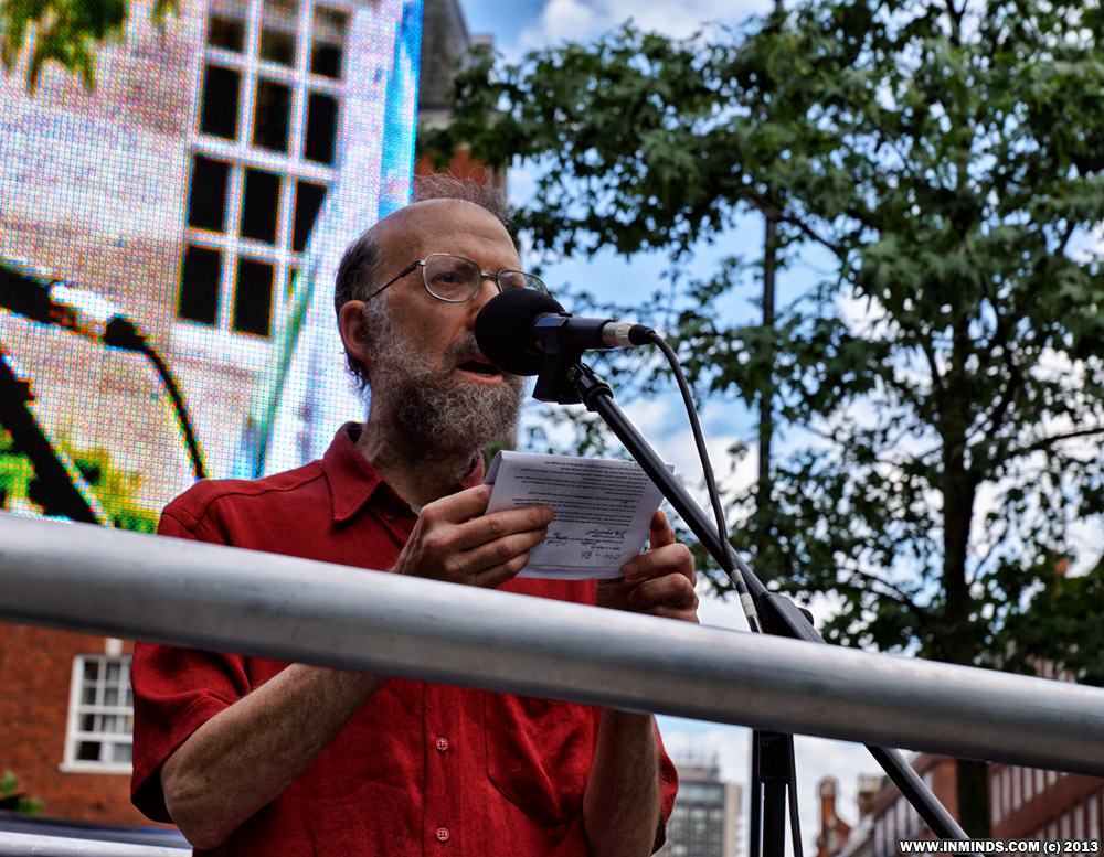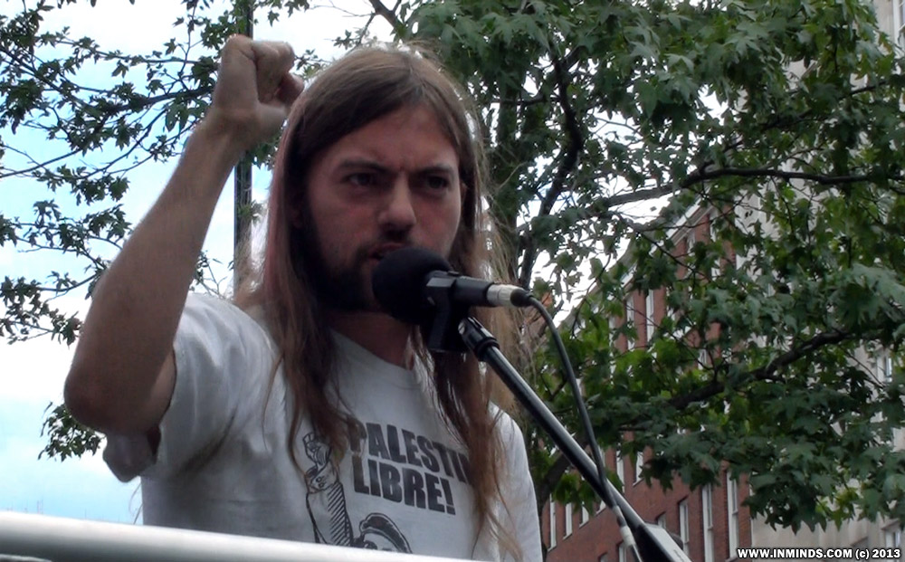 "You cannot simplify the question of violence.. You look at human history - the American revolution, the civil war, the end of slavery in the United States, the African National Congress, the end of colonialism - by and large these were some combination of popular social uprisings and social movements and non-violent protests AND armed resistance. Now that doesn't mean I'm advocating for any armed action today, I'm not. I'm committed to finding ways of acting and speaking and making people laugh and doing art and disrupting the war machine in other ways, but I think focusing on violence when we have the comfort of being protected by mass of armed violence is not non-violence at all.. if you are pointing to the mass of violence and who's doing the mass of violence in the world today, you have to look to state violence - that's people bombing whole cities from the air.. "
