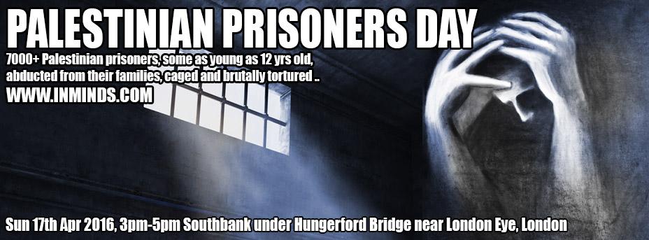Please join us commemorate Palestinian Prisoners Day, on Sunday 17th April, to show solidarity with the 7000+ Palestinian prisoners, some as young as 12 years old, that have been abducted from their families by an illegal invading army of occupation, and caged in the most horrendous conditions, being brutally tortured to systematically extract false confessions to sustain a 99.7% conviction rate in Israel's military kangaroo courts.
