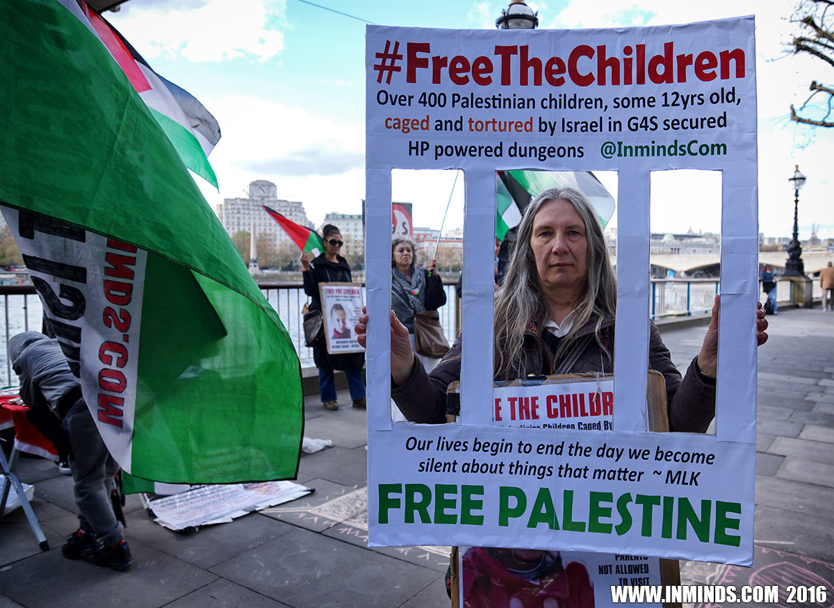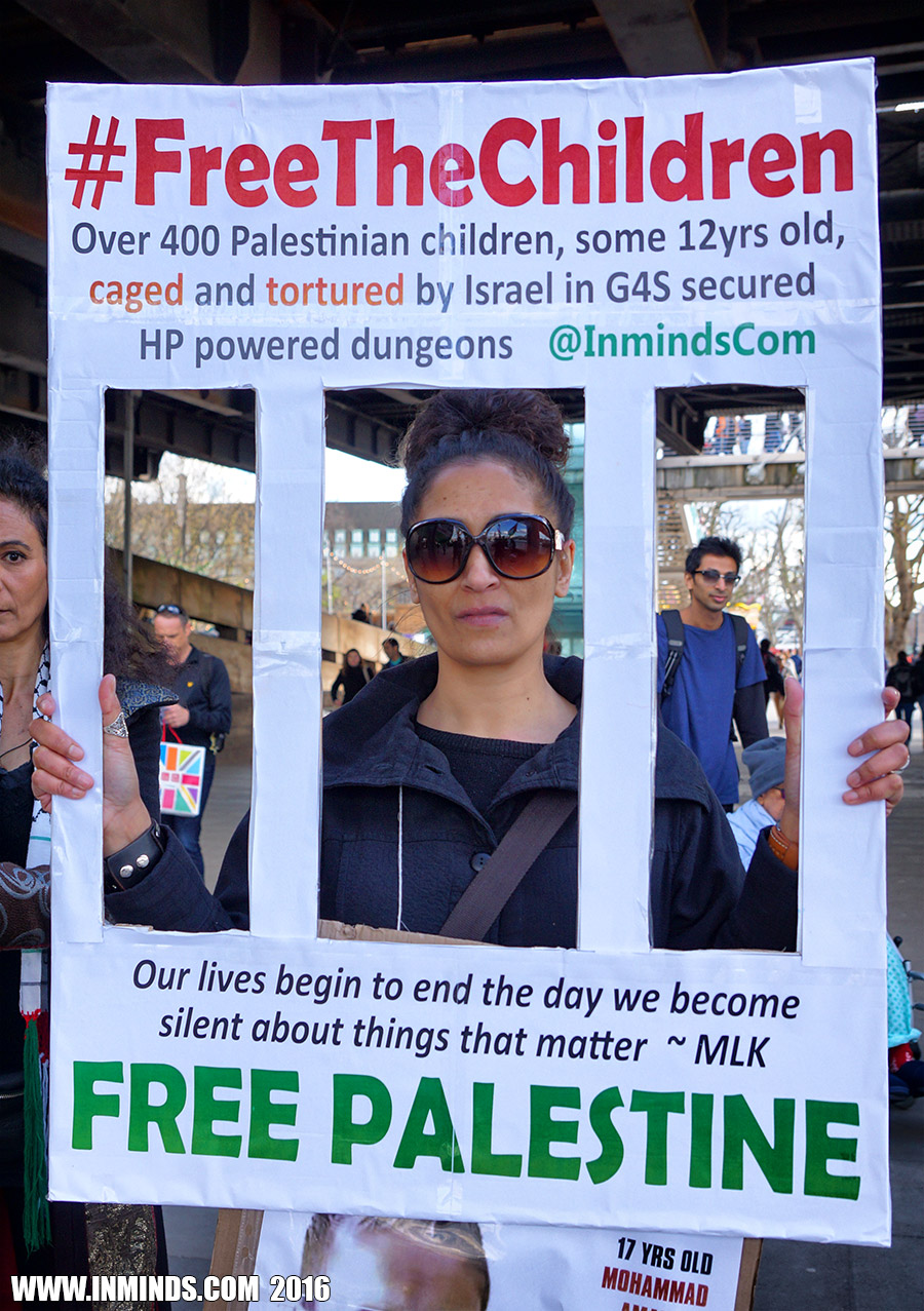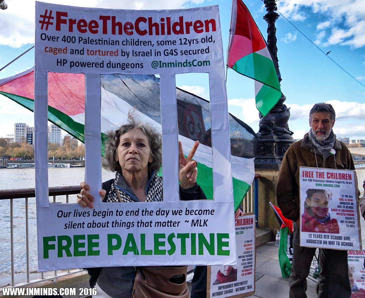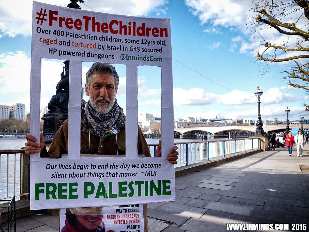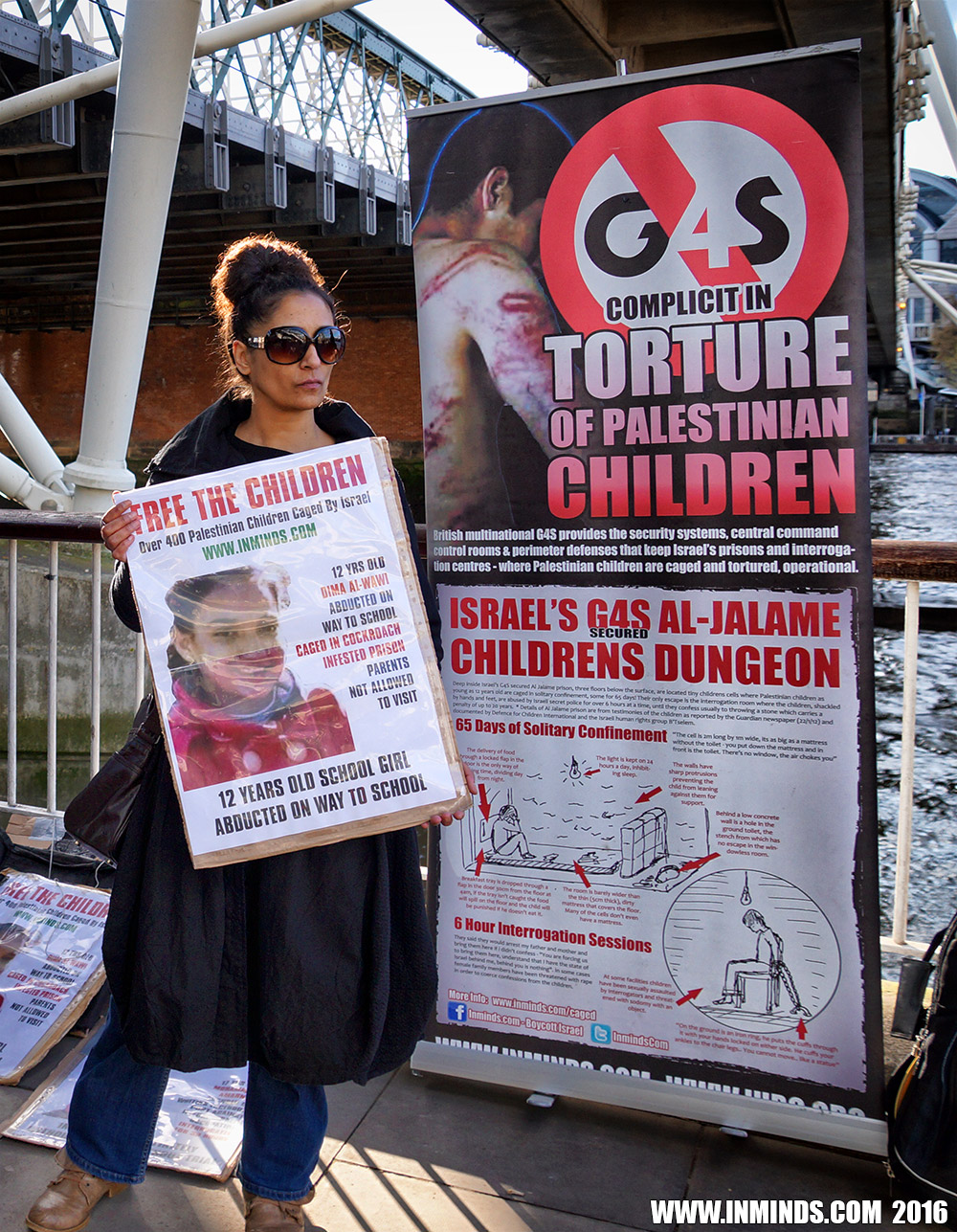 inminds 28 April 2016 On the international day of solidarity for Palestinian Prisoners, Sunday 17th April, activists from Inminds human rights group took to the South Bank of the River Thames to educate the public on the issue of Palestinian political prisoners, in particular child prisoners, which according to the UN are routinely tortured, and the role British companies like G4S play in those human rights abuses.