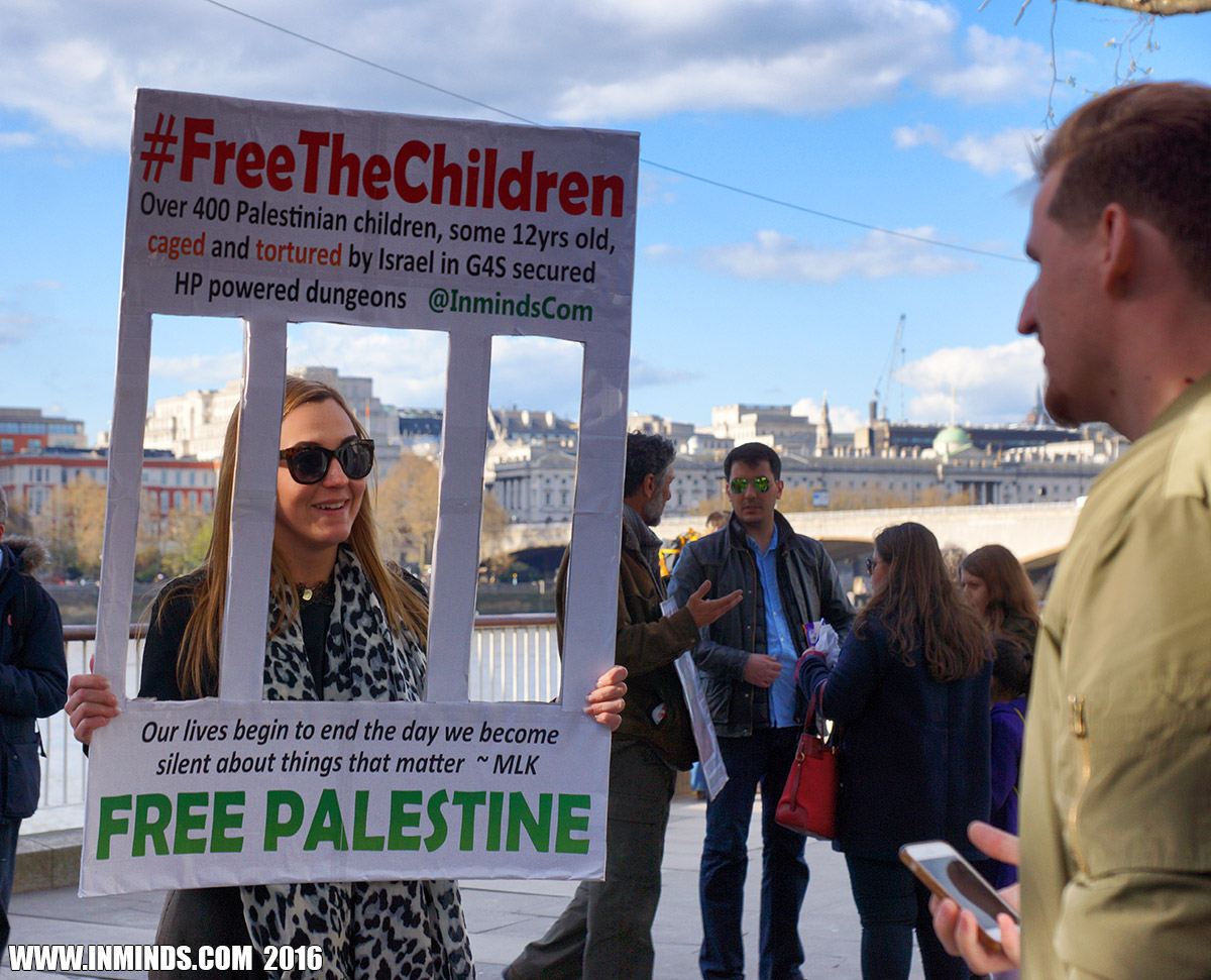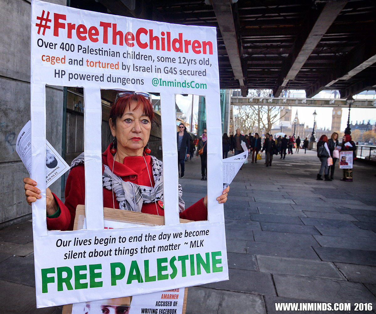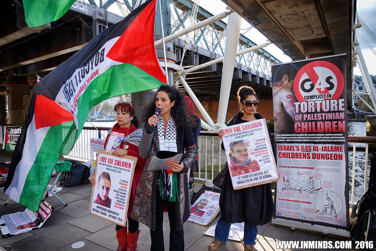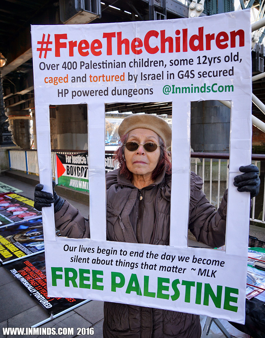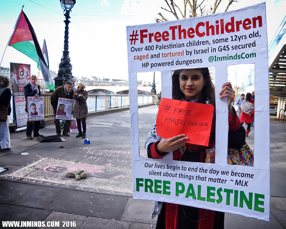 inminds 28 April 2016 On the international day of solidarity for Palestinian Prisoners, Sunday 17th April, activists from Inminds human rights group took to the South Bank of the River Thames to educate the public on the issue of Palestinian political prisoners, in particular child prisoners, which according to the UN are routinely tortured, and the role British companies like G4S play in those human rights abuses.