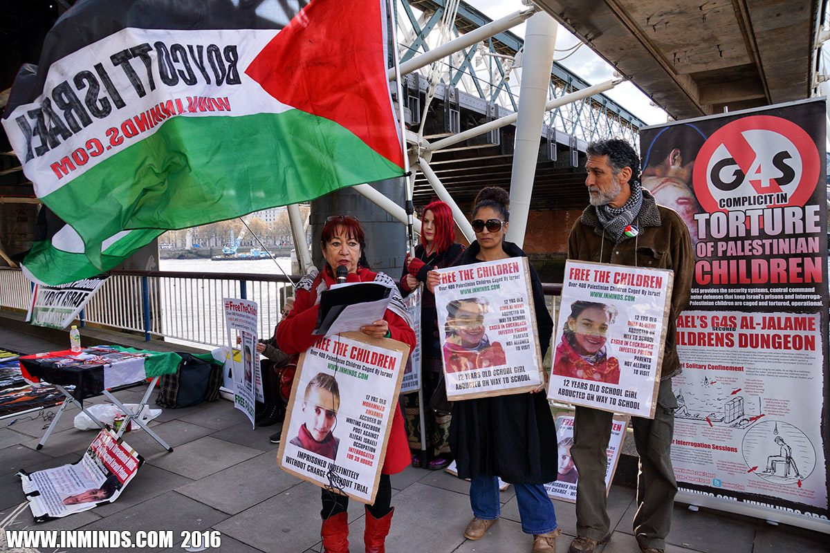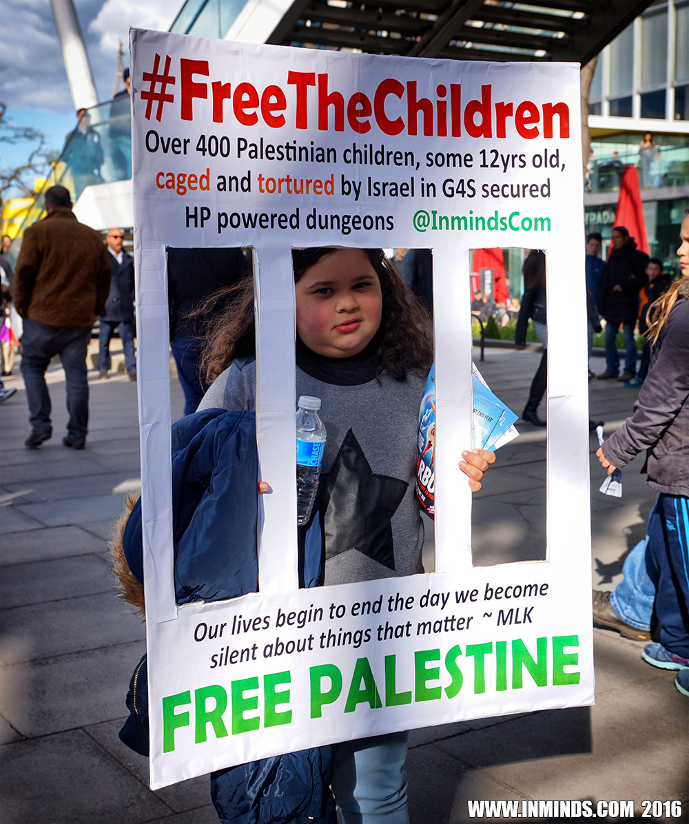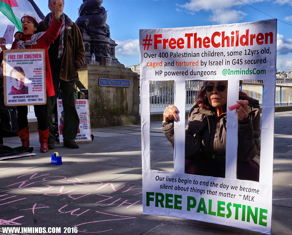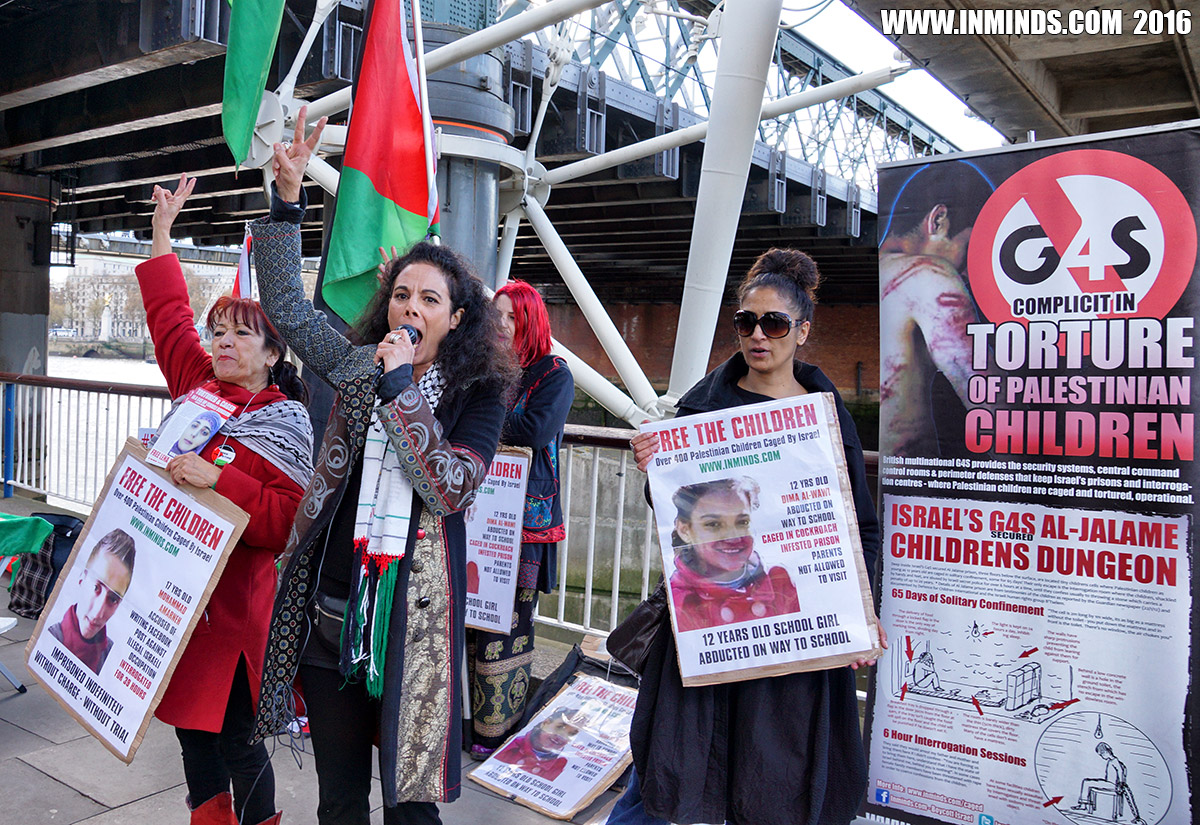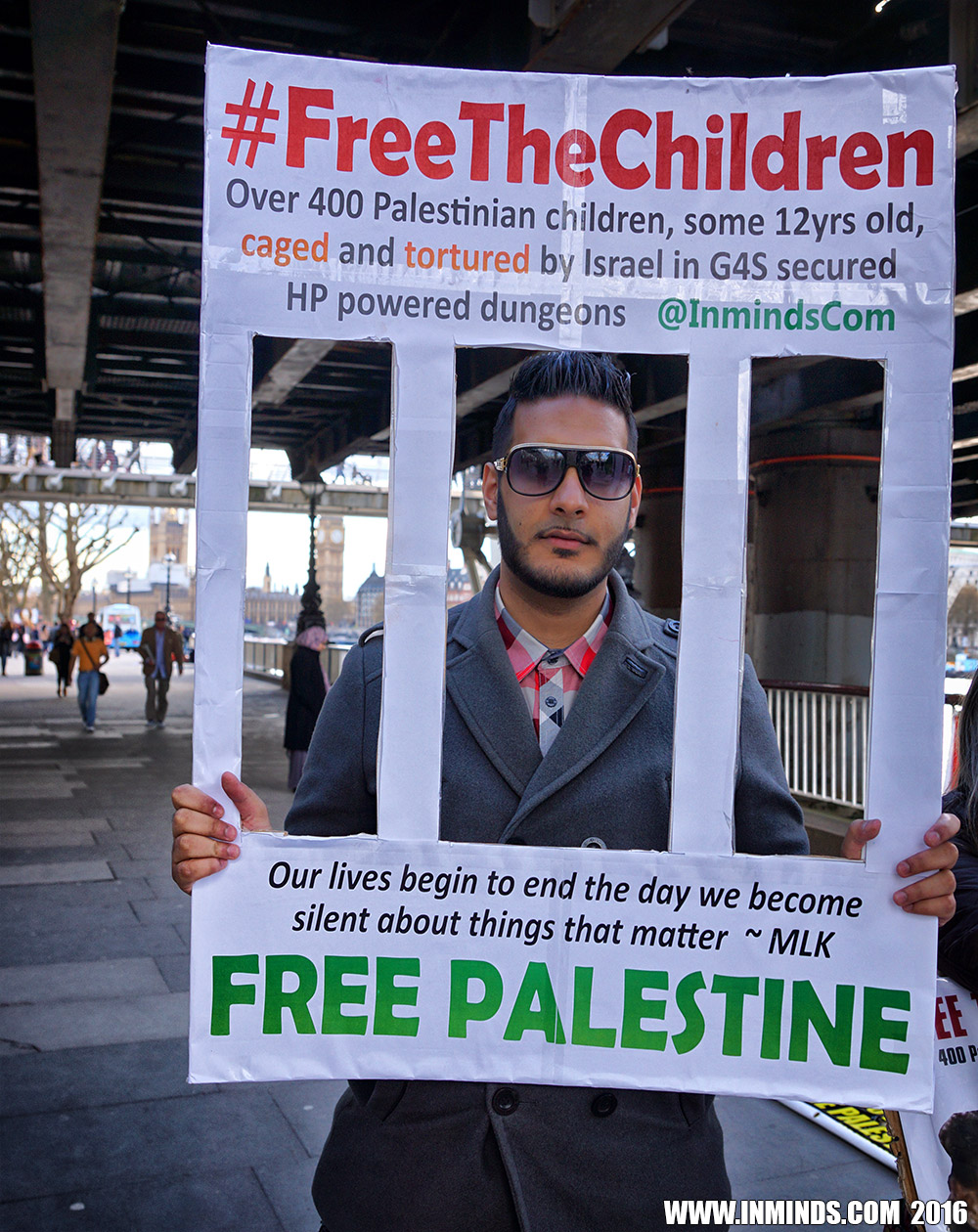 inminds 28 April 2016 On the international day of solidarity for Palestinian Prisoners, Sunday 17th April, activists from Inminds human rights group took to the South Bank of the River Thames to educate the public on the issue of Palestinian political prisoners, in particular child prisoners, which according to the UN are routinely tortured, and the role British companies like G4S play in those human rights abuses.