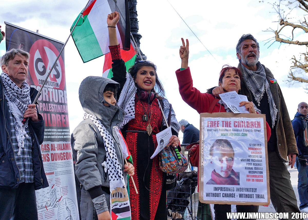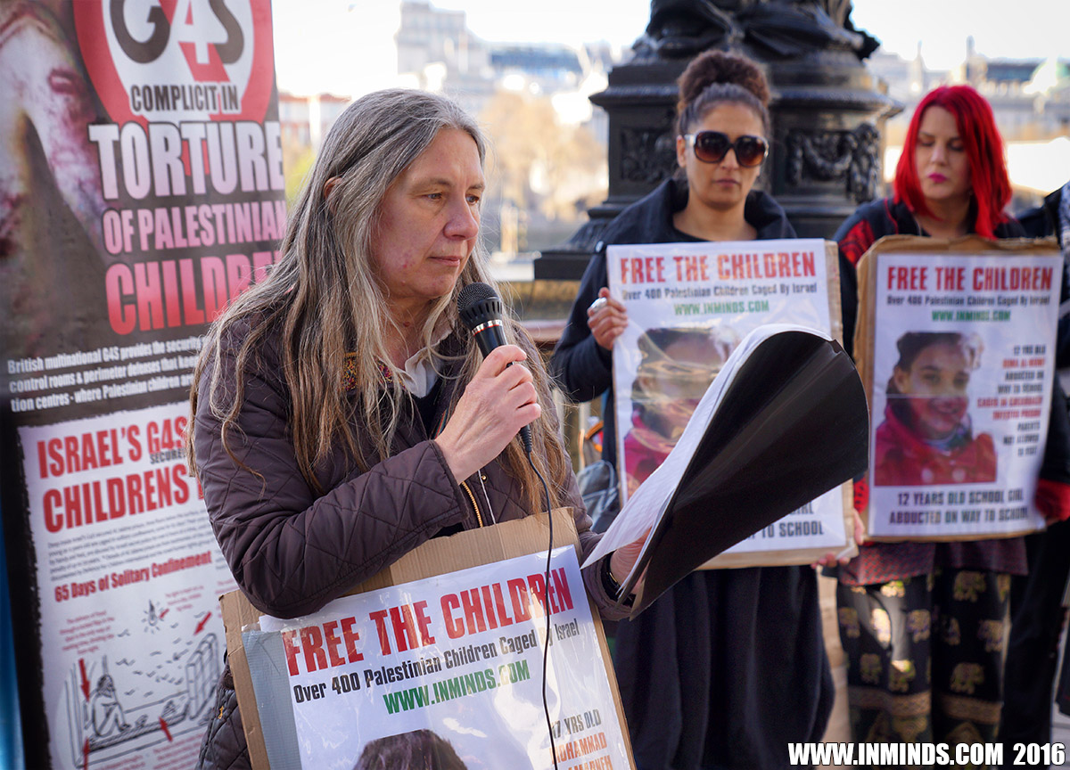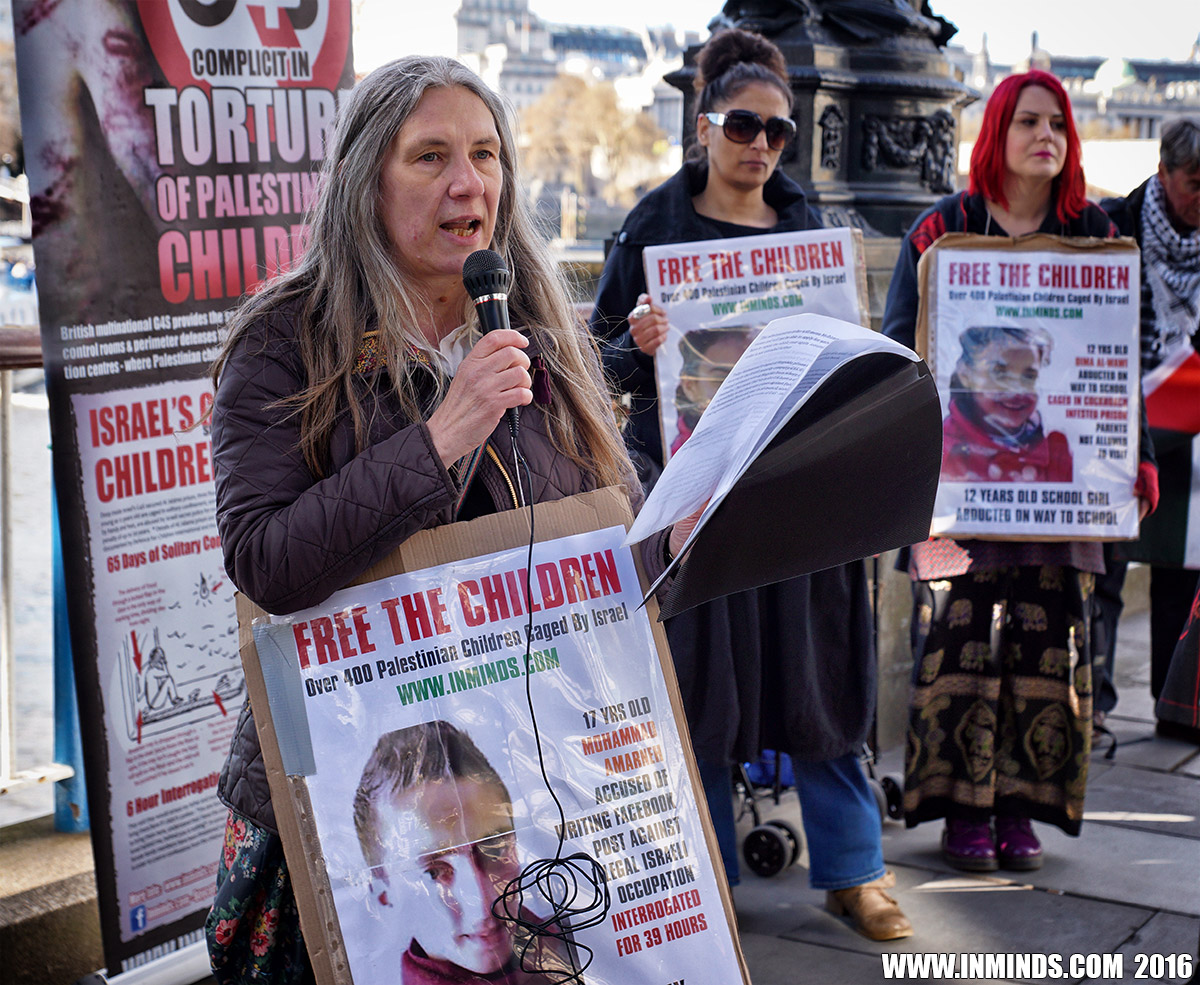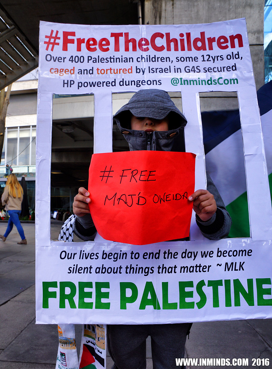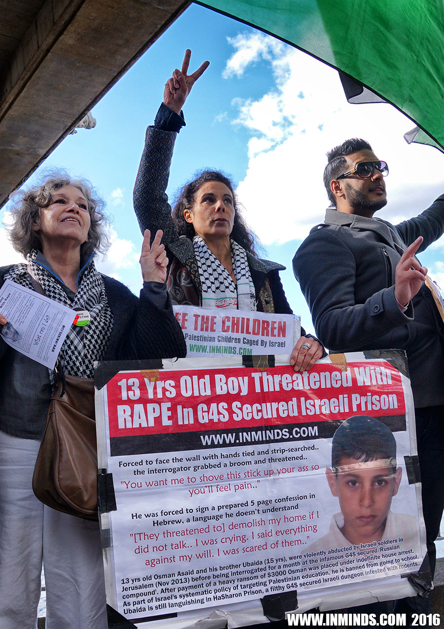 Inminds chair Abbas Ali said "Today there are over 400 Palestinian children, some as young as 12 years old, caged in Israeli dungeons. We have spoken to parents who tell us their sons were tortured, that in order to force confessions out of the children the Israeli interrogators even threatened to rape family members. We want to tell the British public that we in the UK have a direct responsibility to stop these human rights abuses because its a British company, G4S, that secures those dungeons, and its Hewlett Packard, which operates in the UK, that provides the IT systems and services that keep those prisons operational. They are committing war crimes in our name."