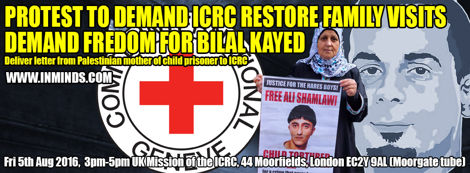 On Friday 5th August 2016 Inminds human rights group will protest outside the the UK Mission of the International Committee of the Red Cross in London to demand it restore the twice-monthly family visits for Palestinian political prisoners which were cut last month to just once monthly.