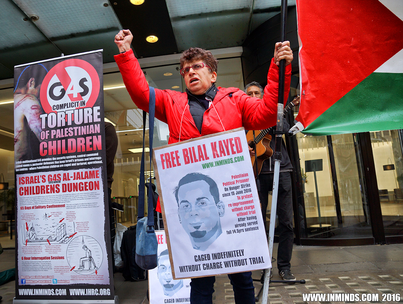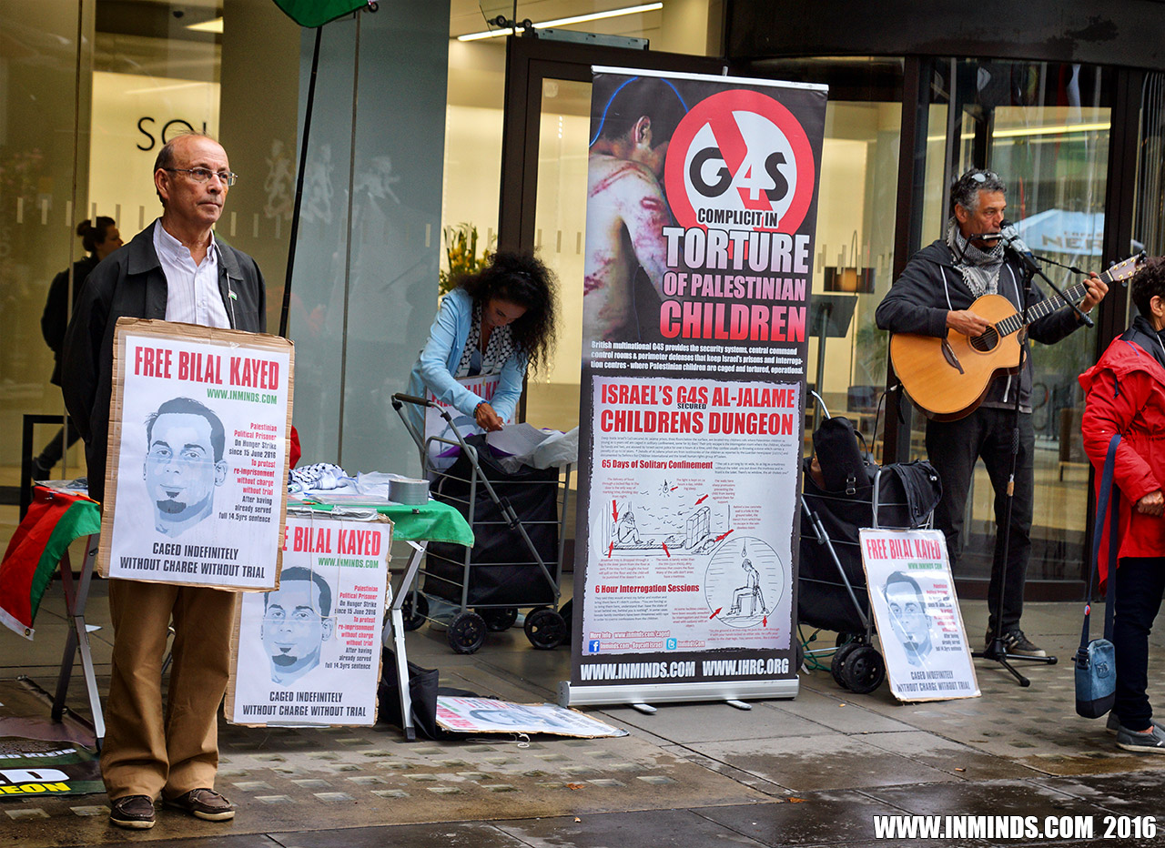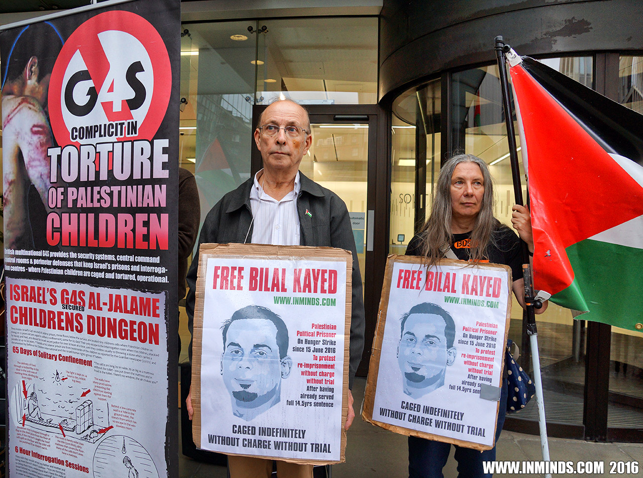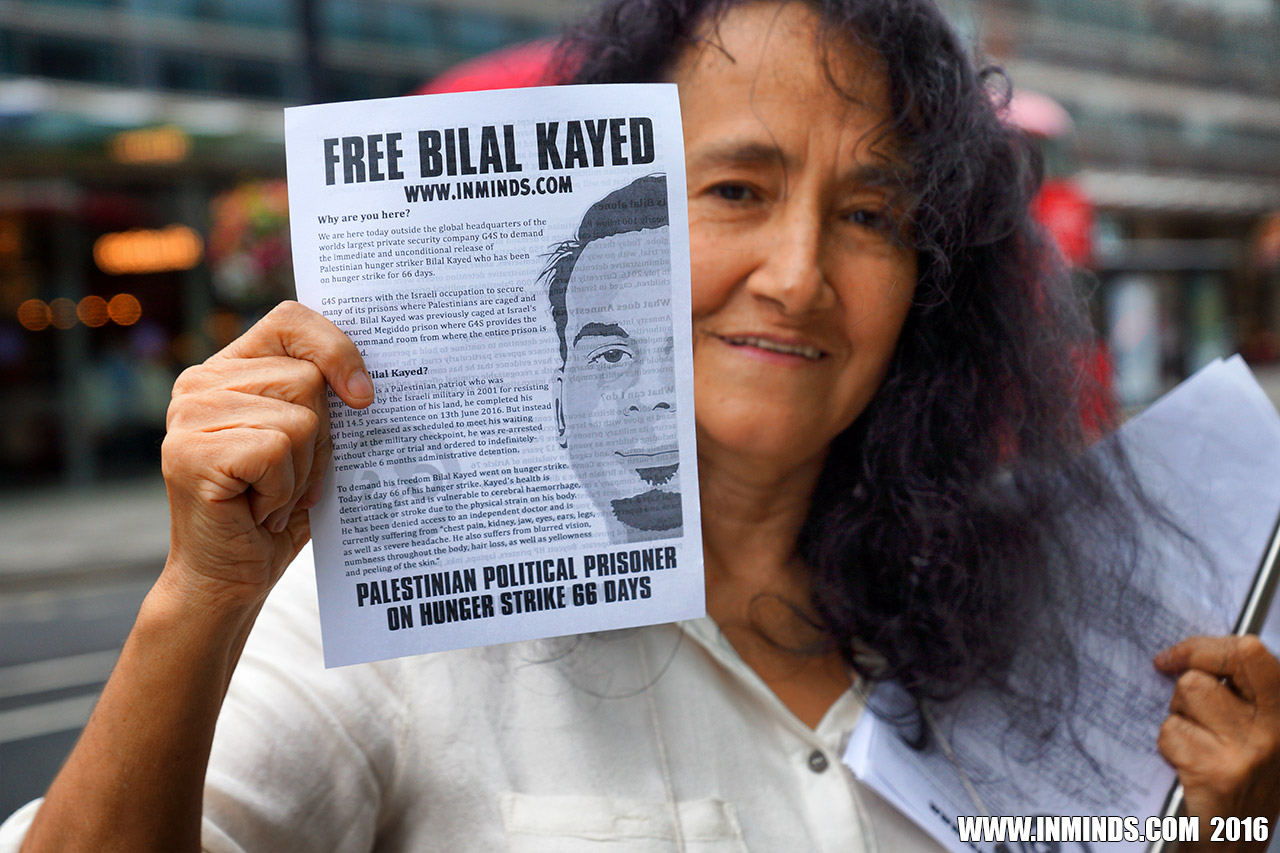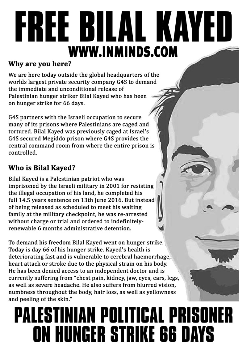 inminds 20 August 2016 On Friday 19th August 2016 Inminds human rights group protested outside the global headquarters of the worlds largest private security company G4S in Victoria, London to demand the immediate and unconditional release of Palestinian hunger striker Bilal Kayed who had been on hunger strike for 66 days. Inminds also demanded an end to Israel's illegal policy of punitive Administrative Detention whereby Palestinians like Bilal Kayed are caged without charge or trial for an indefinite period of time with no means to defend themselves.