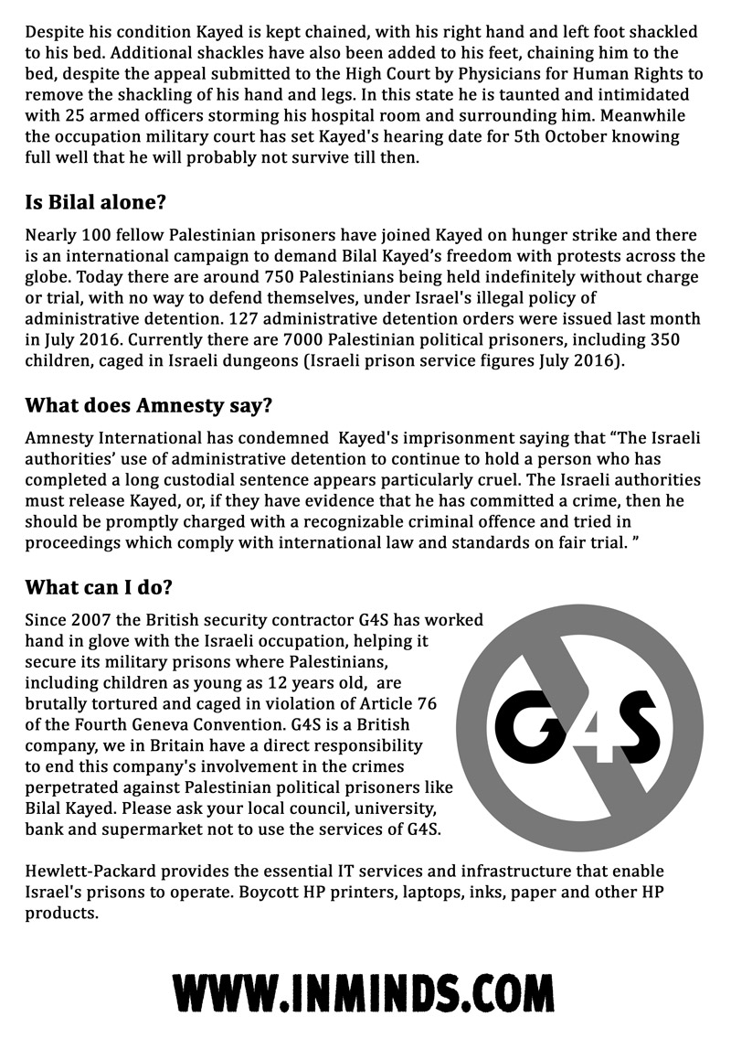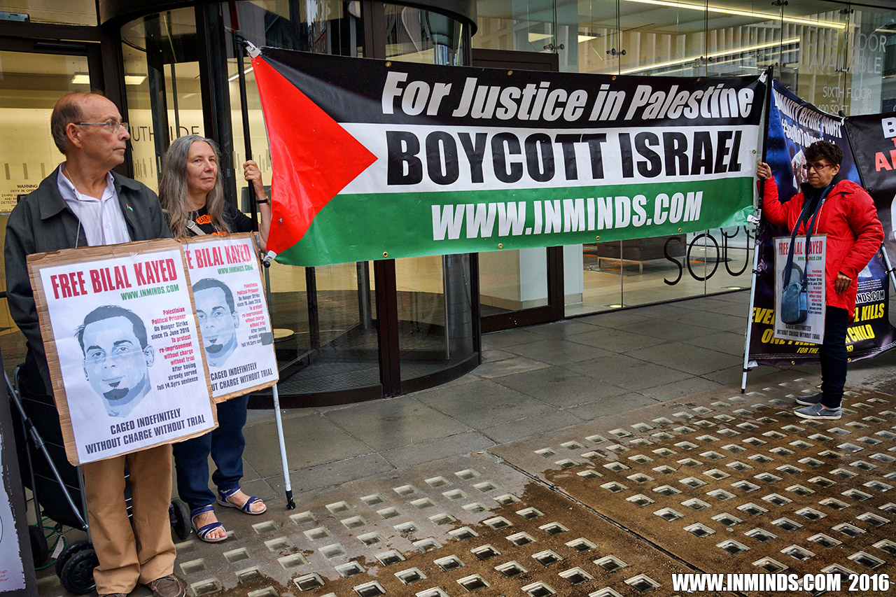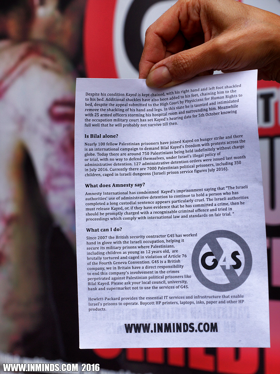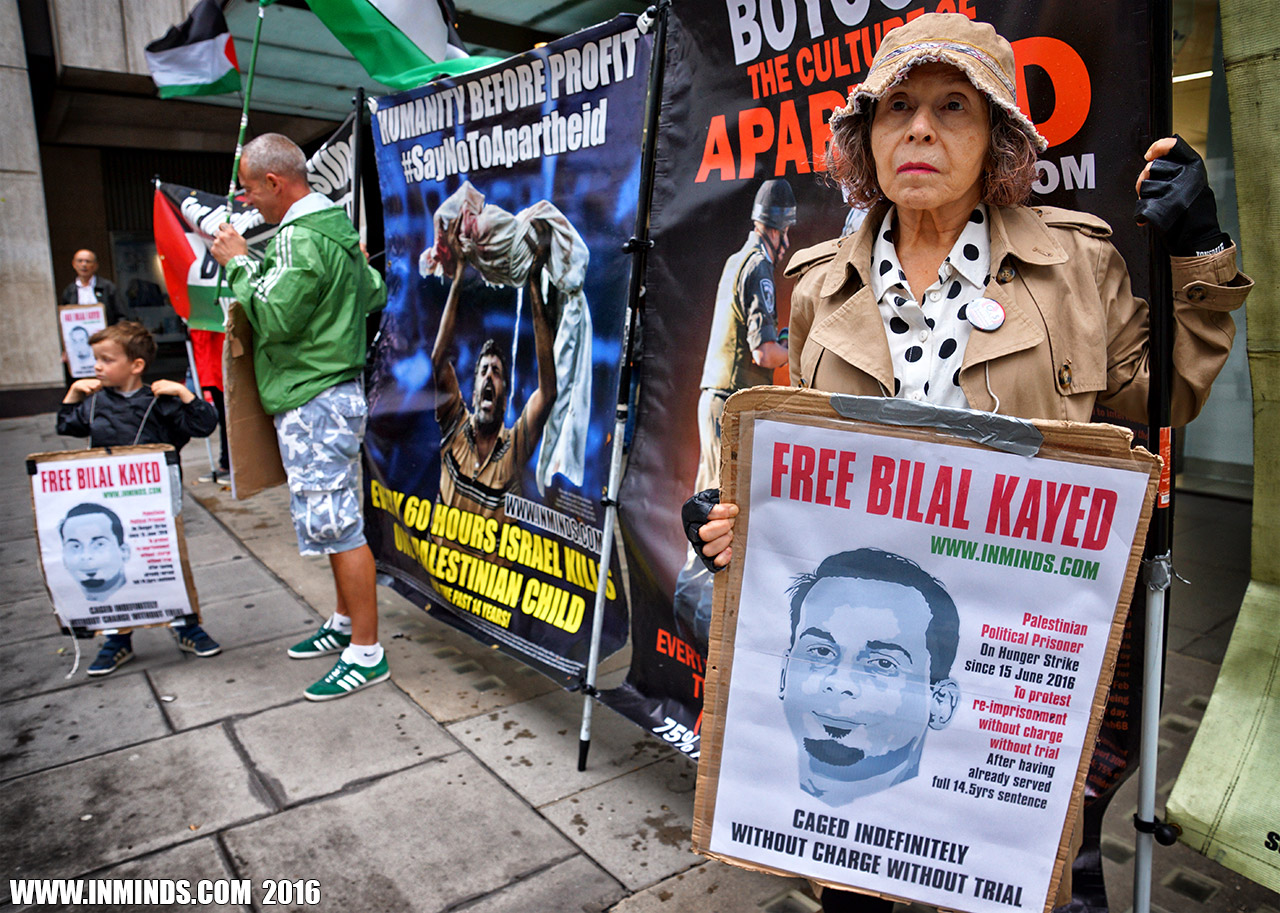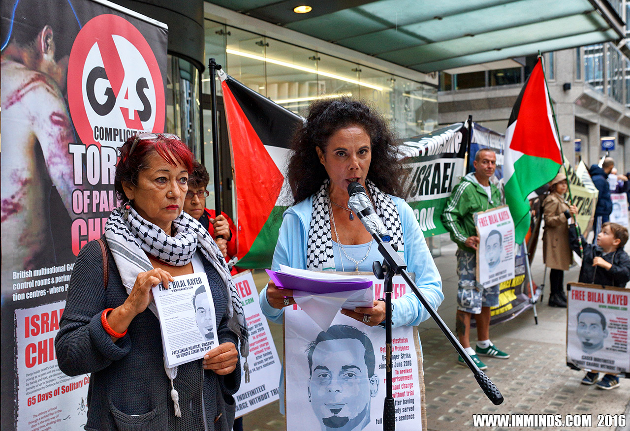 inminds 20 August 2016 On Friday 19th August 2016 Inminds human rights group protested outside the global headquarters of the worlds largest private security company G4S in Victoria, London to demand the immediate and unconditional release of Palestinian hunger striker Bilal Kayed who had been on hunger strike for 66 days. Inminds also demanded an end to Israel's illegal policy of punitive Administrative Detention whereby Palestinians like Bilal Kayed are caged without charge or trial for an indefinite period of time with no means to defend themselves.