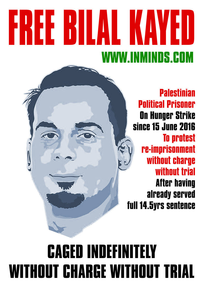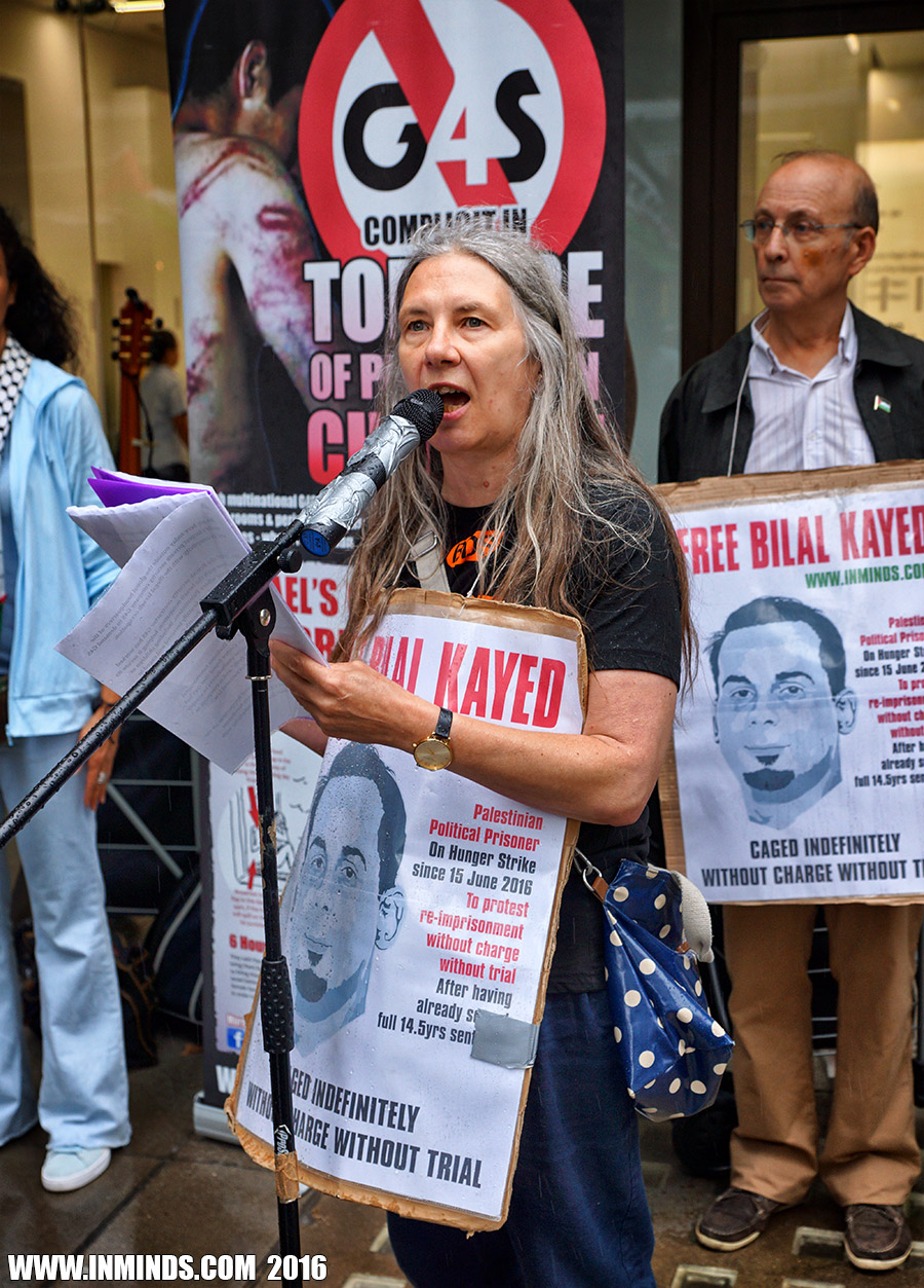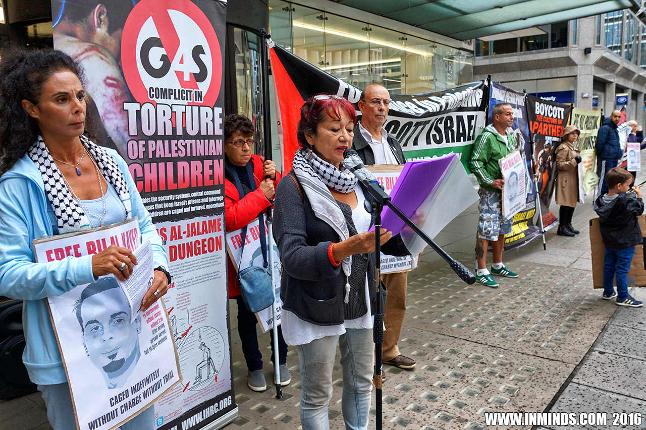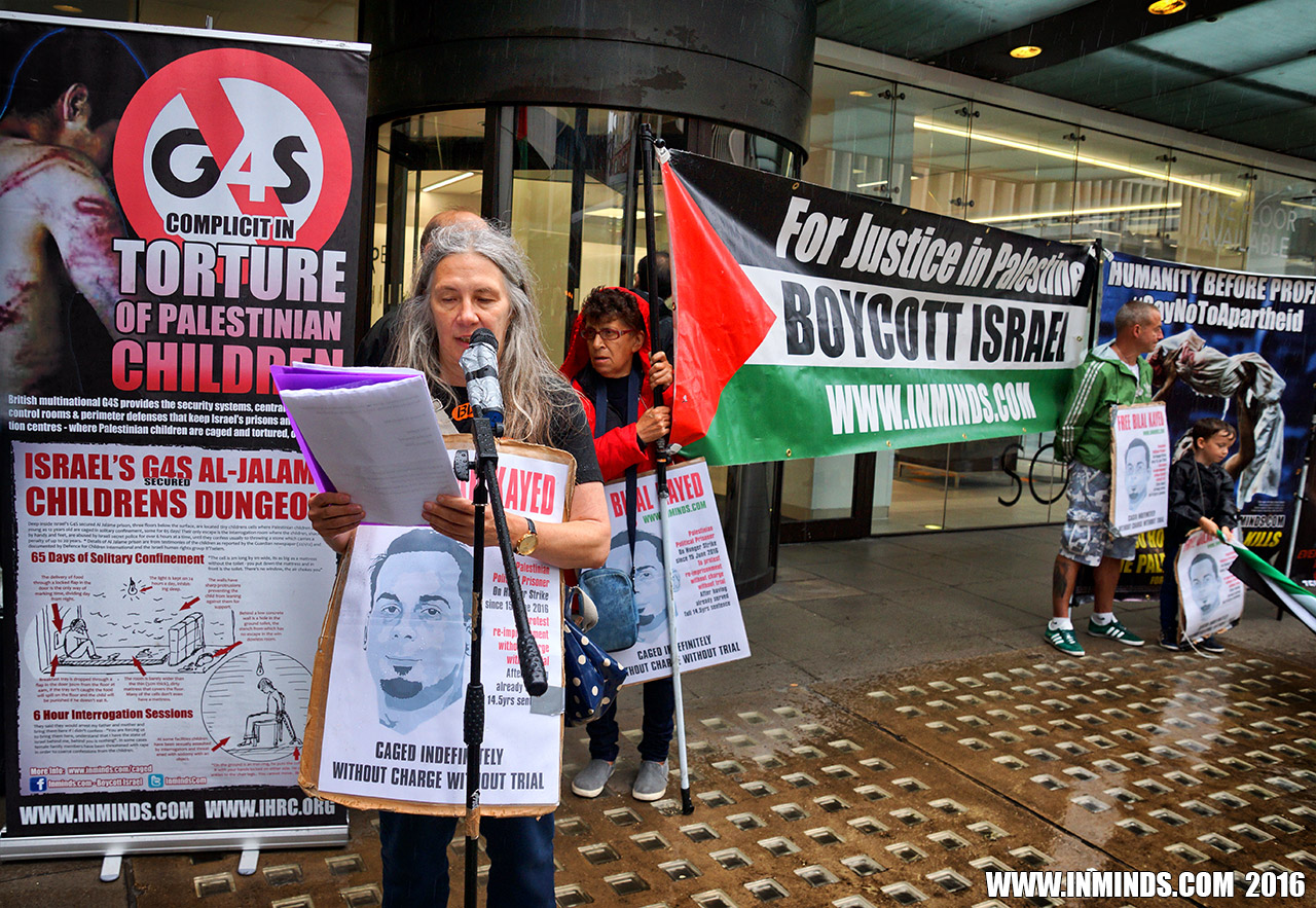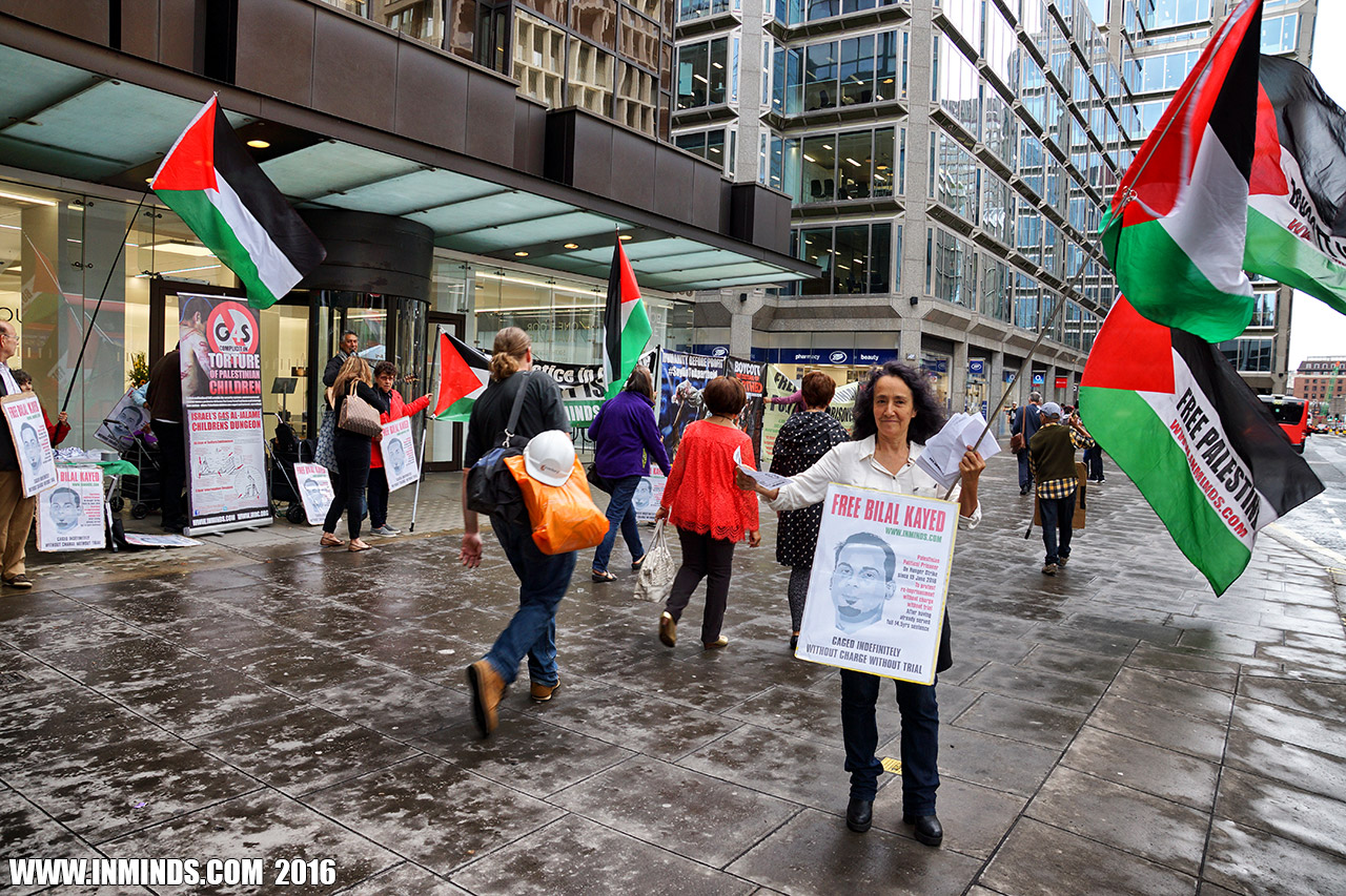inminds 20 August 2016 On Friday 19th August 2016 Inminds human rights group protested outside the global headquarters of the worlds largest private security company G4S in Victoria, London to demand the immediate and unconditional release of Palestinian hunger striker Bilal Kayed who had been on hunger strike for 66 days. Inminds also demanded an end to Israel's illegal policy of punitive Administrative Detention whereby Palestinians like Bilal Kayed are caged without charge or trial for an indefinite period of time with no means to defend themselves.