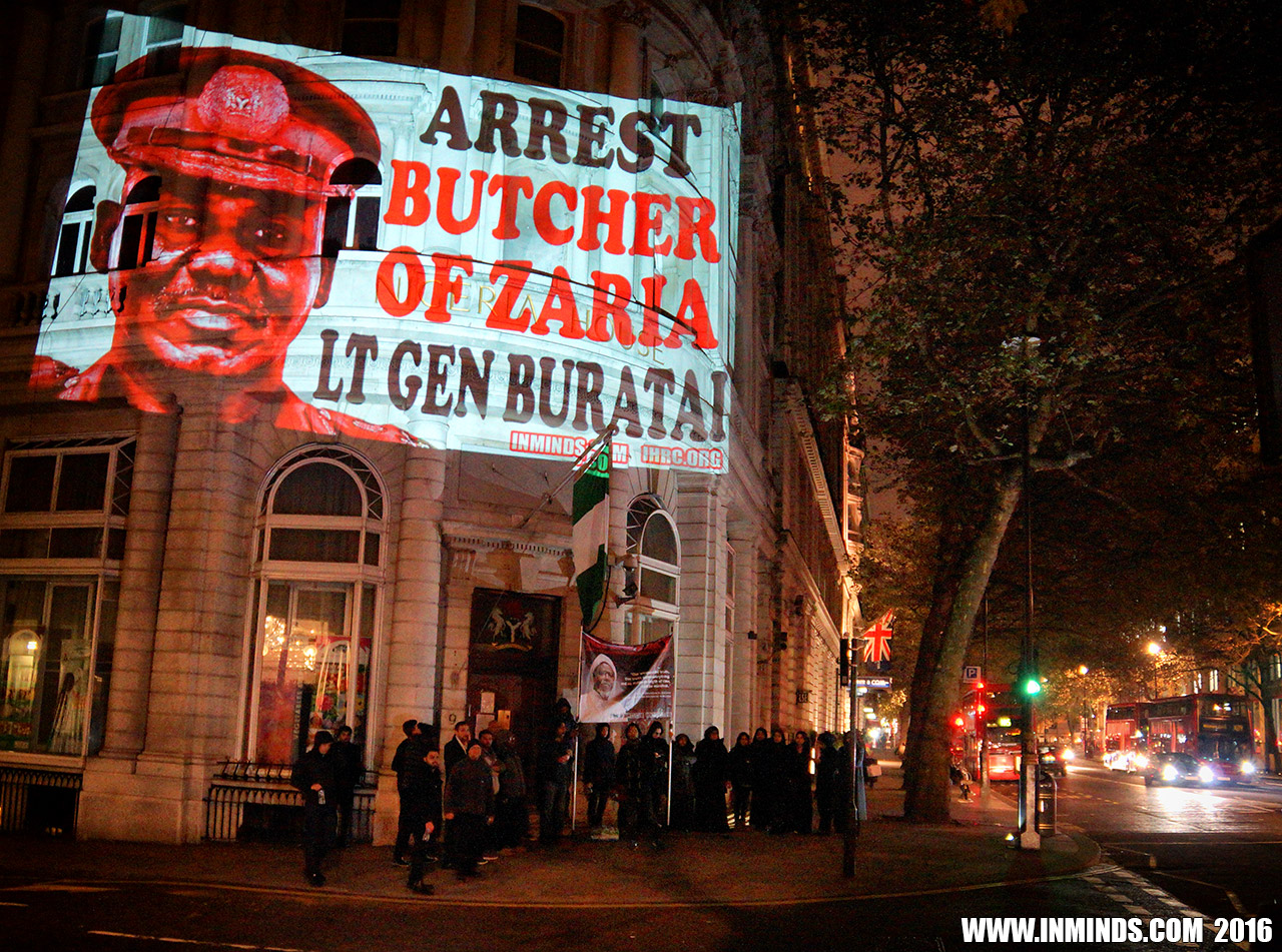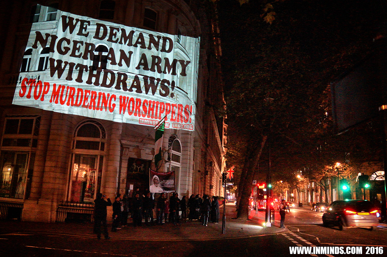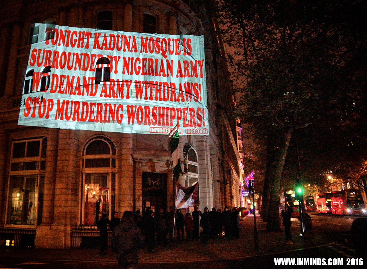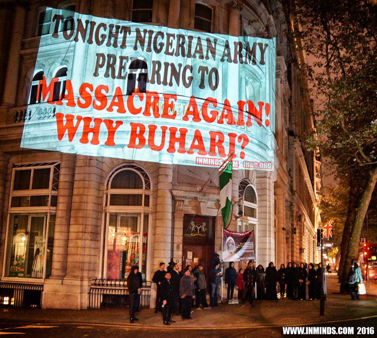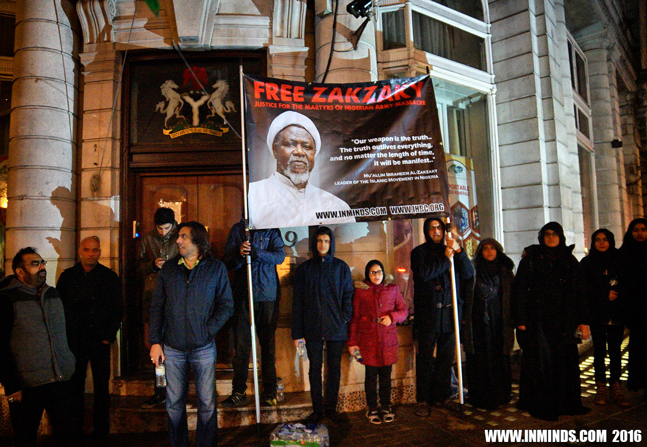 A midnight emergency protest was called on the eve of Ashuru (11th Oct 2016) outside the Nigerian High Commission in London when news was received that the Nigerian army in a convoy of 18 military vehicles had surrounded Kaduna mosque where followers of Sheikh Ibrahim Zakzaky were worshipping. This follows similar moves by the Nigerian army last December which lead to a brutal massacre by the army of over a thousand unarmed worshippers (12-14th Dec 2015). Women were raped and their bodies were mutilated. Mass graves were uncovered after the massacre. That particular massacre is currently under investigation of the International Court of Justice.