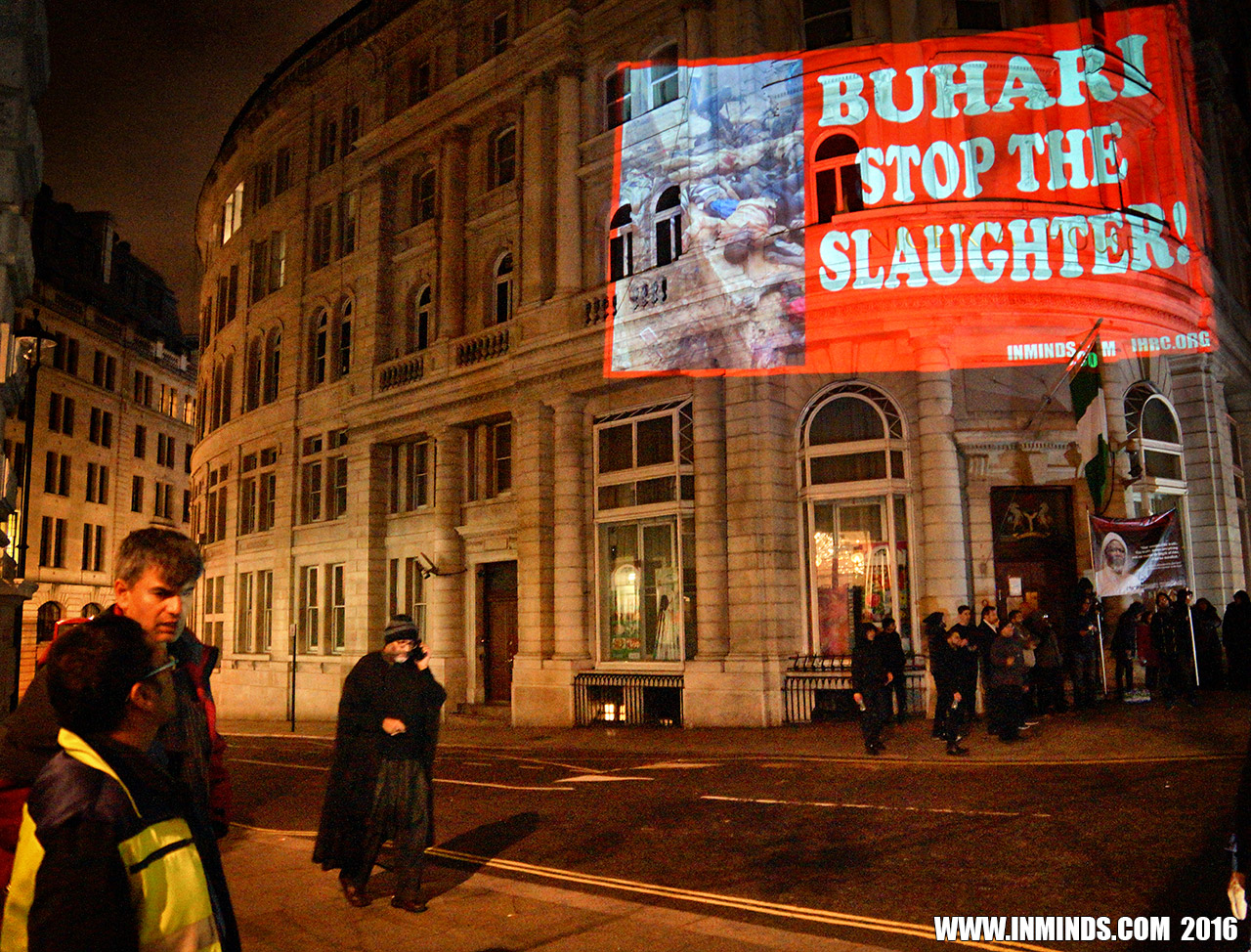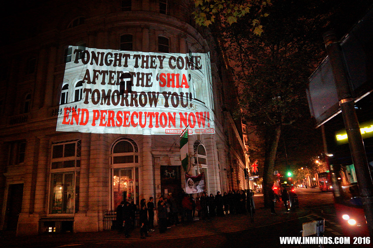 The protest was called by the Islamic Human Rights Commission (IHRC) an supported by Inminds. Messages were projected on the walls of the embassy and the loud chanting ensured the live-in embassy staff could not ignore the protest.