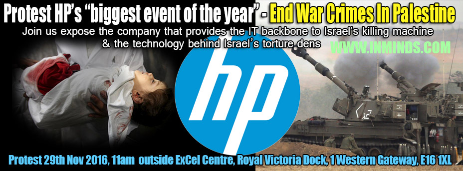 On Tuesday 29th November 2016 Inminds human rights group will protest, for the second year running, HP's "biggest event of the year" - Discover 2016 - which will see 10,000 IT executives from around the globe come to London. Inminds will demand that the american multi-national company Hewlett Packard ( HP / HPE) end its complicity in Israel's crimes against the Palestinian people.