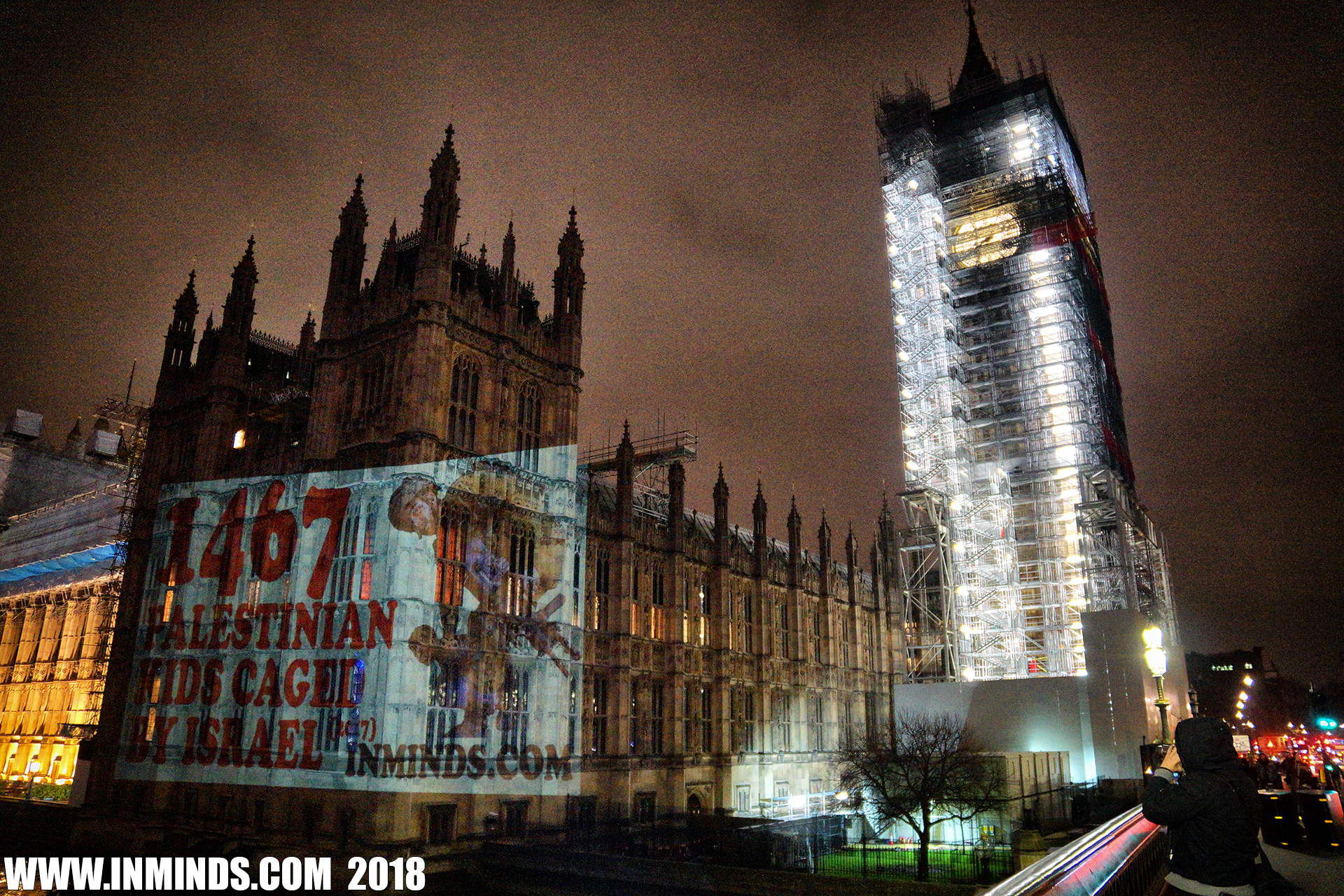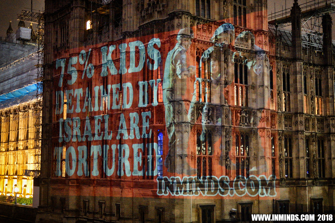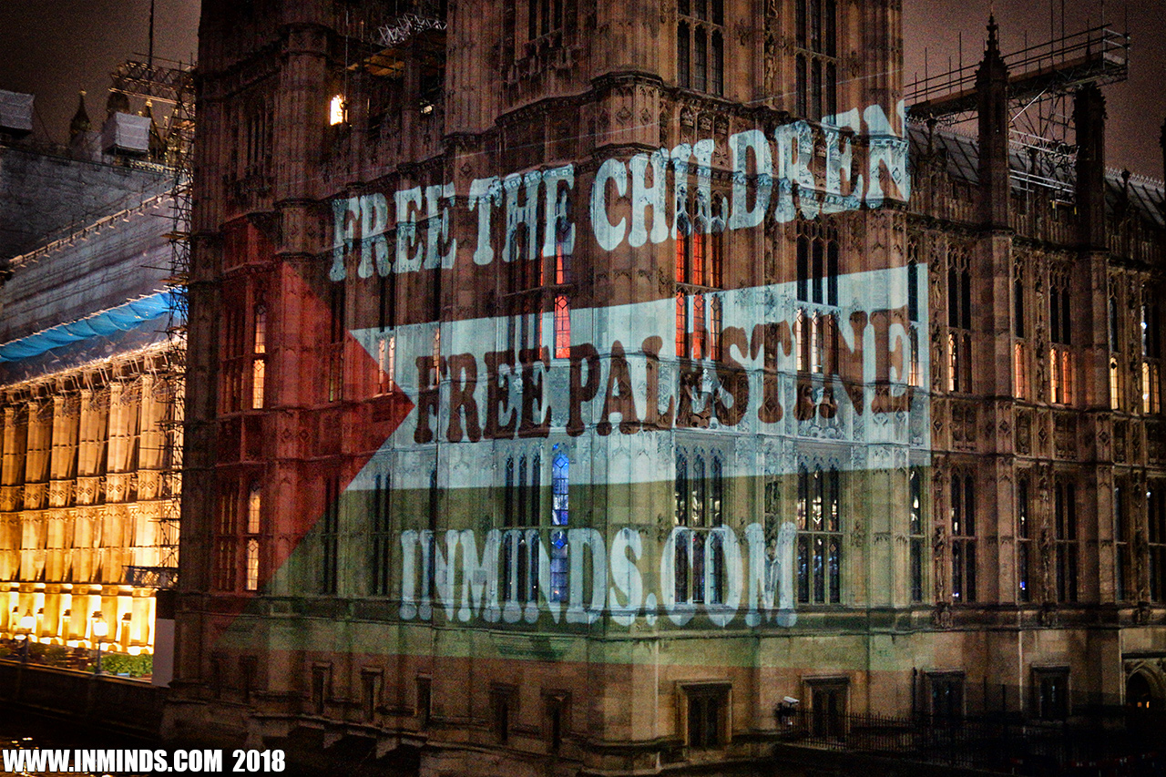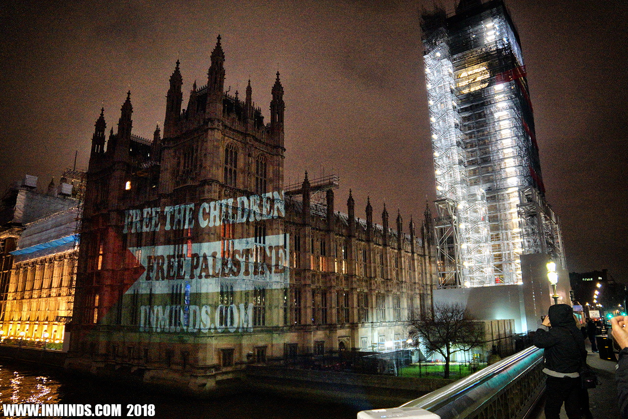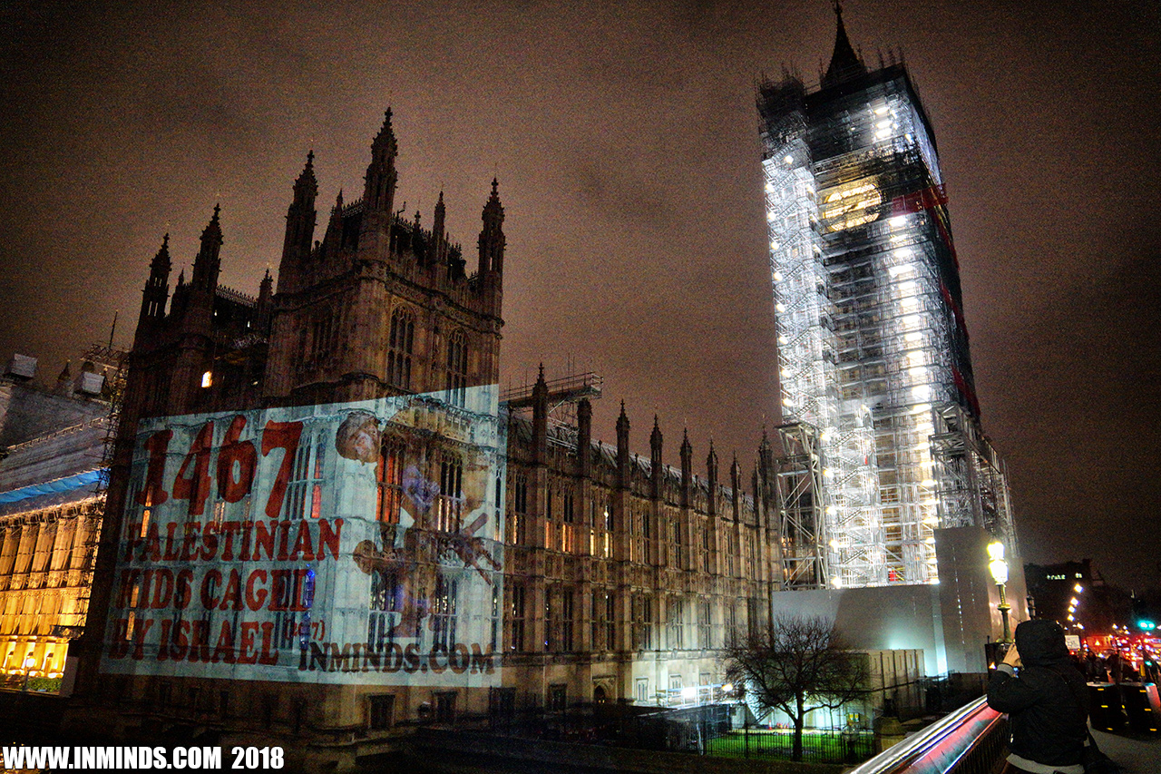 On the evening of Friday 26th January 2018, Inminds human rights group undertook a guerilla projection on the walls of the Palace of Westminster, to highlight the plight of Palestinian child prisoners in Israel dungeons.