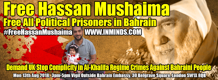 Following an attack by the Bahraini embassy on hunger striker Ali Mushaima, Inminds human rights group will, on Monday 13th August 2018, hold a second vigil outside the Bahraini Embassy in London, in solidarity with Ali Mushaima's hunger strike to save his fathers life. Inminds will demand the unconditional release of Hassan Mushaima and all the other 5000 Bahraini prisoners of conscience languishing in the Al-Khalifa regimes dungeons. The vigil will also demand the British government end its complicity in the Al Khalifa dictatorship's crimes against the Bahraini people.