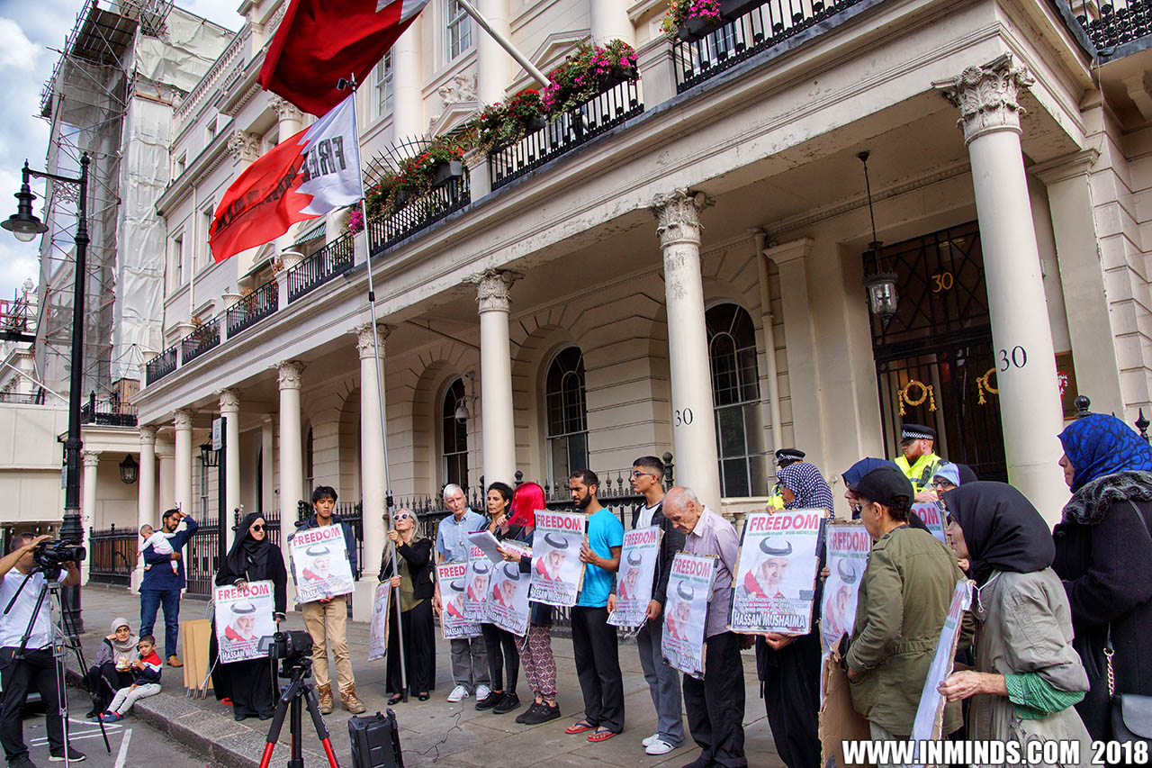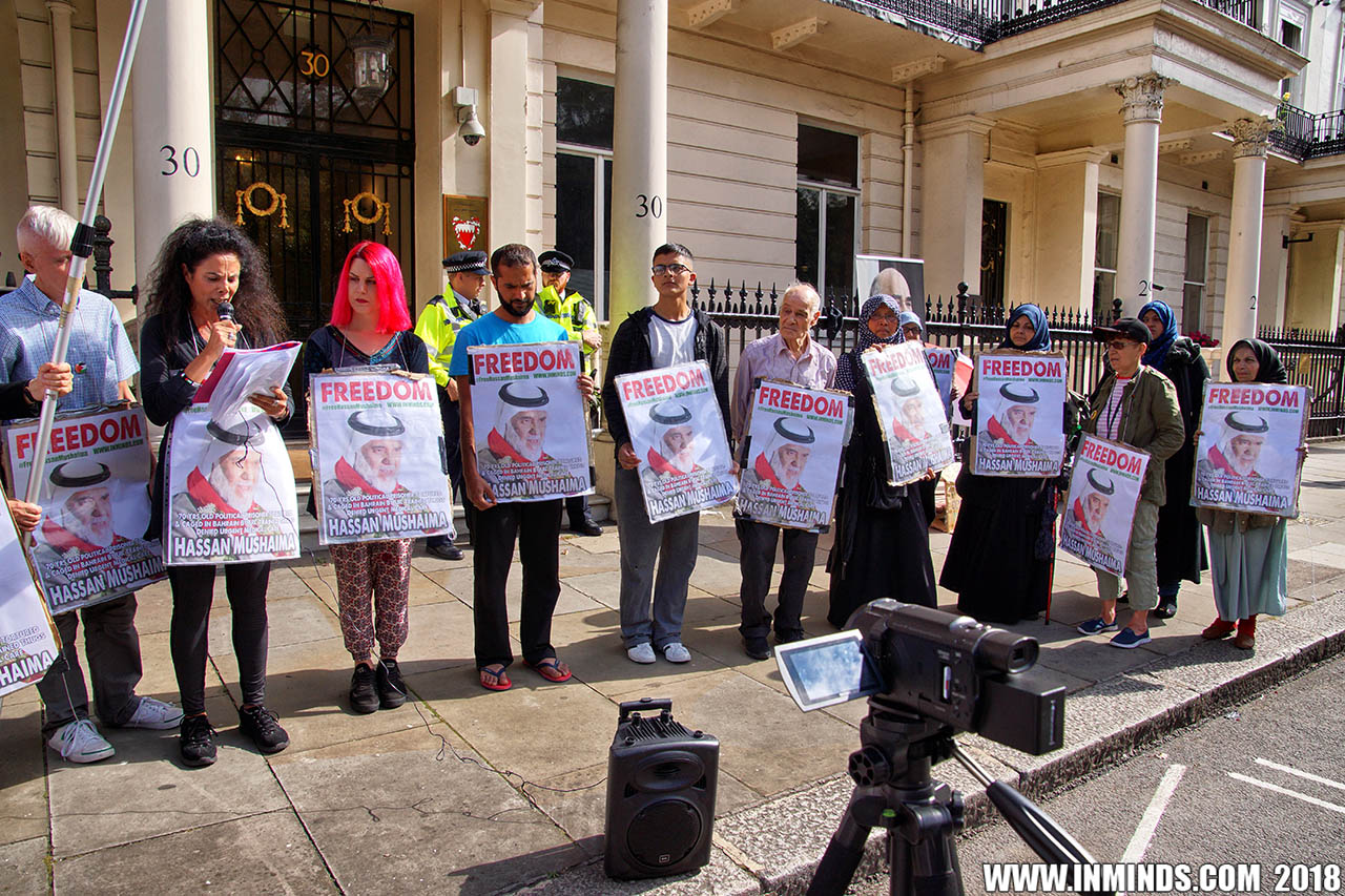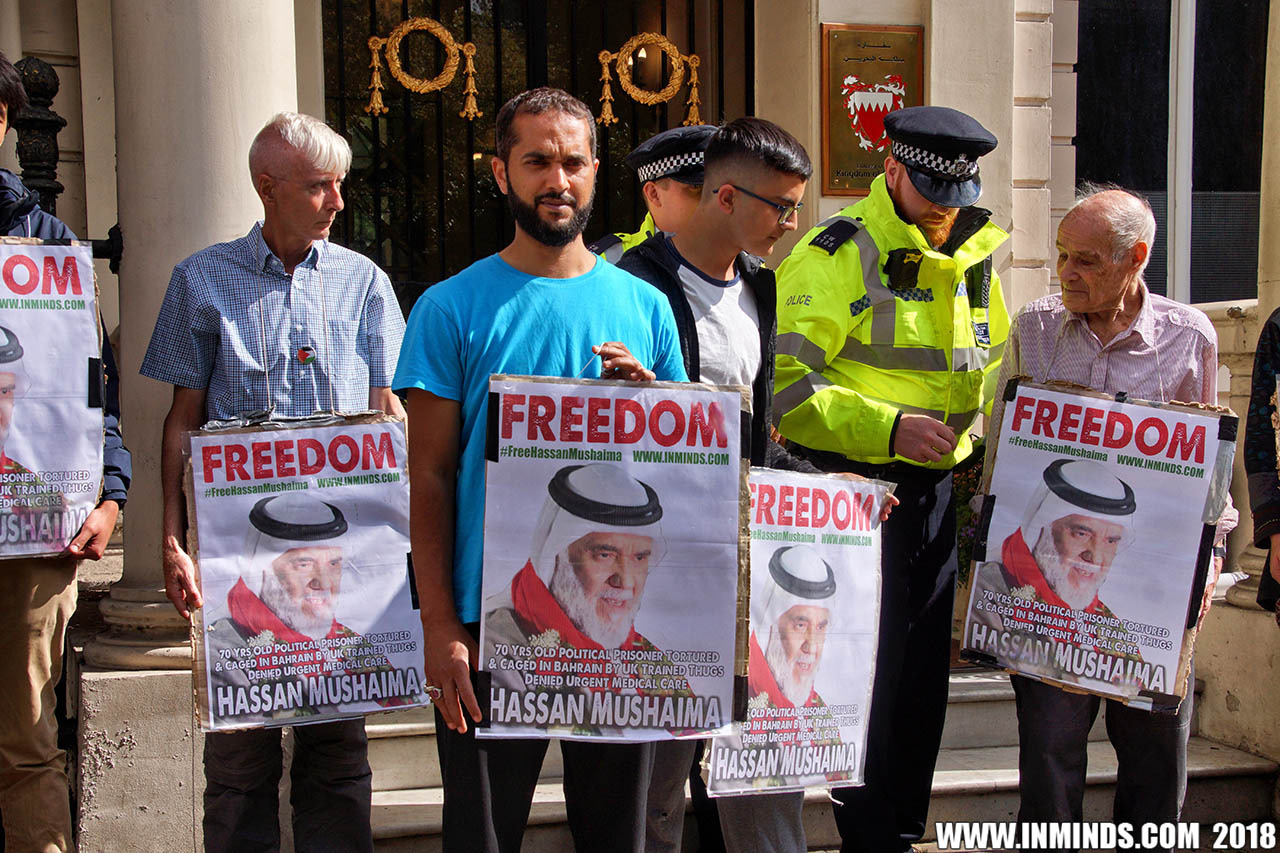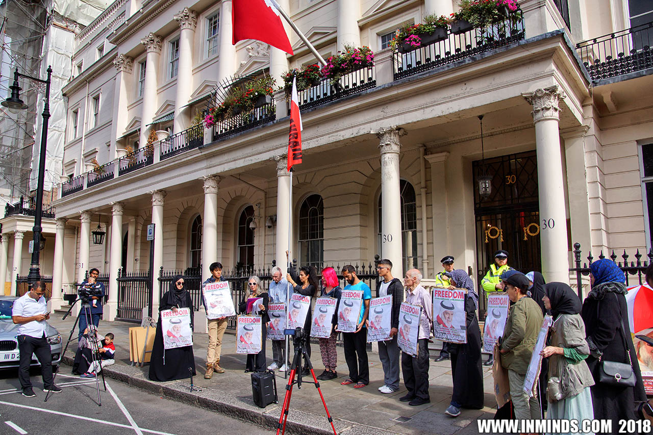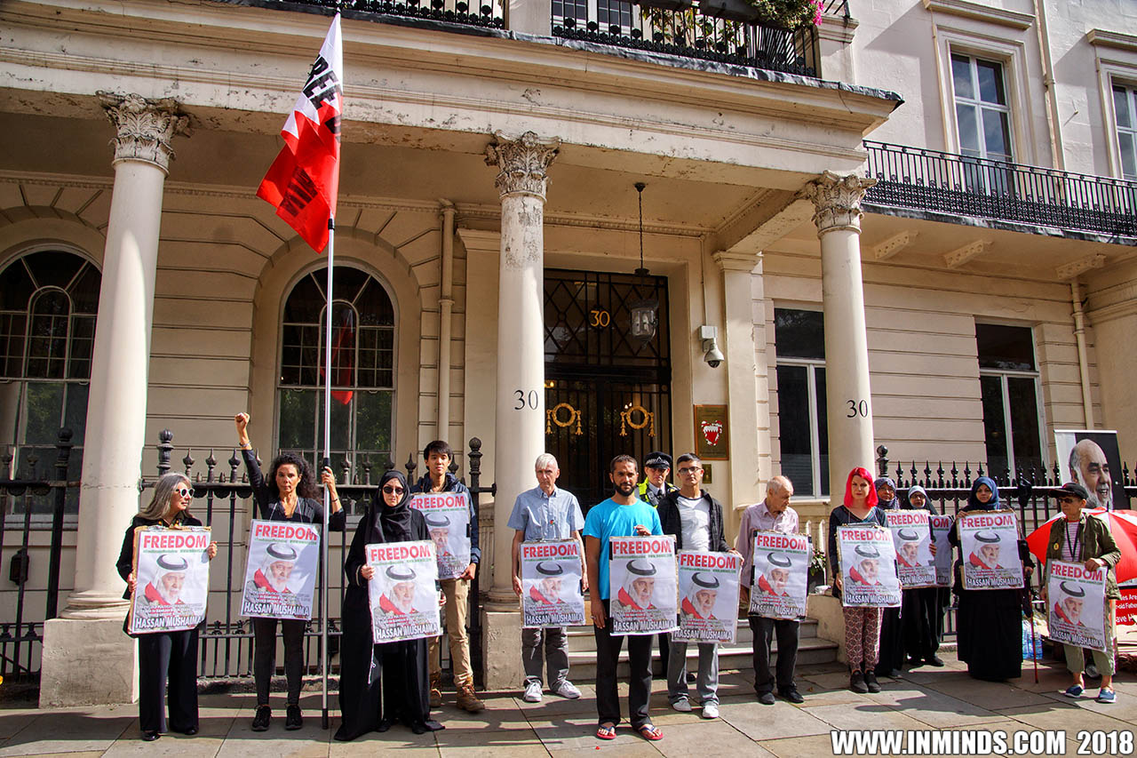 inminds 15 August 2018  Inminds vigil outside bahrain embassy demands MET police arrest perpetrators from embassy who attacked hunger striker Ali Mushaima #FreeHassanMushaima #الأستاذ_حسن_مشيمع